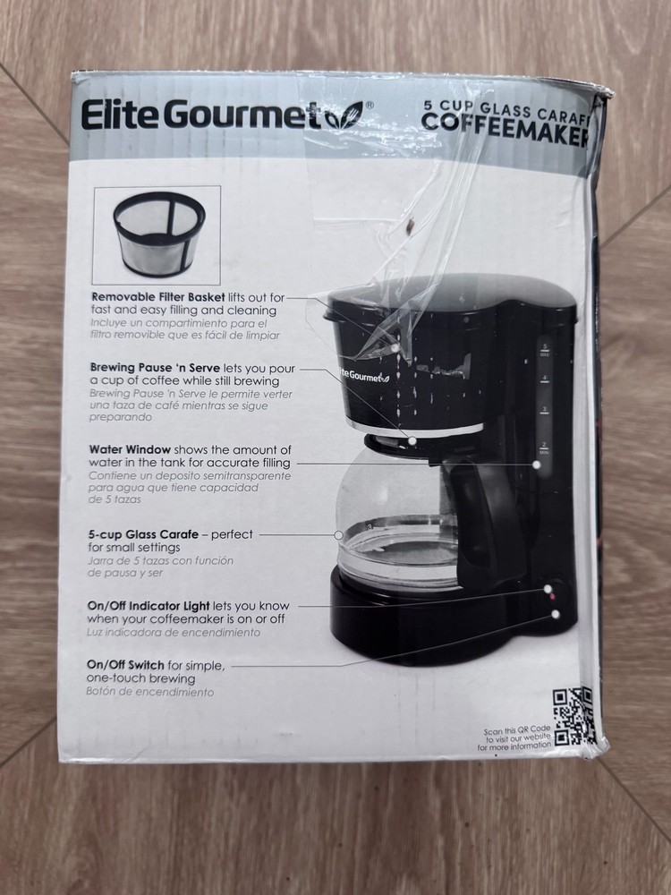 Start your day off right with the Elite Gourmet 5-Cup Coffeemaker. With its compact and sleek design that takes up limited counter space and fits into any nook. It is perfect for small spaces such as office kitchens, dorm rooms or recreational vehicles. Quickly and effortlessly brew your favorite coffee to jump start your day. No need to stop at a local coffee house to buy a cup of joe just to make it through the day. You can also use your own coffee grounds in the included reusable filter. Simply add fresh water for each brew. Cleanup is a cinch, all removable parts and accessories are dishwasher safe. Enjoy a cup of joe on the go with the Elite Gourmet 4-Cup Coffeemaker. SEMI-TRANSPARENT WATER RESERVOIR holds up to 5 cups of water capacity with a level indicator to always ensure you have enough water ready for brewing. 5 CUP GLASS CARAFE for brewing the perfect quantity of hot fresh coffee for an individual or a small group of people. PAUSE 'N SERVE allows a quick sneak of fresh coffee in the middle of brewing of you're running low on time or just need a quick coffee fix. RE-USABLE FILTER in a swing-out basket is better for the environment and reduces additional cost of paper cone filters. SIMPLE ON/OFF SWITCH with a Power Indicator Light, plus no special programming or settings to complicate the coffee maker function. SHIPPING TIME: We try to ship all items within one (1) business day of payment (Excluding Holidays and Weekends), but please take note of handling times. FEEDBACK: We aim to earn positive 5-star feedback for every item! If you're happy with your purchase, please take a minute to leave a positive 5-star feedback. If you have any issues with your purchase, please contact us directly using Ebay's messaging service to allow us the chance to resolve the issue, so that we can earn your positive 5-star feedback! Thank you for looking and please check out the other items in our store. If you have any questions please feel free to ask, and we will answer as quickly as possible, and to the best of our ability. You are welcome to follow our store as we are constantly adding new inventory daily. Have a great day!