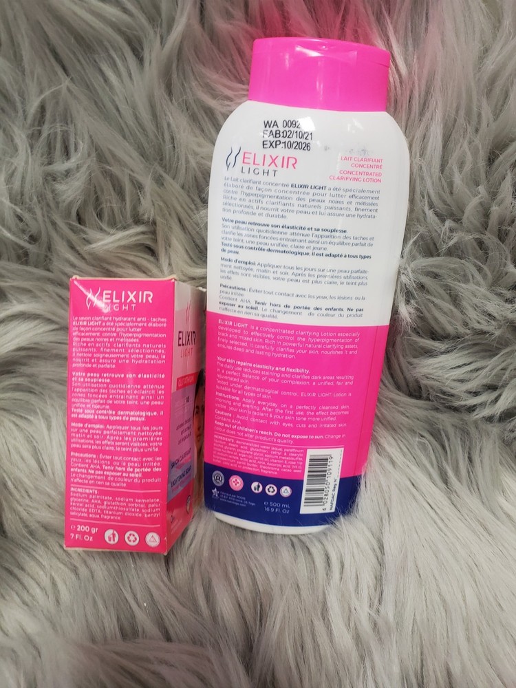The Elixir Light Glutathione Clarifying Body Lotion 500ml and Soap SPF45 is a daily use skincare set designed to target acne scars, dark spots, and other skin discolorations. With a broad spectrum UVA protection and hydrating formula containing argan oil and glycerin, this product is suitable for all skin types. The set includes both morning and night treatments, featuring ingredients like stearic acid and vitamins to nourish and improve skin texture. Made in Côte d'Ivoire, this product boasts a floral scent and long expiry date, making it a reliable option for achieving a clearer and brighter complexion.