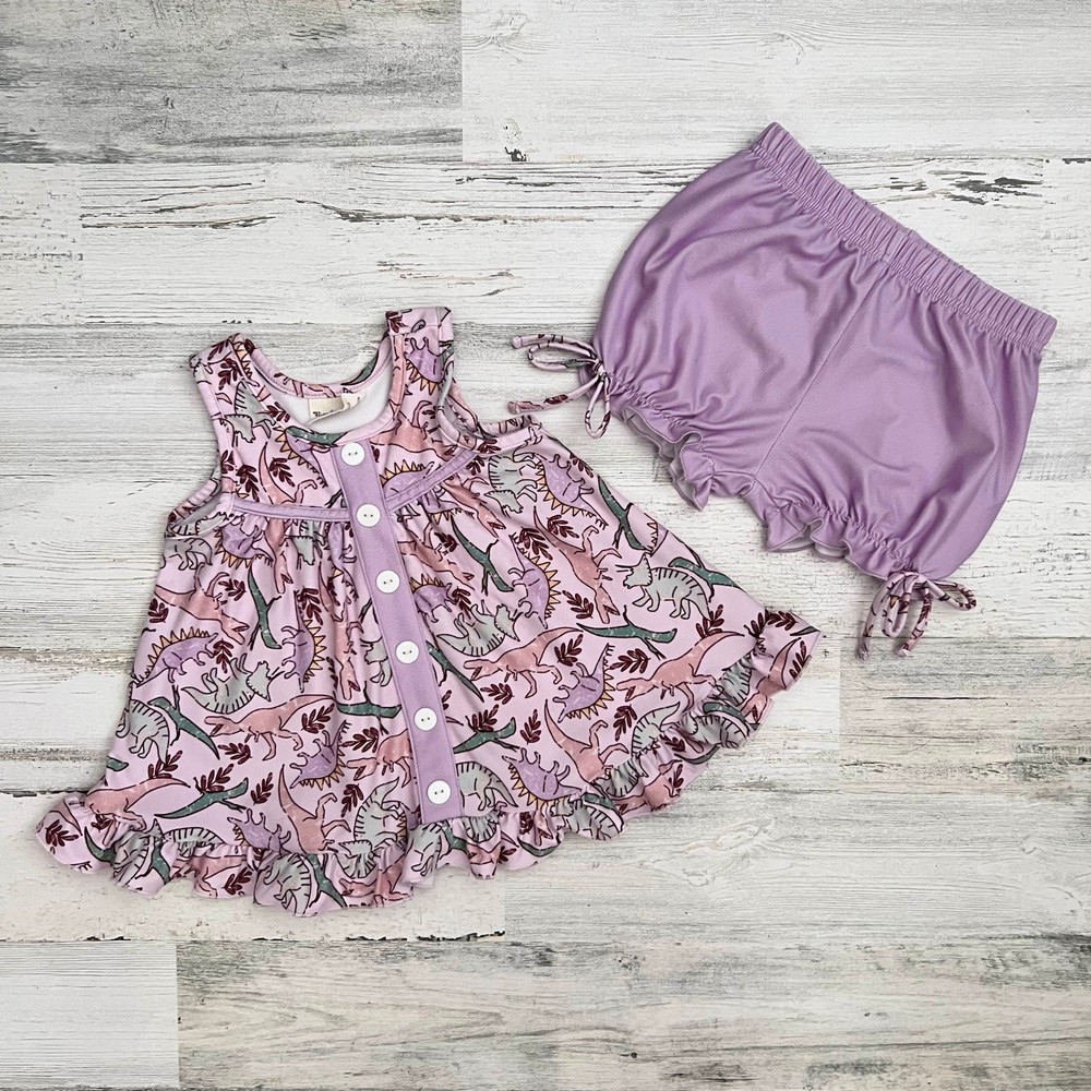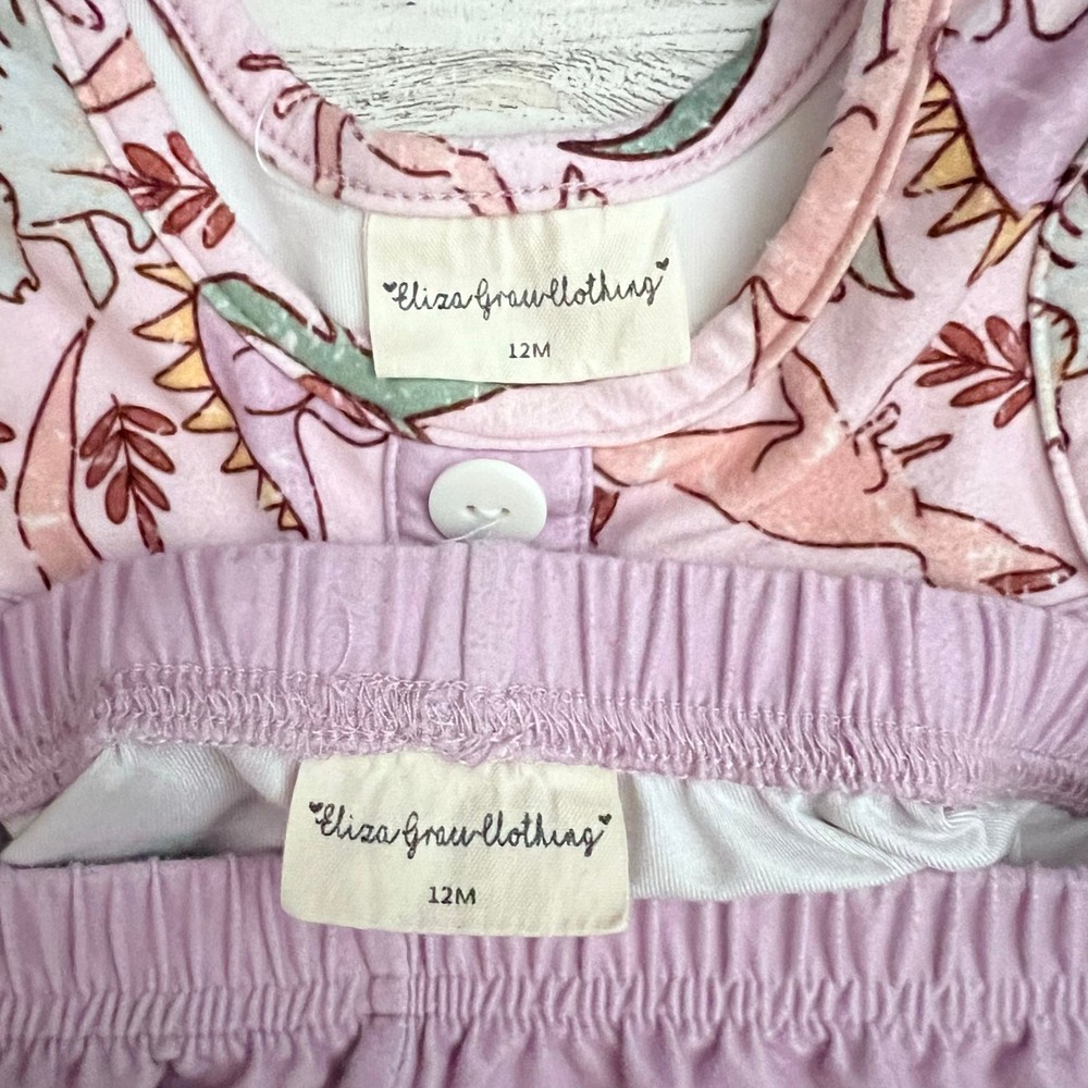 Sweet and playful Eliza Grace two-piece outfit featuring a dinosaur print tunic top with ruffle trim and coordinating bloomers. Lightweight and comfortable for everyday wear, playdates, or themed occasions. Styling suggestion: Wear as a matching set with sandals for warm days or layer the tunic over leggings as temperatures cool. Details: • Brand: Eliza Grace • Size: 12 Months • Color: Pink, lilac, aqua, green • Material: 95% Polyester, 5% Spandex • Style: Two-piece tunic and bloomer set • Features: Dinosaur print, ruffle hem, decorative front buttons, matching bloomers • Neckline: Round • Sleeve: Sleeveless • Closure: Pullover top • Fit: Regular • Pattern: Dinosaur / novelty print • Occasion: Playwear, casual, themed events • Season: Spring, Summer • Condition: Very good used condition Keywords: dinosaur, playful, toddler, summer, novelty, casual, outfit, girls Ships fast from a U.S. seller. Clean, smoke-free, pet-friendly home. Bundle to save!