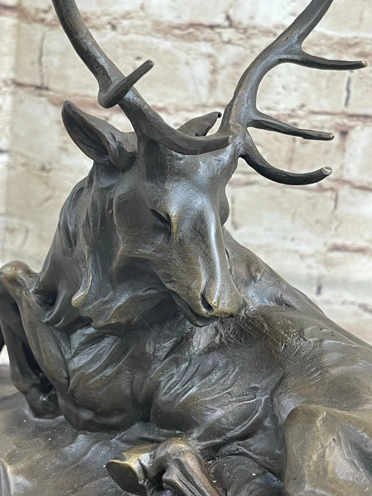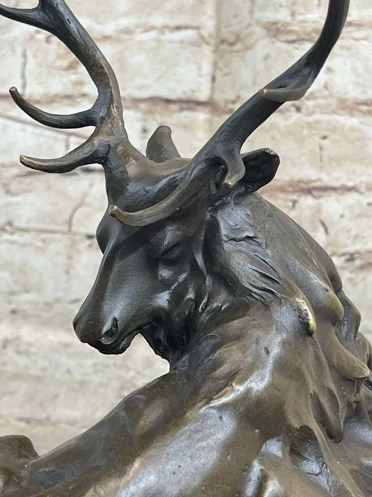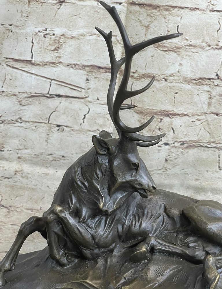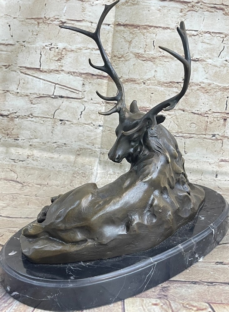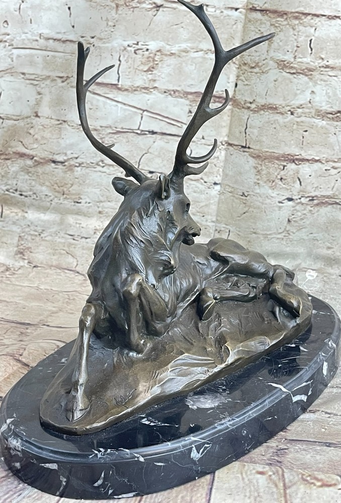 Condition : This sculpture is in perfect condition. Bronze Dimensions with Marble Base: Height 11.5" X Width 12" Marble Dimensions: Diameter 12" Height without base:10.5" Weight:15 LBS Inventory:37K2305373 Resting peacefully in a cool grassy enclave, this majestic bronze sculpture captures the essence of an aged elk seeking respite from the summer heat. With his long, shaggy coat and weathered appearance, the elk bears the marks of a seasoned wanderer who has traversed the land for countless years, intimately familiar with the safe havens of his forest domain. This poignant artwork portrays the old elk in a moment of repose, while hinting at the challenges he faces in his twilight years. His once agile movements are now limited by the passage of time, but his presence remains captivating. The commanding antlers, large and striking, serve as a focal point that cannot be ignored. Crafted with meticulous attention to detail, this intricate bronze sculpture is the result of painstaking craftsmanship and countless hours of dedication. Employing the esteemed "Lost Wax Method," the artist Milo has achieved a stunning brown patina that accentuates the sculpture's beauty. Expertly mounted on a beveled marble base, this piece stands as a testament to the artistic skill and creativity that went into its creation. It bears the artist's signature, a mark of its authenticity and the artist's personal touch. Bronze Marble Statue Elk Hunter Buck Stag trophy Sculpture Art Deco Figurine NR Video will open in a new window Using the eBay App? Paste link into a browser window: [isdntekvideo]