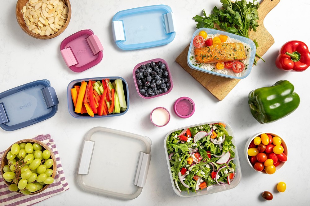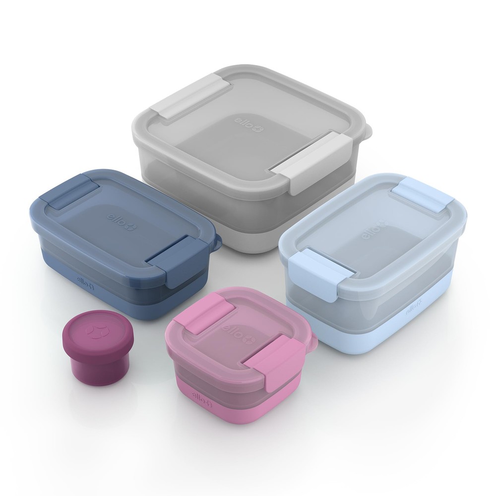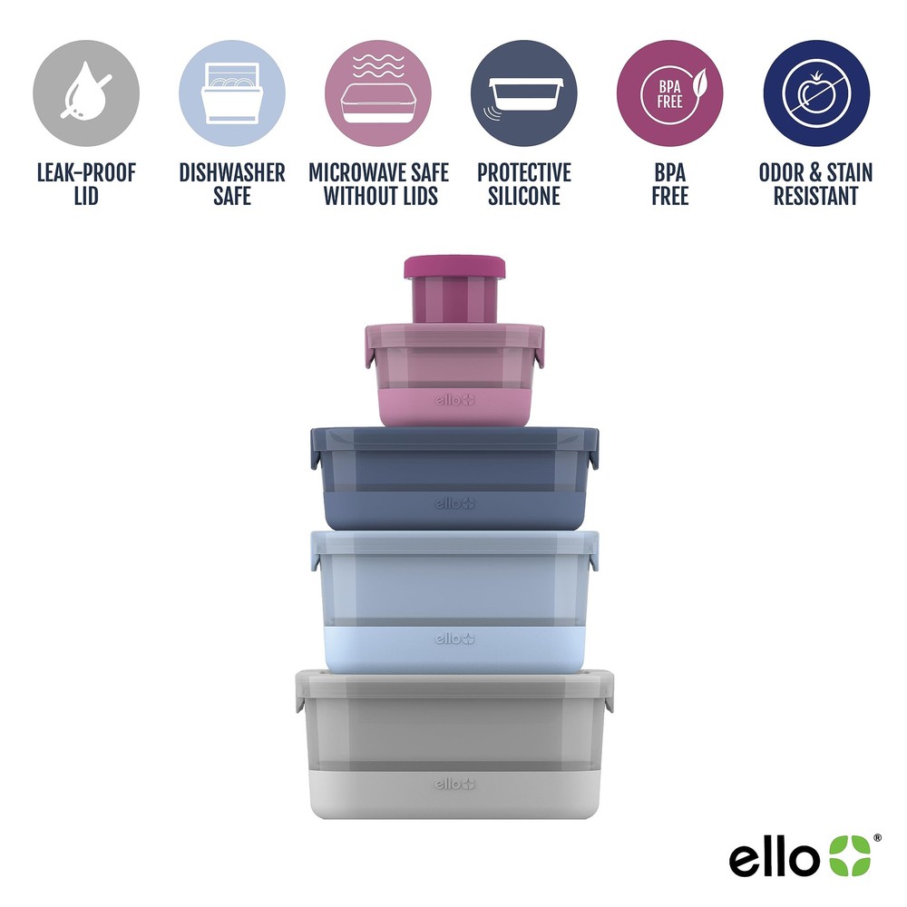 The Ello plastic food storage container set brings premium design details into plastic with bright, statement-making colors and matching lids. The plastic meal prep set includes ncludes (1) dressing container, (1) 1.5 cup, (1) 3 cup, (1) 4.5 cup, and (1) 9 cup food storage containers with silicone protective boots and 5 matching leak-proof lids. The variety of colors allow you to coordinate, show-off, and brighten up your meal prep routine or leftovers. The containers and lids are BPA free, dishwasher safe. The containers are also microwave safe, without the lid, making reheating leftovers at home or lunch at the office a breeze. No need to remove the silicone sleeve! Do not use the product to cook or boil. Excessive reheating time in the microwave may damage the container. Sterilization and exposure to high temperatures can lead to microplastic release in all plastic food storage. 5-PACK MEAL PREP CONTAINERS: Ello Plastic 10pc Meal Prep Food Storage Containers includes (5) 3.7 cup BPA free plastic food containers and five plastic locking lids to keep food fresh for longer. QUALITY DESIGN: Premium plastic containers are made to resist stains and odors. Forget about scrubbing to get rid of stains and smells. LEAK-PROOF AND AIRTIGHT: Snap-on airtight lids lock to ensure no spills and keep food fresh longer. Lids are BPA-Free and freezer and top rack dishwasher safe. EASY TO USE: All parts top rack dishwasher, freezer safe, and microwave safe without lid. Do not cook or boil. High temperatures can damage the container and lead to microplastic release. See care and use for detailed instructions. MEALPREP IN STYLE: Removable extra thick silicone protection boot comes in variety of colors to make meal prepping fun. It also protects from chips and breaks and dishwasher and microwave safe.
