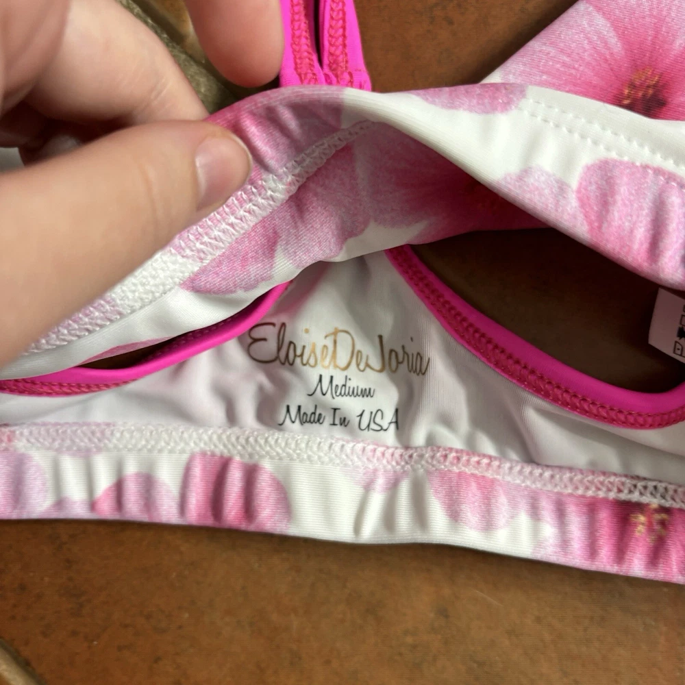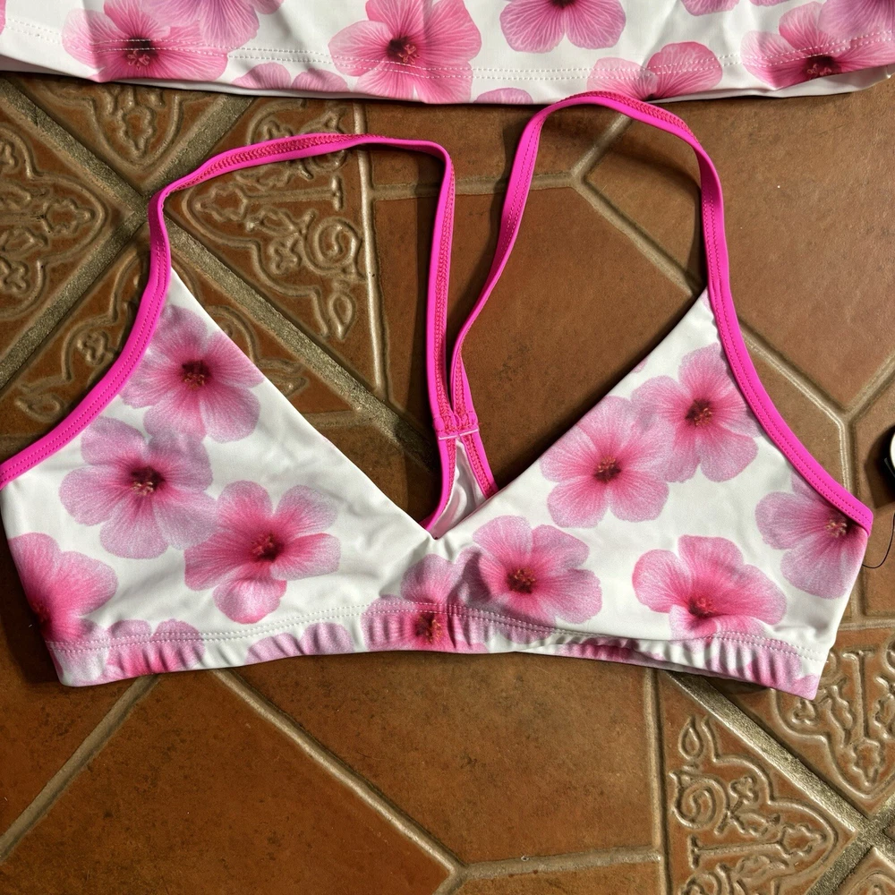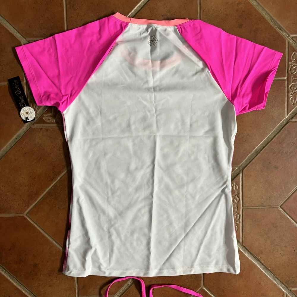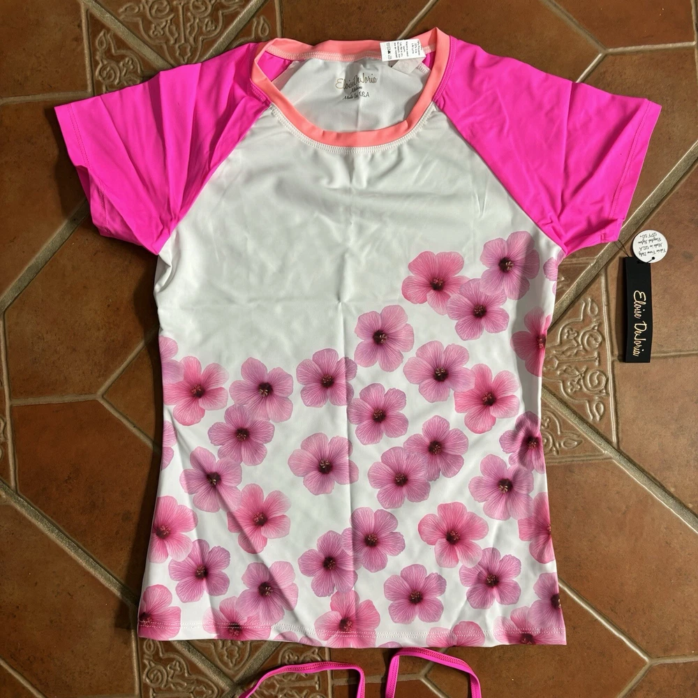 Eloise DeJoria White Pink Floral Sports Bra and Workout Top Set Women Size M Brand new with hanging tags intact. No tears/holes or stains. Brand label says fits a women’s size medium. Includes 1 white and pink floral racerback workout sports bra with pink trim, and a white workout short sleeve top with pink floral at the base, coral trim, and pink sleeves. I have other Eloise DeJoria athletic wear in this size, check my page for other options and reach out to bundle. Pink Floral Set #1
