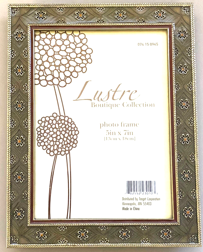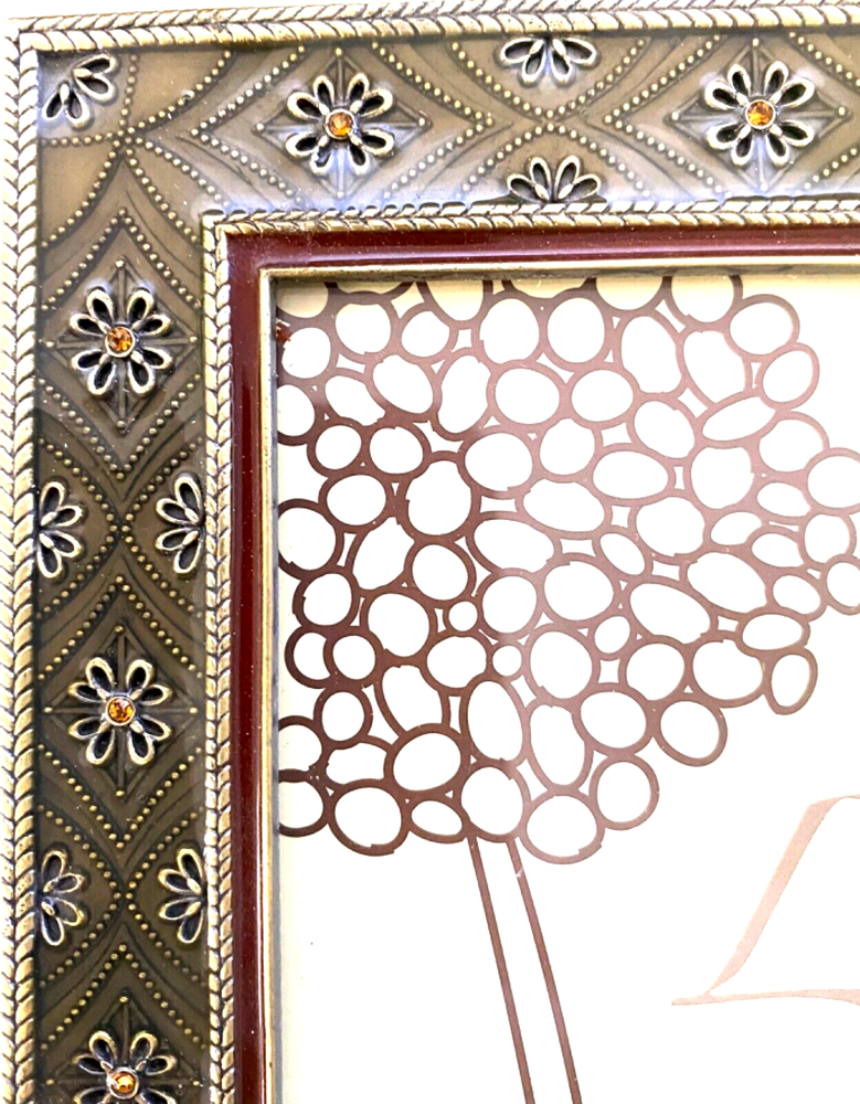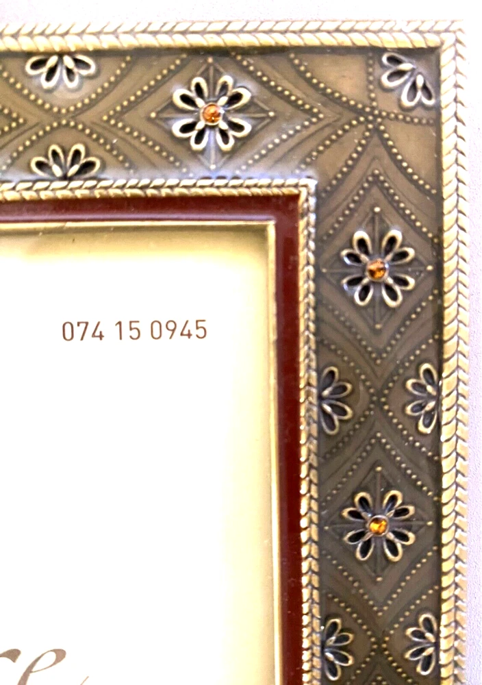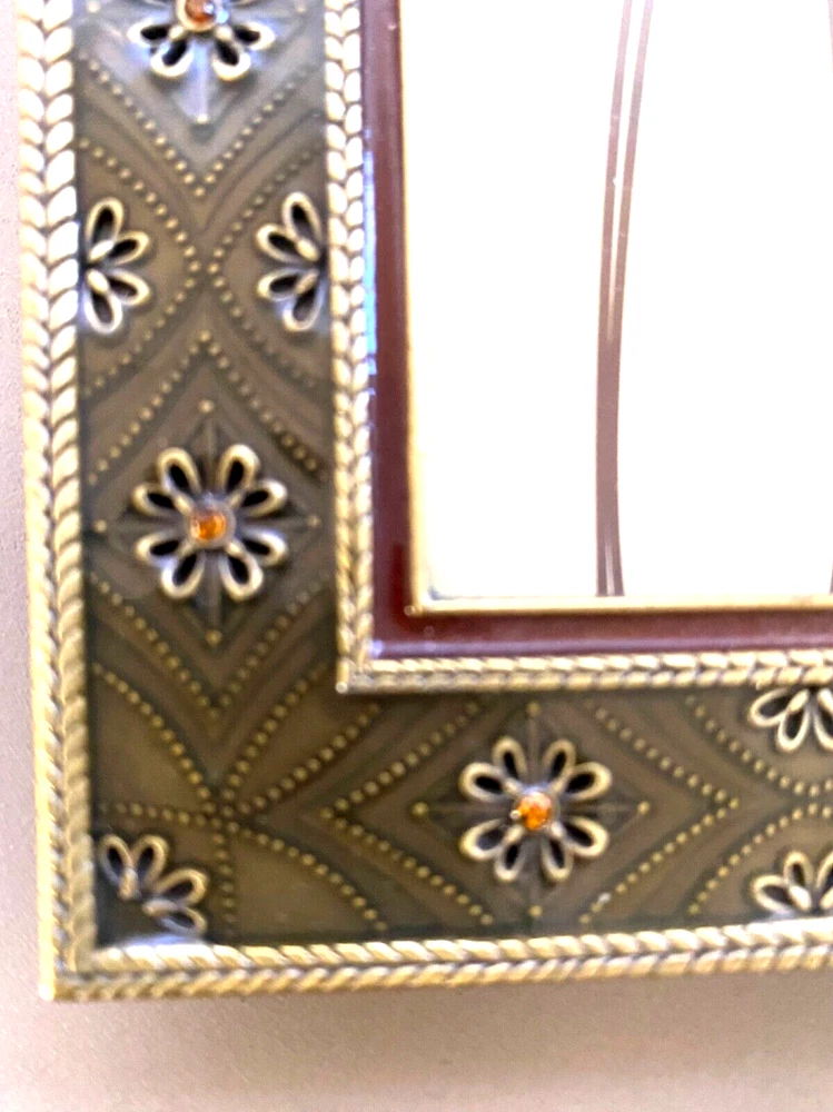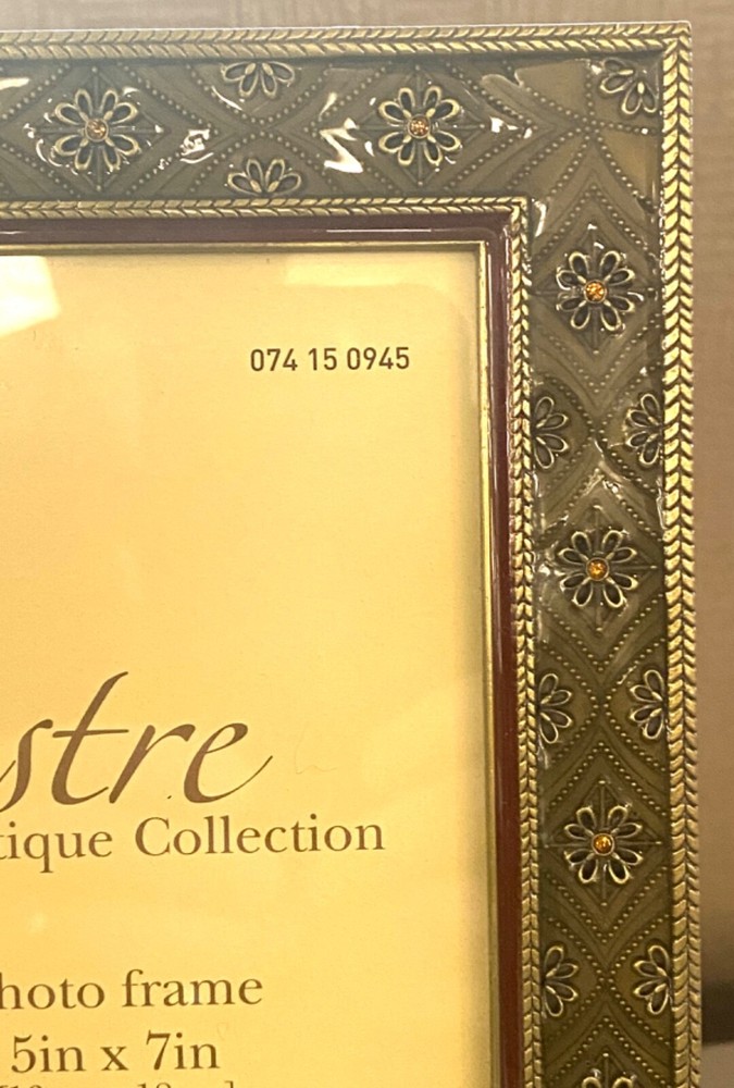 gtin13: Does not apply UPC: Does not apply Item Height (Interior): 7 inches Item Width (Interior): 5 inches Brand: Elsa L. Inc. Size: 6.5 x 8.5 inches Item Length: 4 inches Photo Capacity: 1 Photo Insertion Type: Rear-Loading Color: Brass, Deep Sage, Amber Pattern: Floral Item Height: 8.5 inches Orientation: Portrait or Landscape Material: Metal, Enamel, Crystals Mounting: Free Standing or Wall Mounting Theme: Floral Suitable for Photo Size: 5 x 7 in Type: Photo Frame Style: Modern Shape: Rectangle Finish: Glossy Item Width: 6.5 inches Glass Type: Clear Glass MPN: None Features: Glitter, Brass Embossed Flowers w/Amber Crystals, Raised Metal Floral Pattern Occasion: All Occasions