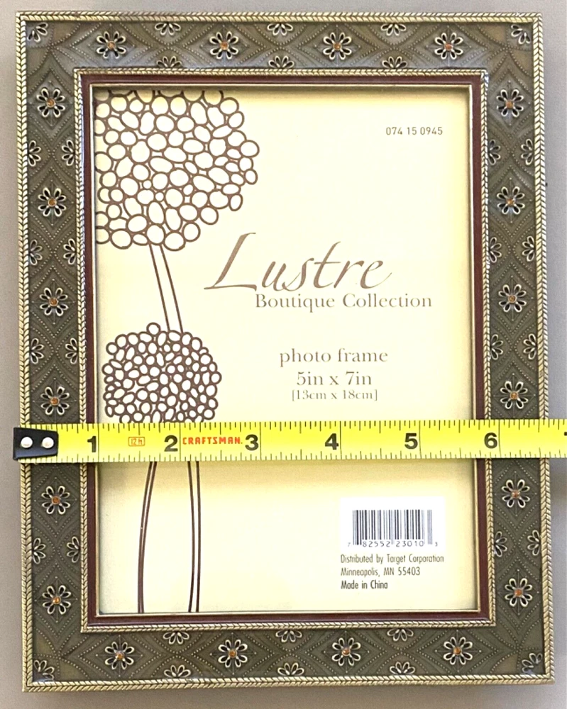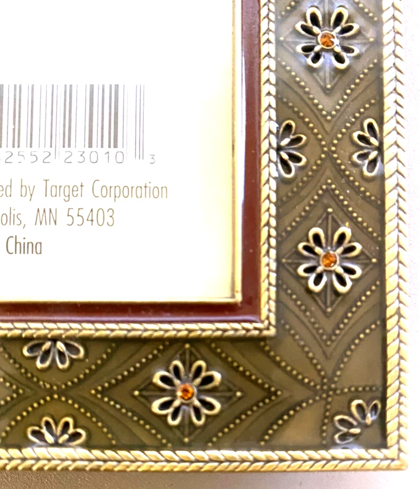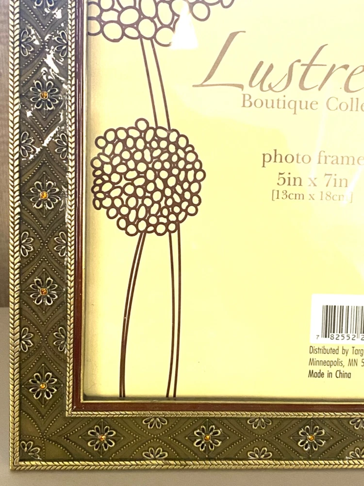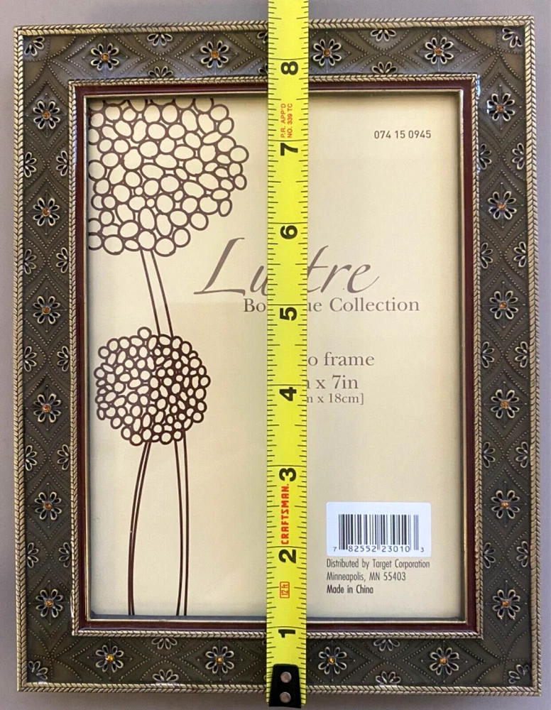 gtin13: Does not apply UPC: Does not apply Item Height (Interior): 7 inches Item Width (Interior): 5 inches Brand: Elsa L. Inc. Size: 6.5 x 8.5 inches Item Length: 4 inches Photo Capacity: 1 Photo Insertion Type: Rear-Loading Color: Brass, Deep Sage, Amber Pattern: Floral Item Height: 8.5 inches Orientation: Portrait or Landscape Material: Metal, Enamel, Crystals Mounting: Free Standing or Wall Mounting Theme: Floral Suitable for Photo Size: 5 x 7 in Type: Photo Frame Style: Modern Shape: Rectangle Finish: Glossy Item Width: 6.5 inches Glass Type: Clear Glass MPN: None Features: Glitter, Brass Embossed Flowers w/Amber Crystals, Raised Metal Floral Pattern Occasion: All Occasions