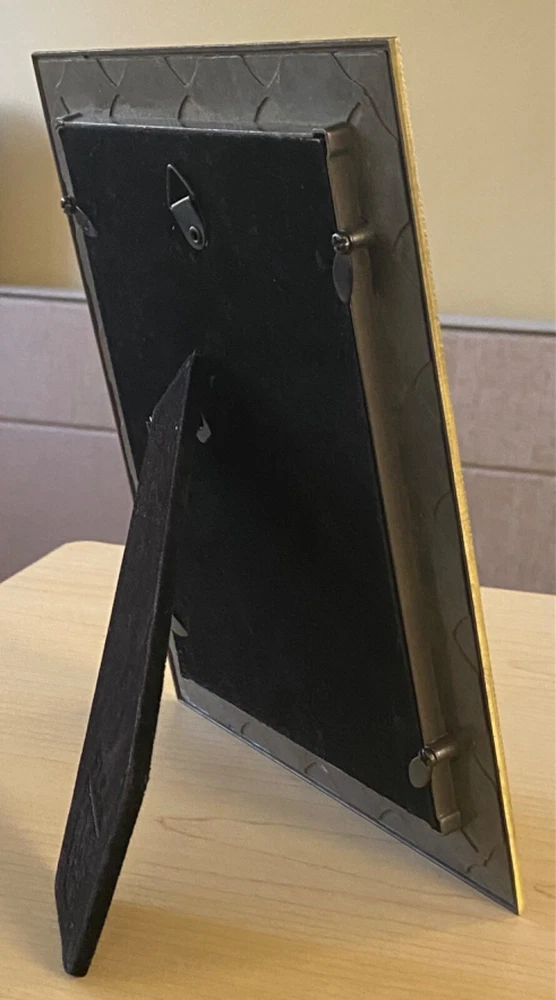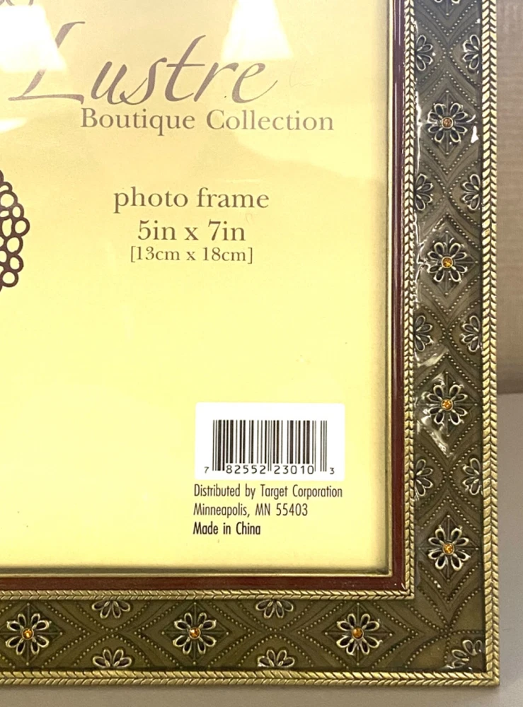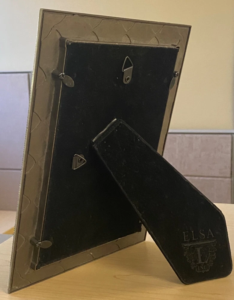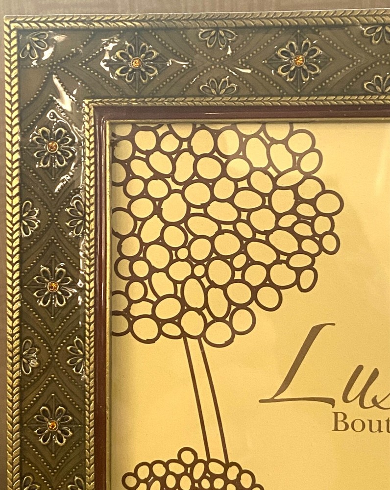 This beautiful photo frame from Elsa L. Inc. is the perfect addition to any home decor. Its rectangular shape and glossy finish make it a modern yet versatile piece. The frame features a raised brass metal embossed floral pattern and amber crystals, adding a touch of elegance to any room.With a photo capacity of one 5 x 7 inch photo, this frame is suitable for all occasions and can be oriented either portrait or landscape. It is made of metal, enamel, and crystals, and comes in a unit quantity of one. The frame can be free-standing or wall-mounted, and the clear glass protects your photo from dust and scratches. Add this stunning piece to your collection today! As this frame is used, it may contain minor imperfections, please check photos carefully.