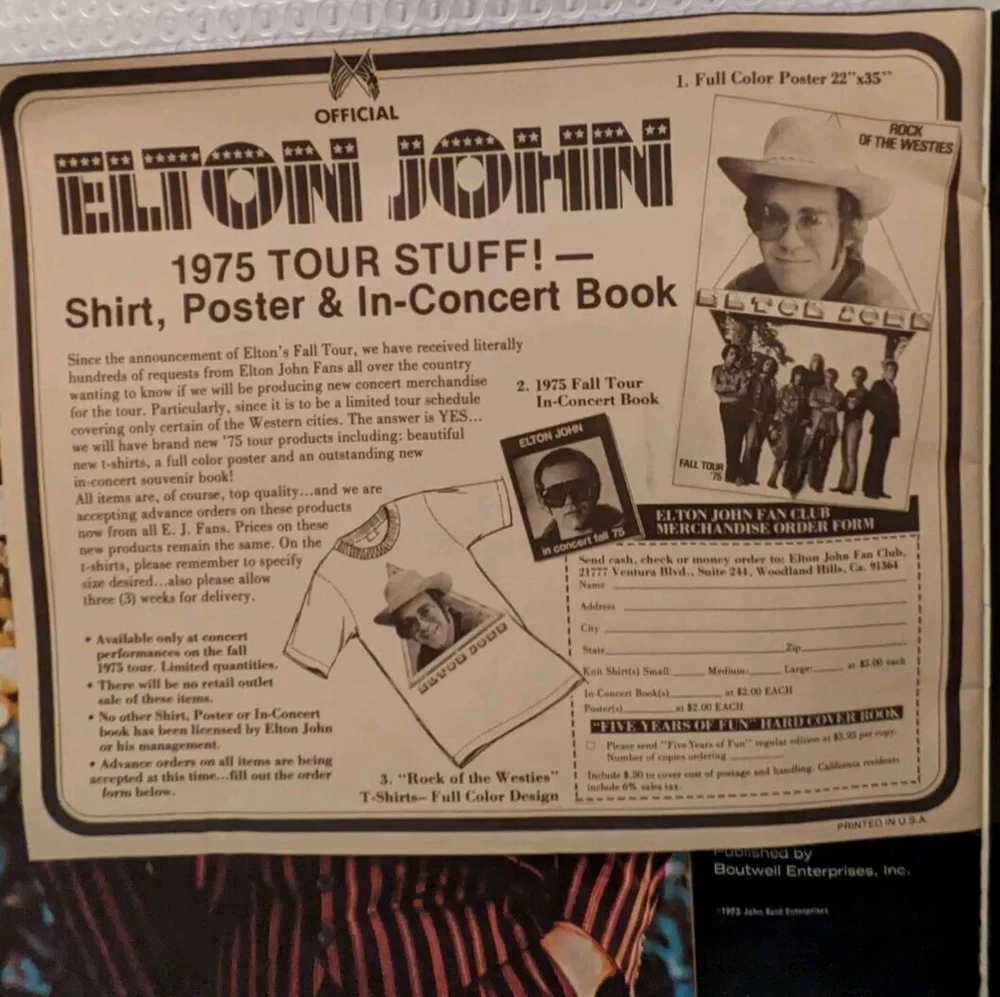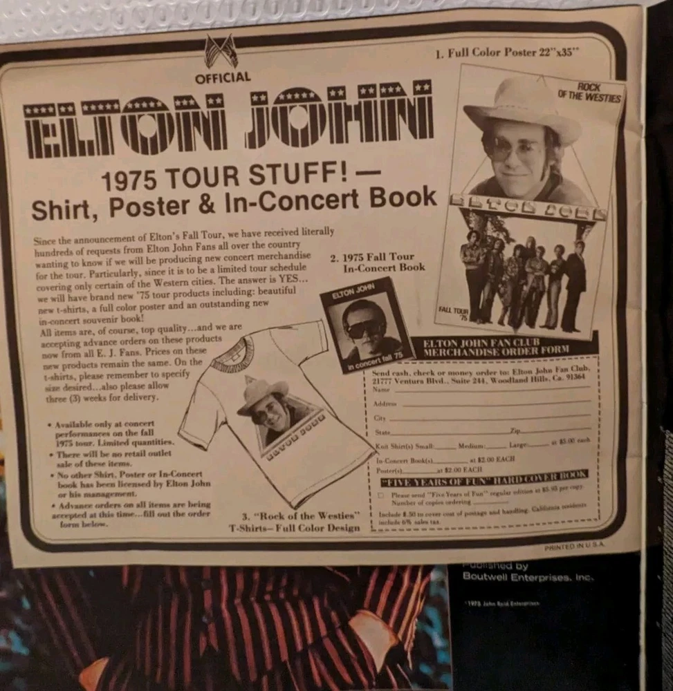 This is a rare and collectible Elton John concert tour program from 1975, featuring the iconic album "Rock of the Westies". The program includes original inserts and is a must-have for any music memorabilia enthusiast. The artist's electrifying performances and unique style have made him a legendary figure in the music industry, and this program captures a moment in history that will be cherished by fans for years to come. Don't miss out on the opportunity to own a piece of music history.