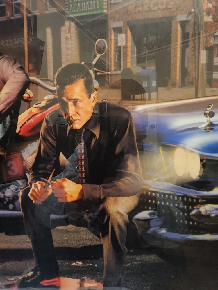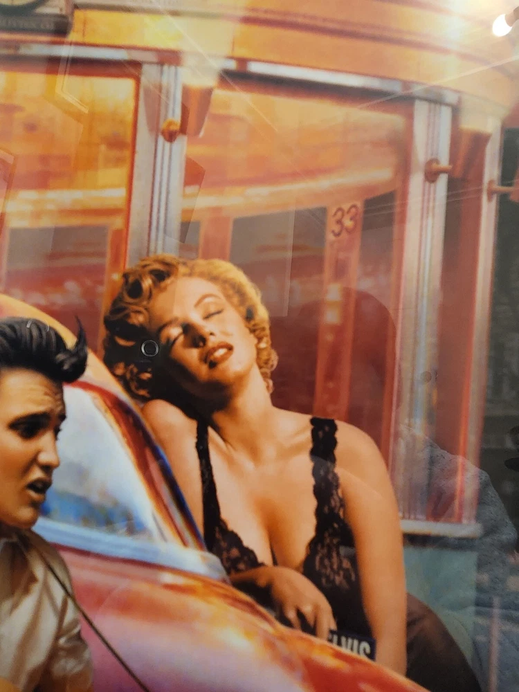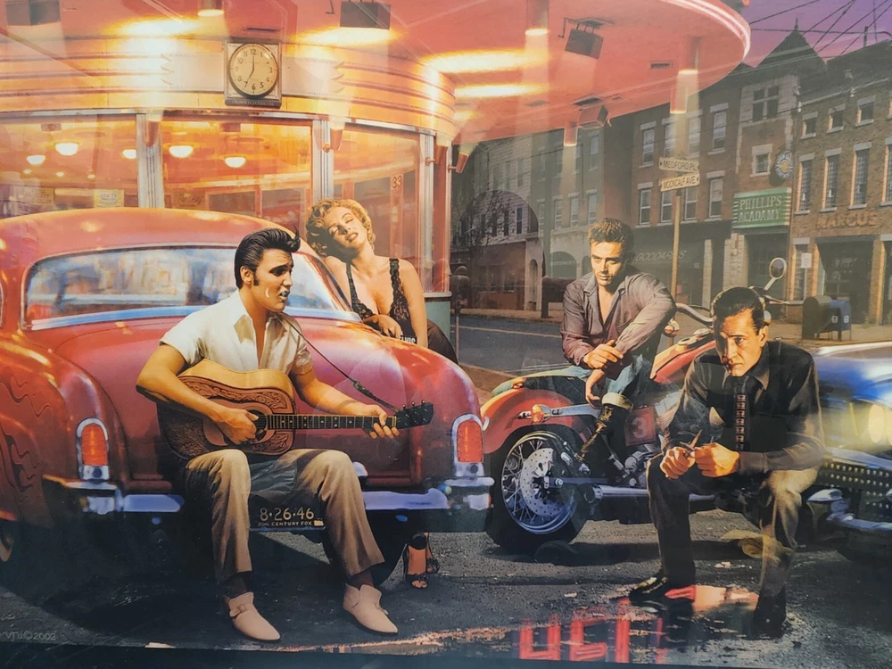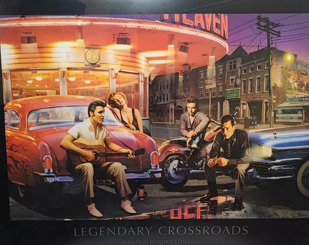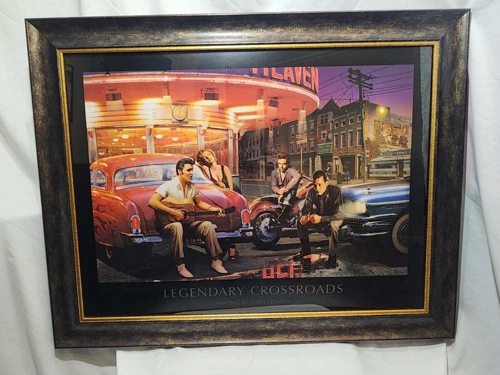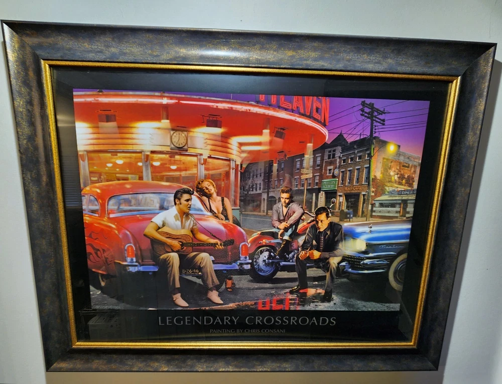 Iconic "Legendary Crossroads" by Chris Consani. Framed, Near Perfect Condition. This is a beautiful piece. The image features Elvis Presley, James Dean, Marilyn Monroe and Humphrey Bogart. Frame dimensions are as follows: 37 ×29 ×2. Inside art dimensions are 29 x 18.