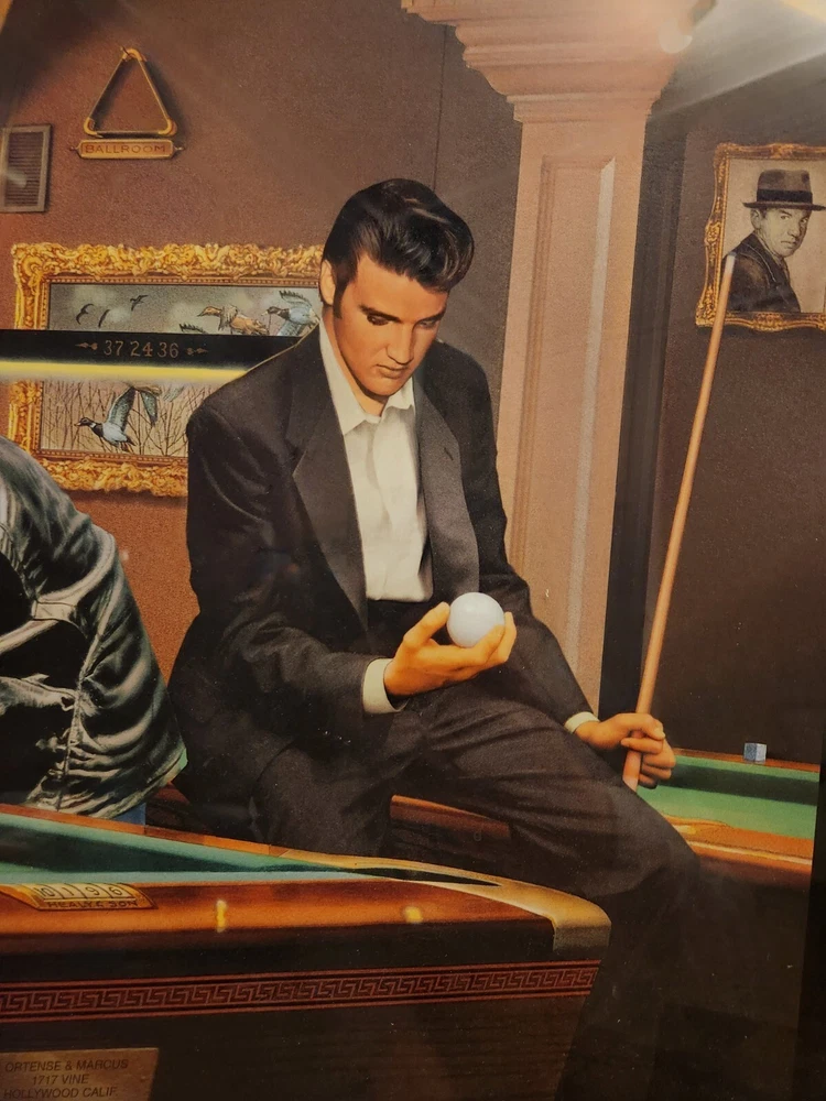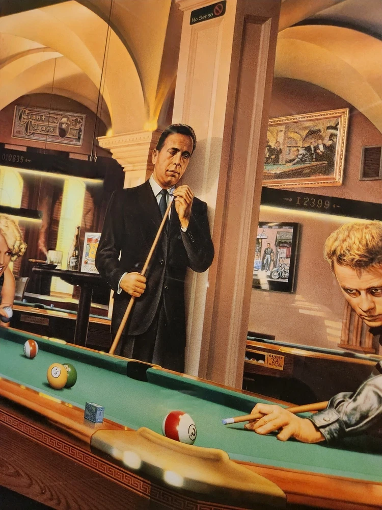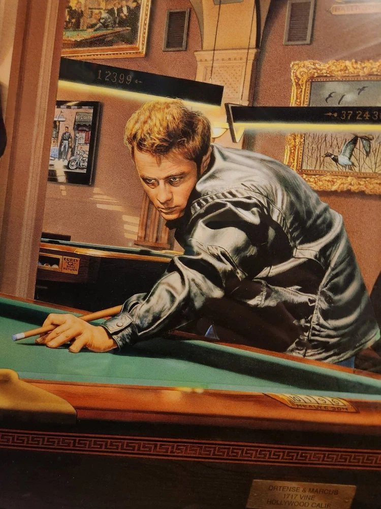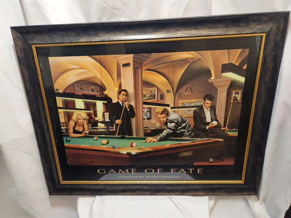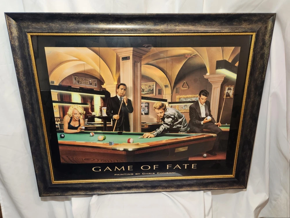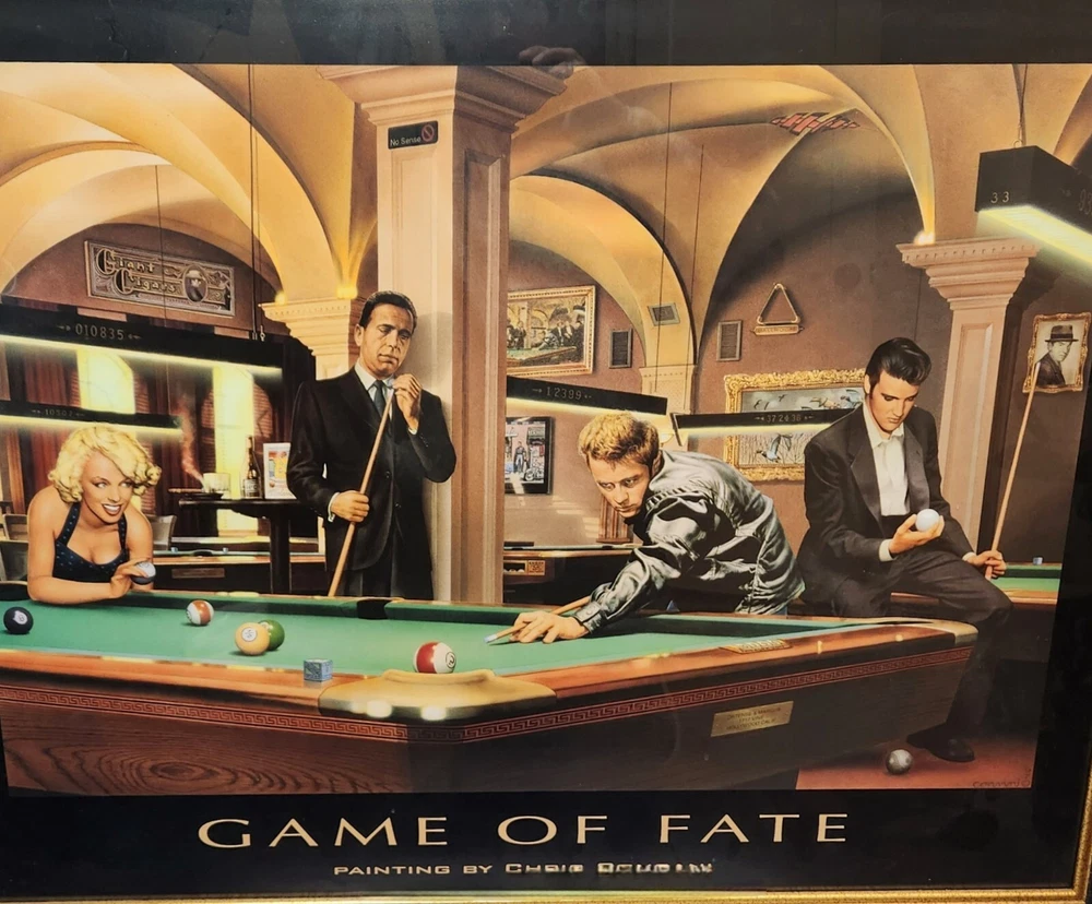 Framed Large Print Of Consani's "Game Of Fate" Near Mint. Iconic "Game of Fate" by Chris Consani. This is a beautiful piece. The image features Elvis Presley, James Dean, Marilyn Monroe and Humphrey Bogart. Frame dimensions are as follows: 37 1/4 ×29 1/4 ×2. Image dimensions are 28 1/4 x 18 3/4.
