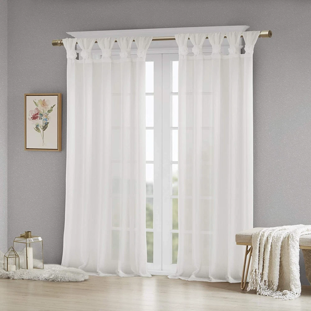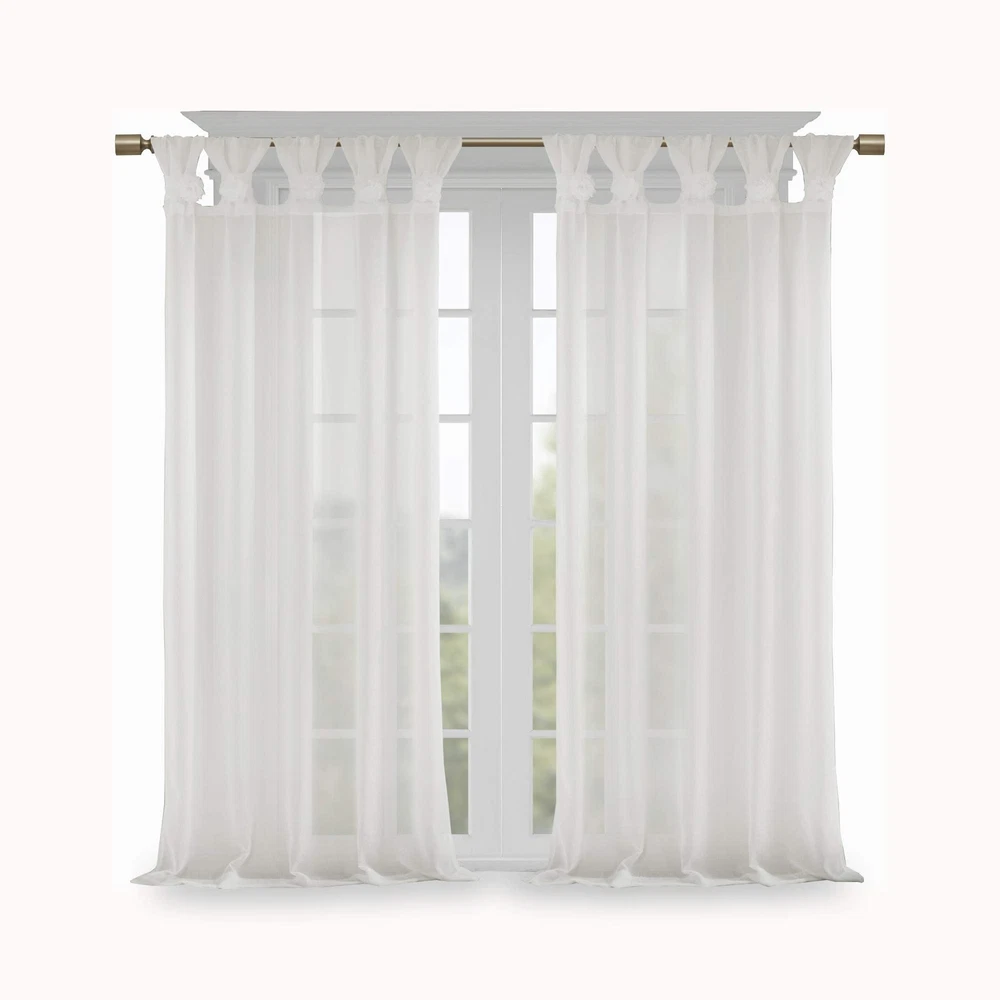Simple and feminine in all the right ways, Madison Park Rosette Tab Top Solid Window Panel Embellished with Flower offers a gorgeous one-of-a-kind look to your home. This solid white panel features a tab top finish and beautiful removable floral pins that give your room a decorator’s touch. The lightweight faux linen semi-sheer fabric filters the perfect amount of light into your home, while creating a soft airy feel - for the perfect shabby chic update to your decor. Window panel is machine washable for easy care, while floral pins are spot clean only. Fits up to a 1. 25” diameter rod. Madison Park Rosette Floral Embellished Cuff Twist Tab Top Window Panel offers a gorgeous one-of-a-kind look to your home. This soft voile panel provides a simple and airy update to your décor. The DIY cuff twist tab top creates beautiful and delicate folds for a stylish decorator's touch. Fits up to a 1.25” diameter rod. 1 Window Panel: 50"W x 84"L,As shown in image - Need to purchase 2 curtain panels for each window for standard coverage. Care instructions: machine washable