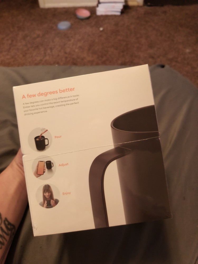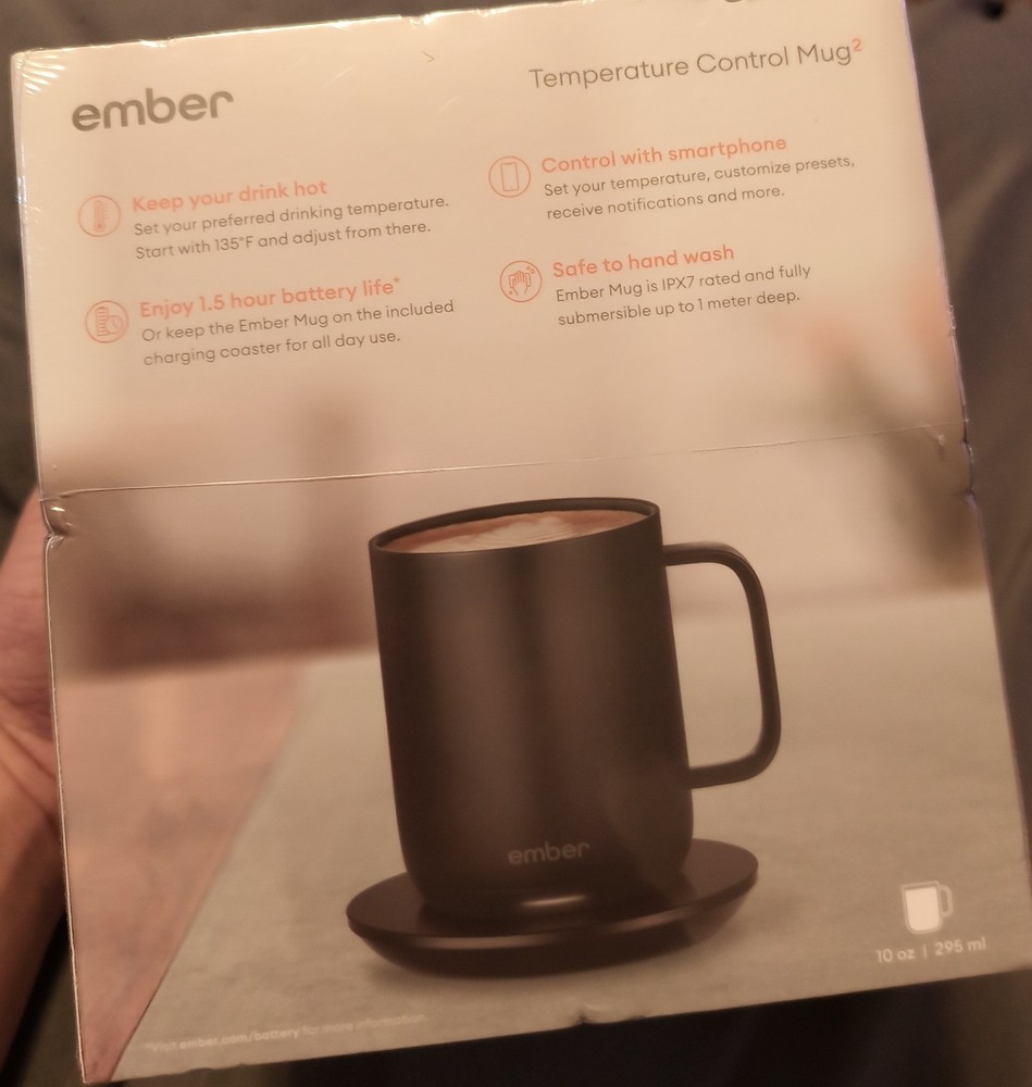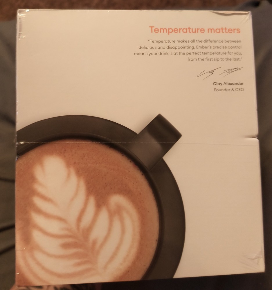 Ember CM171400US Temperature-Control Ceramic Mug - 14oz is a smart mug that keeps your hot beverage at the desired temperature for a hour. It is a two-piece set and is suitable for adults. The mug is made of ceramic and has a black color. It weighs 3lbs. and is manufactured in China. The mug is personalized and the brand is Ember. 1 for $65 2 for $120 3 for $175
