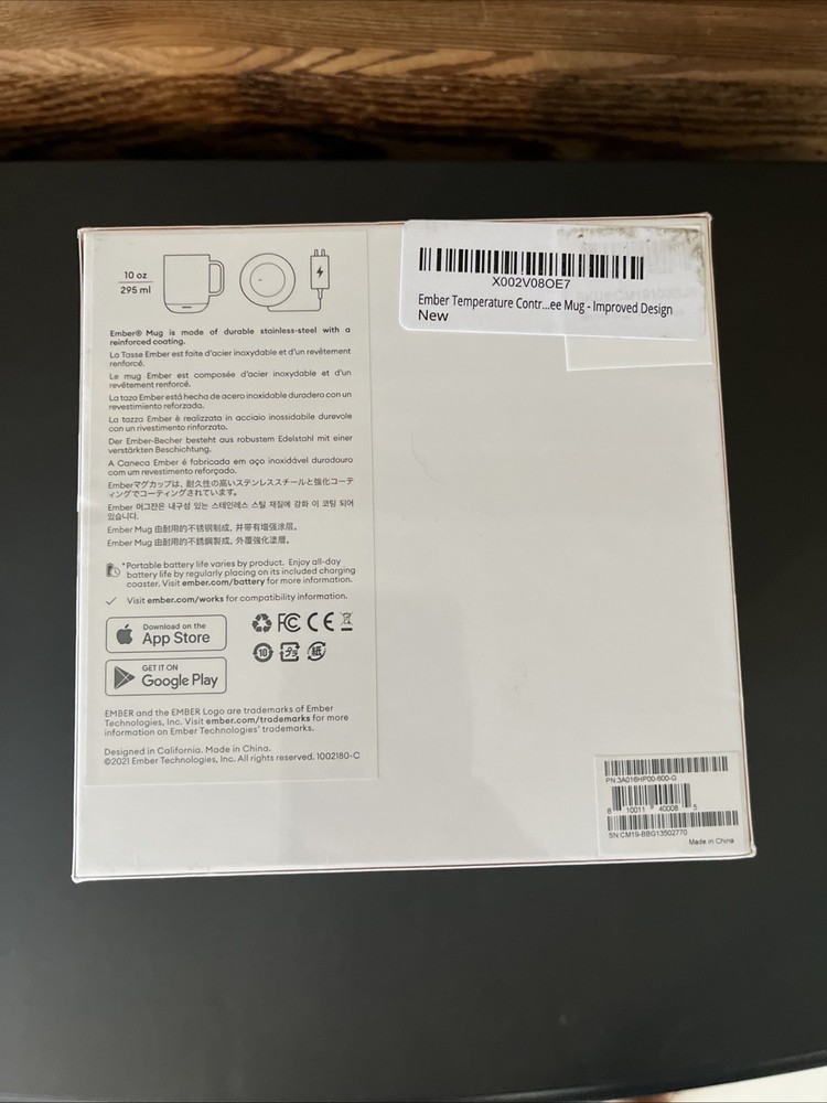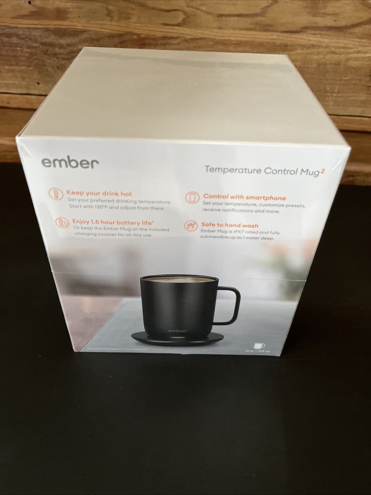 The Ember Temperature Control Mug 2 is a brand new, 10oz coffee mug designed to keep your drinks at the perfect temperature. Its sleek black color adds a touch of sophistication to your daily coffee routine. This mug is perfect for coffee lovers who want to enjoy their favorite beverages while on the go or at home. With its innovative technology, the Ember Mug 2 ensures that your drinks stay hot for extended periods of time, making it a convenient and stylish addition to your kitchen or office desk. This item is new in the box with the outer plastic, wrapping still intact.