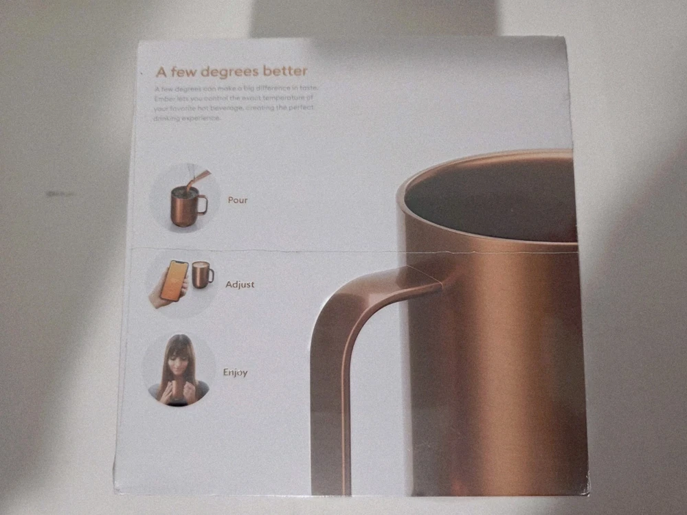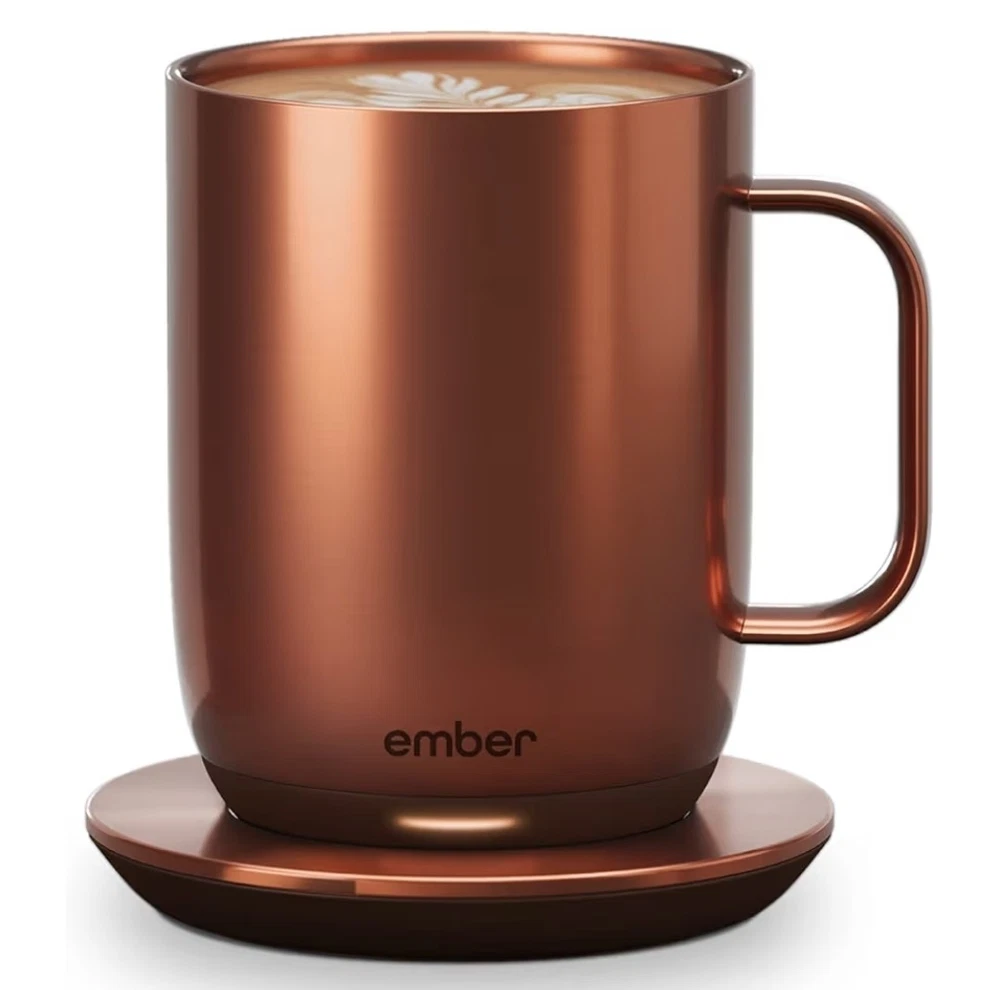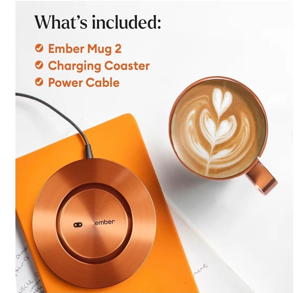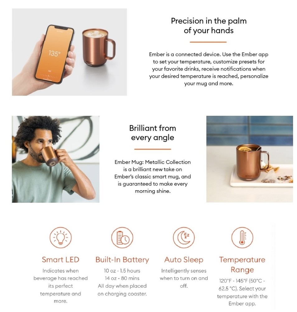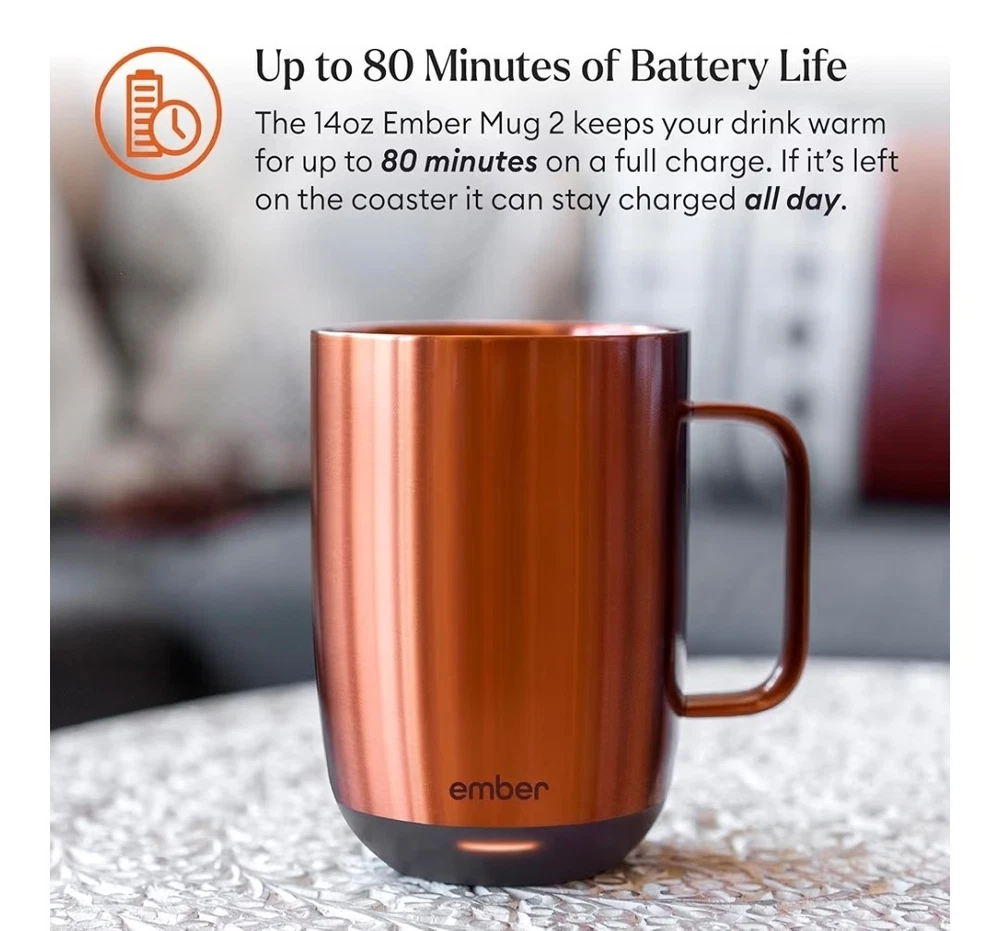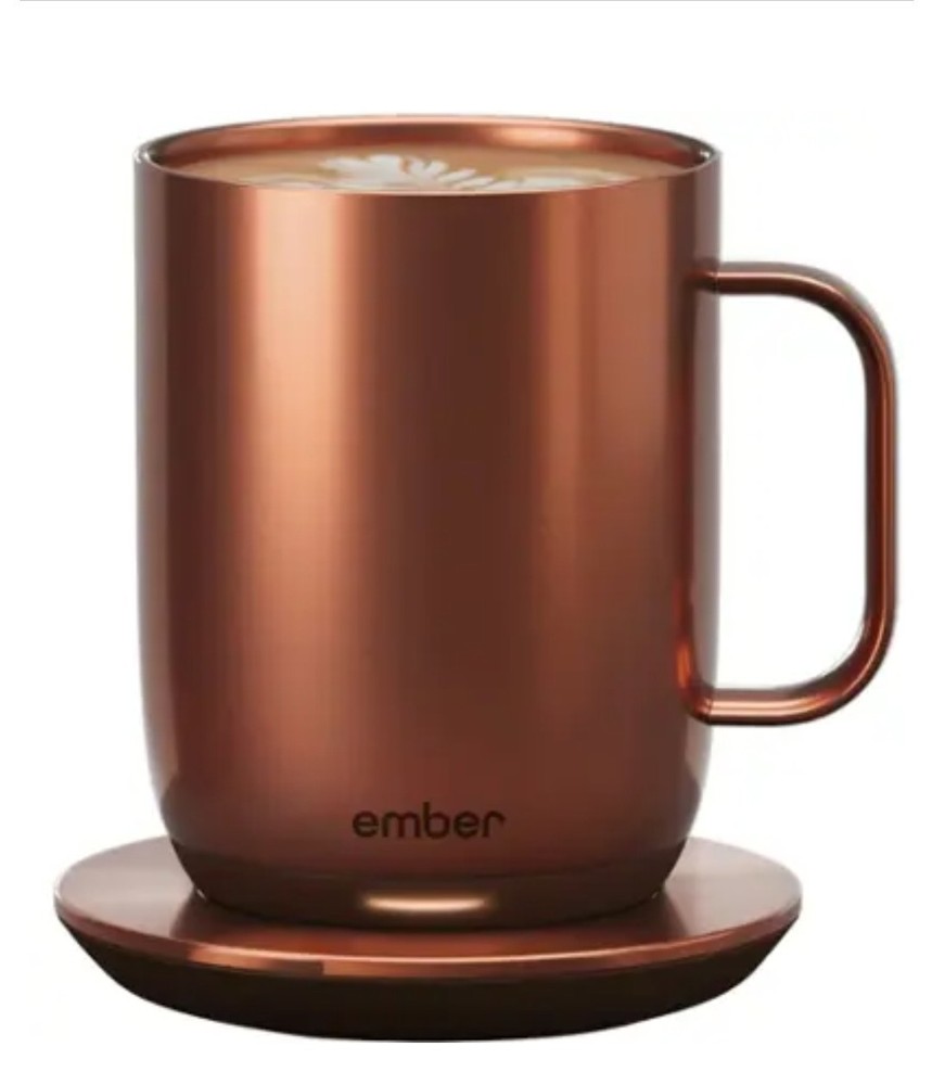 OVERVIEW Ember Mug 2 Copper Edition is a brilliant new take on Ember’s classic smart mug, and is guaranteed to make every morning shine. Ember allows you to set your preferred drinking temperature (120°F – 145°F), so you can enjoy your hot drink—just the way you like it— from the first sip to the last drop. Ember Mug 2’s built-in battery maintains your chosen drinking temperature for up to 80 minutes, or all day with the included charging coaster. FEATURES Sip And Savor Capacity: 14 oz (414 ml) Dimensions: 4.60 in (117.0 mm) x 3.46 in (88.0 mm) Weight: 16.01 oz (457 g) Long Lasting Battery Life Maintain your perfect drinking temperature in the Ember Mug 2 for 80 minutes on a single charge or all day on the included Charging Coaster 2. Charge Status Indicator Set your empty Ember Mug on the included Charging Coaster 2 to charge. The smart LED light on the front of the Mug will breathe red when charging and be solid green when fully charged. The LED is white when heating or monitoring a hot beverage. Easy Cleaning Every Ember Mug 2 is IPX7 rated for full underwater submersion making your Mug easy to hand wash, rinse or soak Your Temperature, Your Way Set the temperature of your hot drink down to the degree. Start with the preset 135°F or select your favorite temperature from a range of 120°F to 145°F (48.9°C to 62.8°C). Auto Sleep Simply start pouring to turn on your Ember Mug 2. When empty, it will automatically enter sleep mode to conserve power. Ember intelligently turns on and off using patented sensors to detect liquid level and temperature. Ember App Once you’ve paired your Ember Mug 2 to the Ember app, remotely set your drinking temperature, save presets for all your favorite drinks, try our tea steeping timers, or personalize the smart LED to your favorite color. The Ember App is compatible with iOS and Android devices. No More Microwaving Enjoy your hot beverages for hours without ever using a microwave. For safety reasons, the Ember Mug 2 should never be placed in a microwave oven. What's Included?? Ember Mug 2, 14oz, Copper, Charging Coaster, Power Adapter, Quick Start Gui⁵⅘