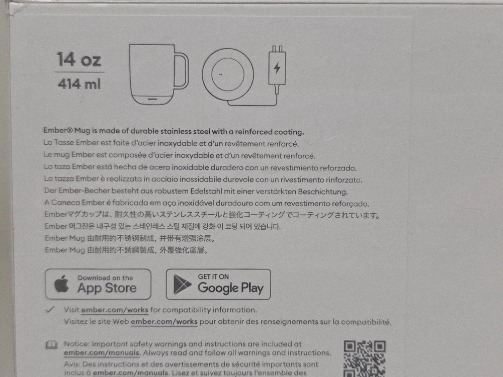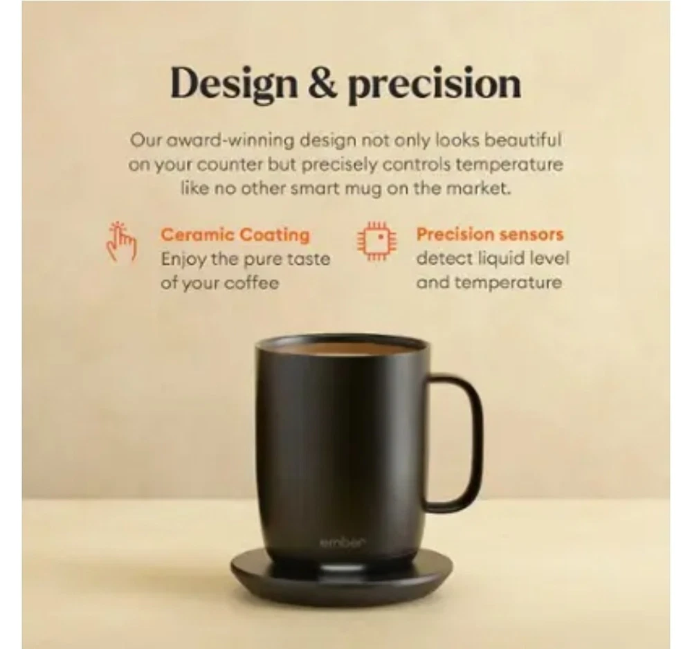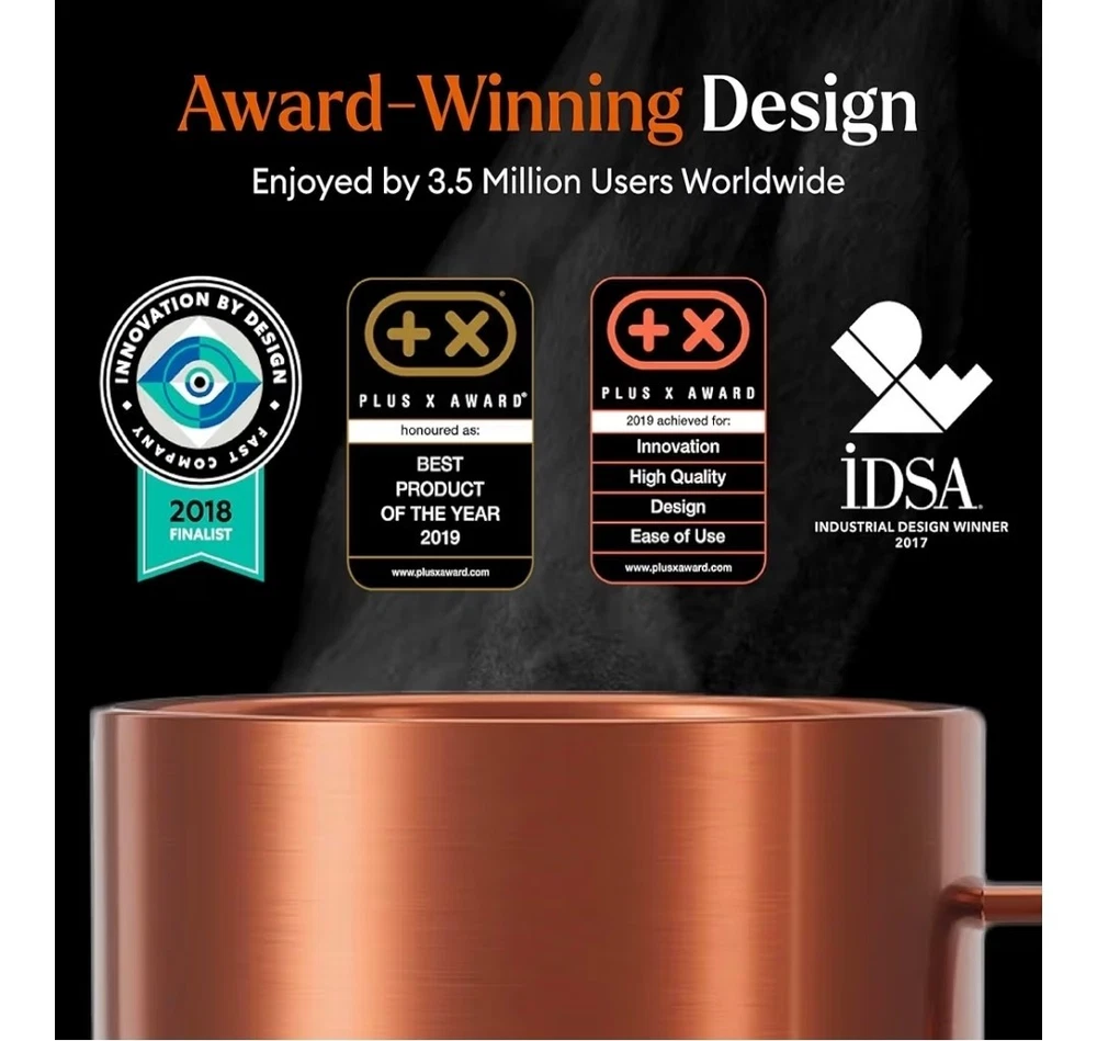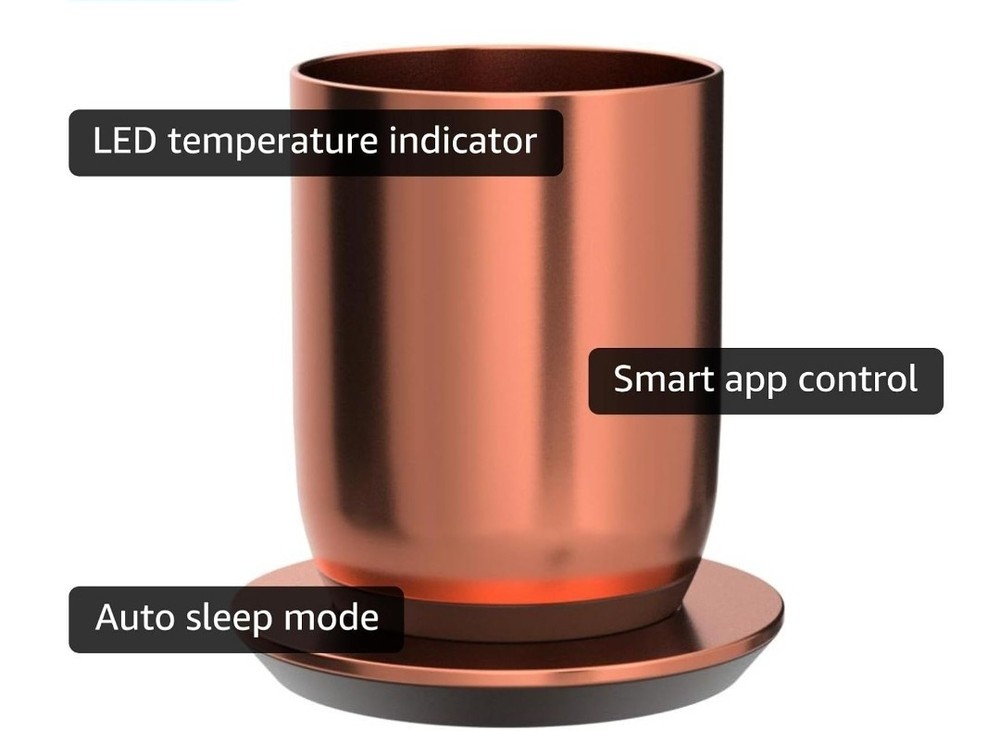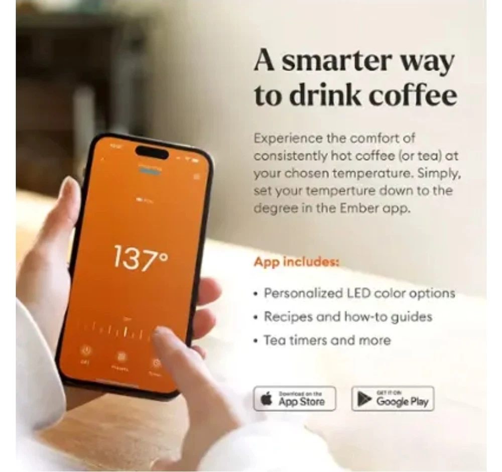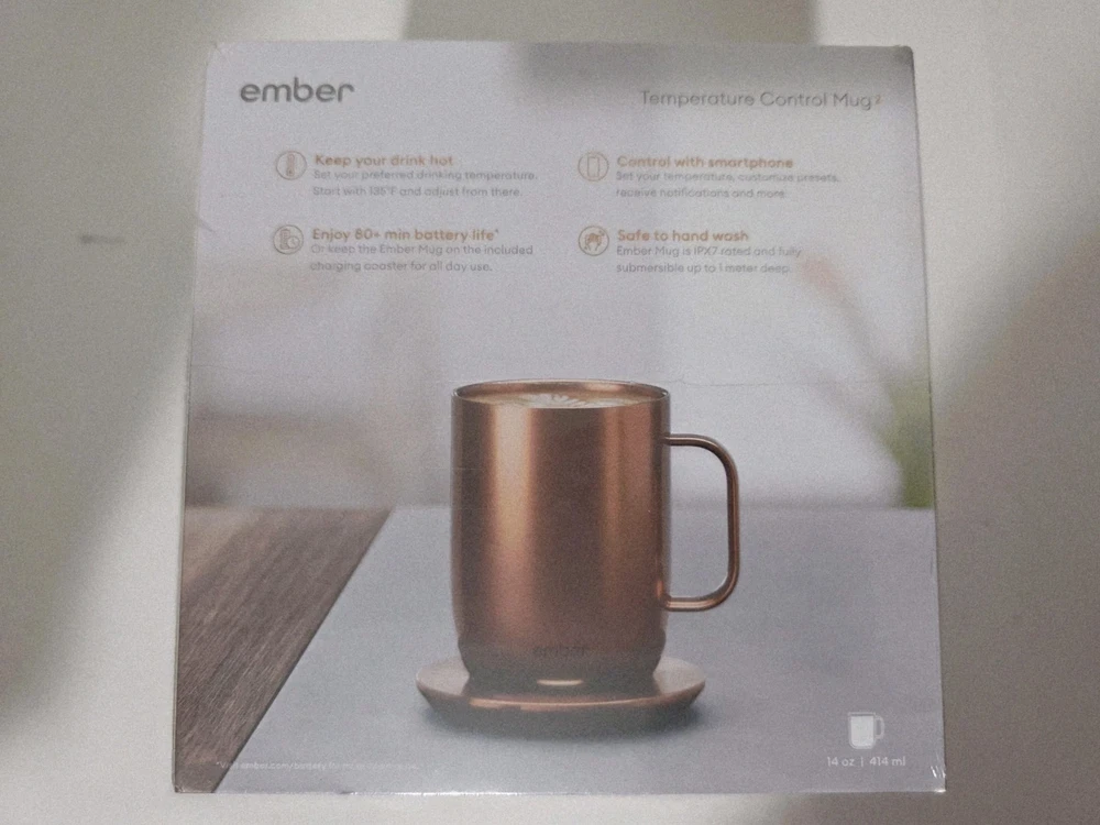OVERVIEW Ember Mug 2 Copper Edition is a brilliant new take on Ember’s classic smart mug, and is guaranteed to make every morning shine. Ember allows you to set your preferred drinking temperature (120°F – 145°F), so you can enjoy your hot drink—just the way you like it— from the first sip to the last drop. Ember Mug 2’s built-in battery maintains your chosen drinking temperature for up to 80 minutes, or all day with the included charging coaster. FEATURES Sip And Savor Capacity: 14 oz (414 ml) Dimensions: 4.60 in (117.0 mm) x 3.46 in (88.0 mm) Weight: 16.01 oz (457 g) Long Lasting Battery Life Maintain your perfect drinking temperature in the Ember Mug 2 for 80 minutes on a single charge or all day on the included Charging Coaster 2. Charge Status Indicator Set your empty Ember Mug on the included Charging Coaster 2 to charge. The smart LED light on the front of the Mug will breathe red when charging and be solid green when fully charged. The LED is white when heating or monitoring a hot beverage. Easy Cleaning Every Ember Mug 2 is IPX7 rated for full underwater submersion making your Mug easy to hand wash, rinse or soak Your Temperature, Your Way Set the temperature of your hot drink down to the degree. Start with the preset 135°F or select your favorite temperature from a range of 120°F to 145°F (48.9°C to 62.8°C). Auto Sleep Simply start pouring to turn on your Ember Mug 2. When empty, it will automatically enter sleep mode to conserve power. Ember intelligently turns on and off using patented sensors to detect liquid level and temperature. Ember App Once you’ve paired your Ember Mug 2 to the Ember app, remotely set your drinking temperature, save presets for all your favorite drinks, try our tea steeping timers, or personalize the smart LED to your favorite color. The Ember App is compatible with iOS and Android devices. No More Microwaving Enjoy your hot beverages for hours without ever using a microwave. For safety reasons, the Ember Mug 2 should never be placed in a microwave oven. What's Included?? Ember Mug 2, 14oz, Copper, Charging Coaster, Power Adapter, Quick Start Gui⁵⅘