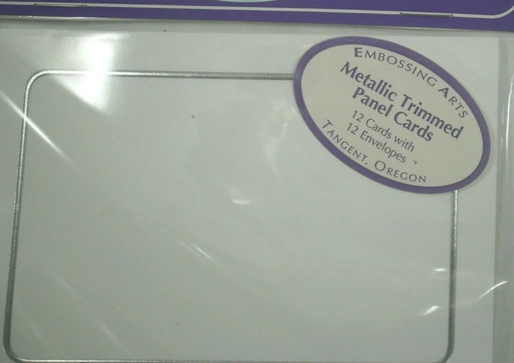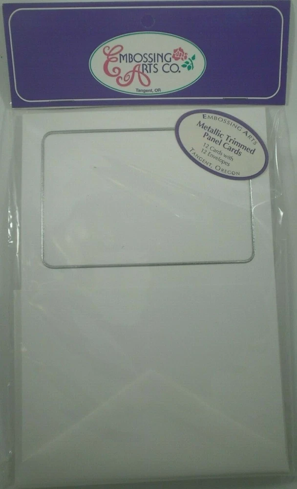 This listing is for a new pack of twelve metallic trimmed panel cards and twelve envelopes from Embossing Art Co. The cards are white trimmed in silver. The cards measure 3.5" by 5". The cards come from a smoke-free, pet friendly home. Shipping will be combined when multiple items are added to your shopping cart.