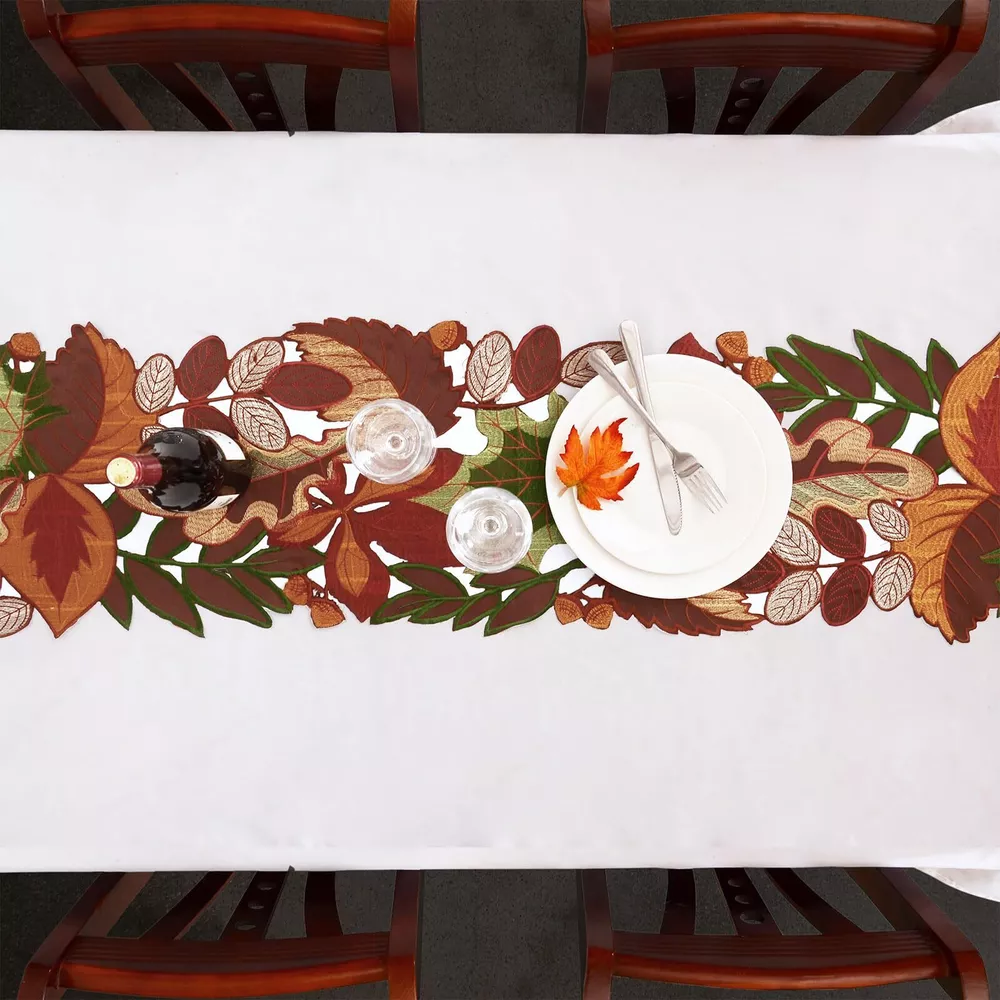 Elevate your home decor with this stunning table runner adorned with an intricate arrangement of fabric leaves in rich autumnal hues. Crafted with meticulous attention to detail, each leaf is expertly shaped and colored, creating a vibrant tapestry that celebrates the beauty of nature. Whether draped across your dining table or adorning a sideboard, this exquisite piece adds warmth and sophistication to any space. With its earthy tones and organic textures, it effortlessly complements a variety of design styles, from rustic to contemporary. Embrace the captivating charm of fall year-round with this remarkable table runner that transforms your home into an inviting sanctuary. Vibrant Fall Decor: This table runner features an array of lifelike autumn leaves in rich hues of burgundy, orange, and brown Versatile Design: The elongated garland style allows it to beautifully adorn tables, mantles or shelves Textured Details: Meticulously crafted with fabric leaves that showcase intricate veining for an ultra-realistic look Easy Care: Simply wipe clean with a damp cloth as needed to maintain its fresh appearance