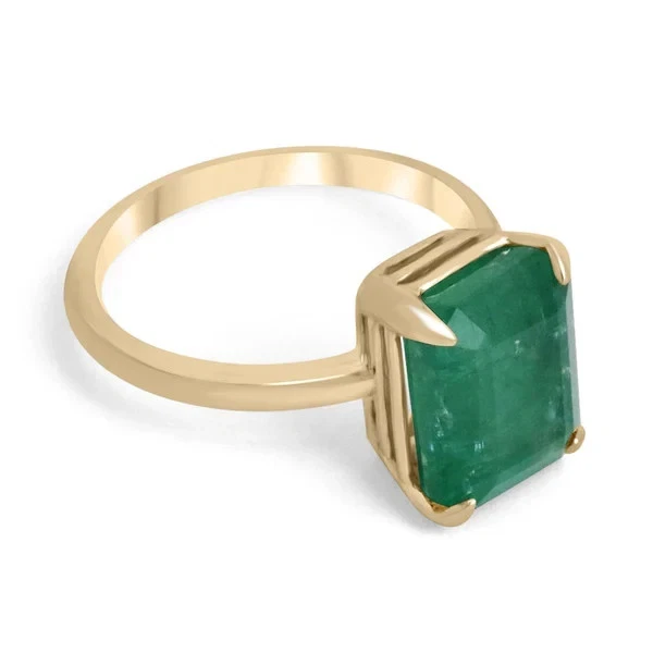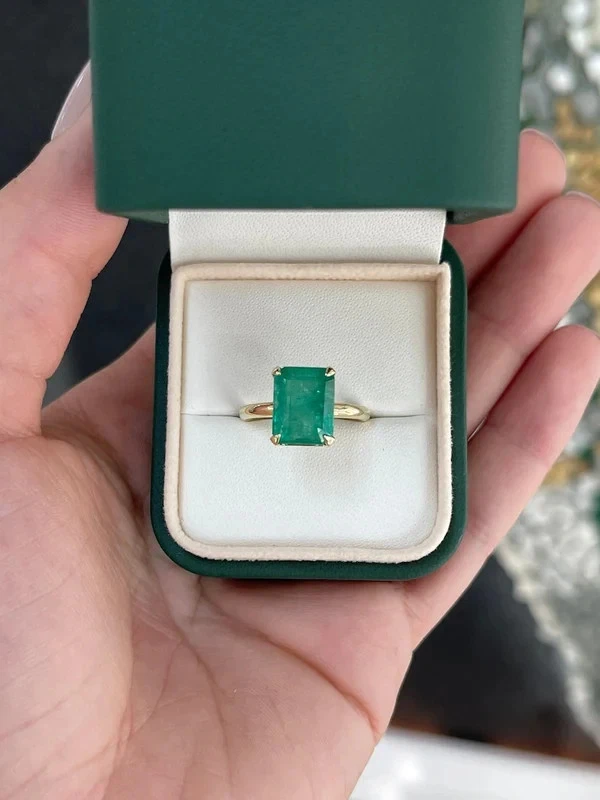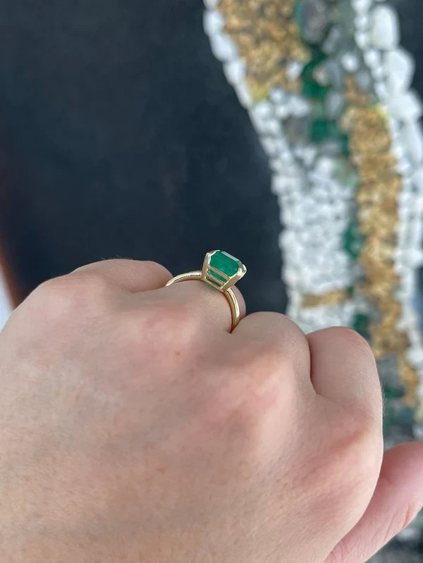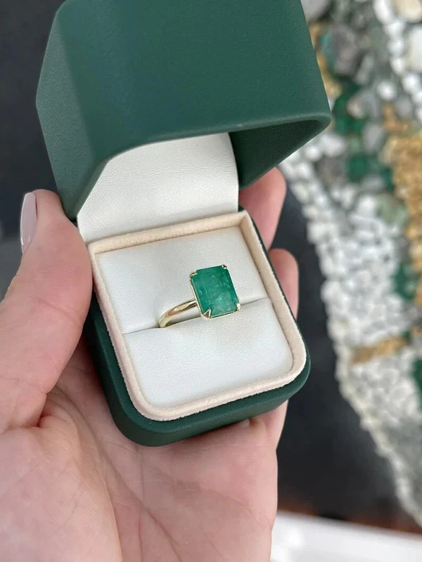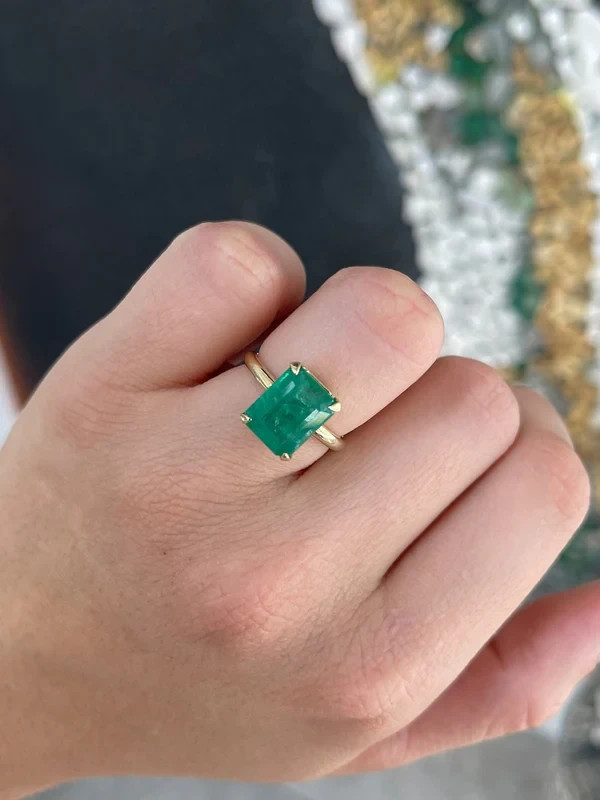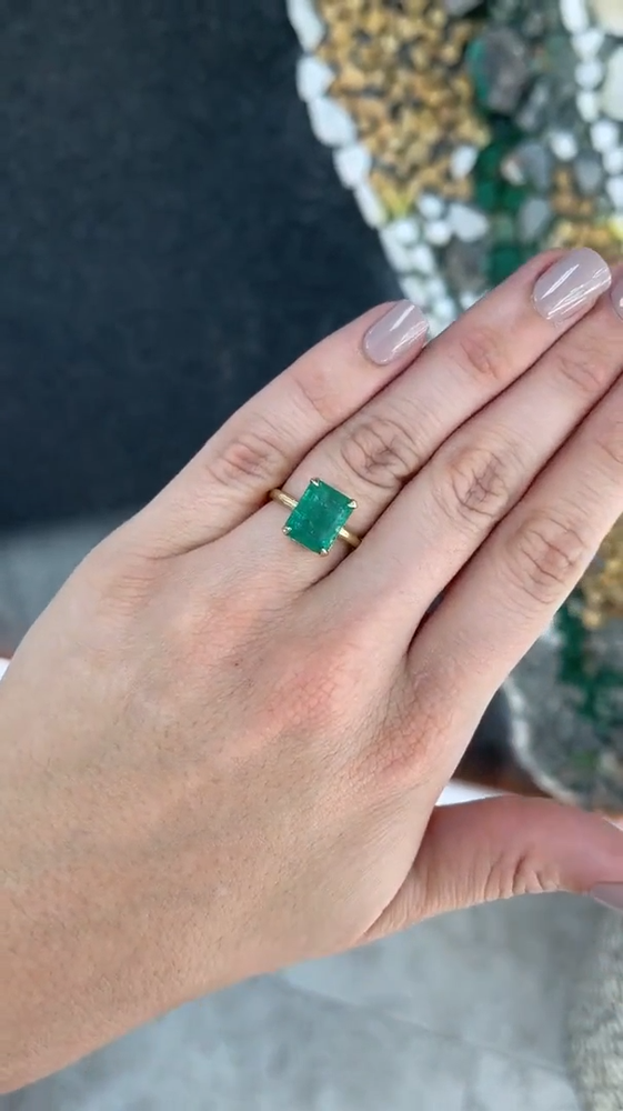This dainty ring features a natural green emerald in an emerald cut, set in 14k yellow gold. The solitaire style ring is perfect for anniversary or birthday celebrations, with a AAA gemstone clarity grade and excellent cut grade. Handmade with nickel-free materials, this ring is customizable and available in all sizes. The ring comes with a GDGL certification and is part of a new collection from the Shullee brand, adding a touch of beauty to any outfit.