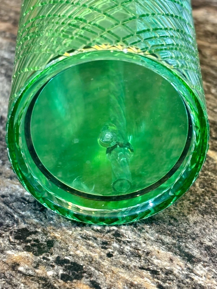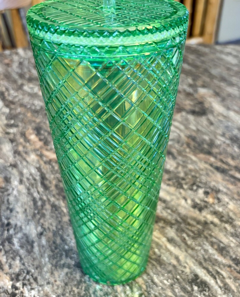 This Holiday Emerald Green Jeweled Tumbler Cold Cup is a three-piece set featuring a 24oz round tumbler made of plastic. The tumbler has a geometric oblong vertical design with a jeweled pattern in a festive holiday color. It comes with a lid and straw, making it suitable for cold beverages. Additionally, it is decorated with etched patterns and color-changing in light , perfect for the winter season. This stylish and insulated tumbler is ideal for festive occasions or everyday use. 2.2.25