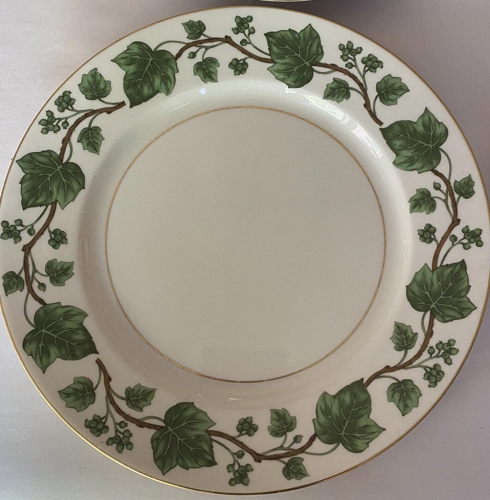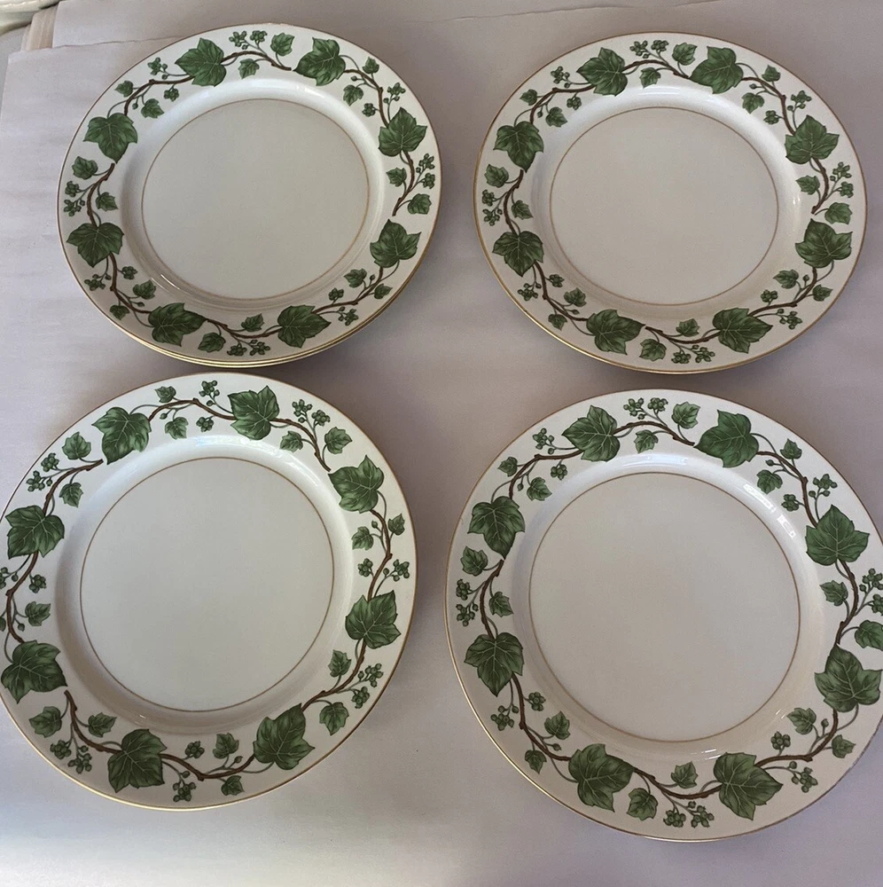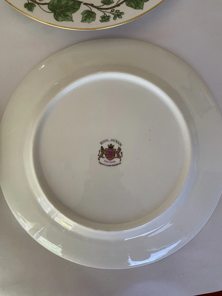 Add a touch of elegance to your dining table with this set of four dinner plates from Royal Jackson. The Emerald Ivy pattern features a glossy finish and a beautifully crafted design in white and green. The plates are 10 1/4" in diameter and are perfect for all occasions, whether you are hosting a formal dinner or a casual gathering with friends. These vintage plates are from the mid-20th century and were produced using studio crafting techniques in China. They come with a printed backstamp and weigh 2.2 lbs each. The set includes both dinner plates and regular plates, making it ideal for complete table settings. The American Directoire style and the Ivy theme make these plates a great addition to any collection. Good condition 10 1/4”