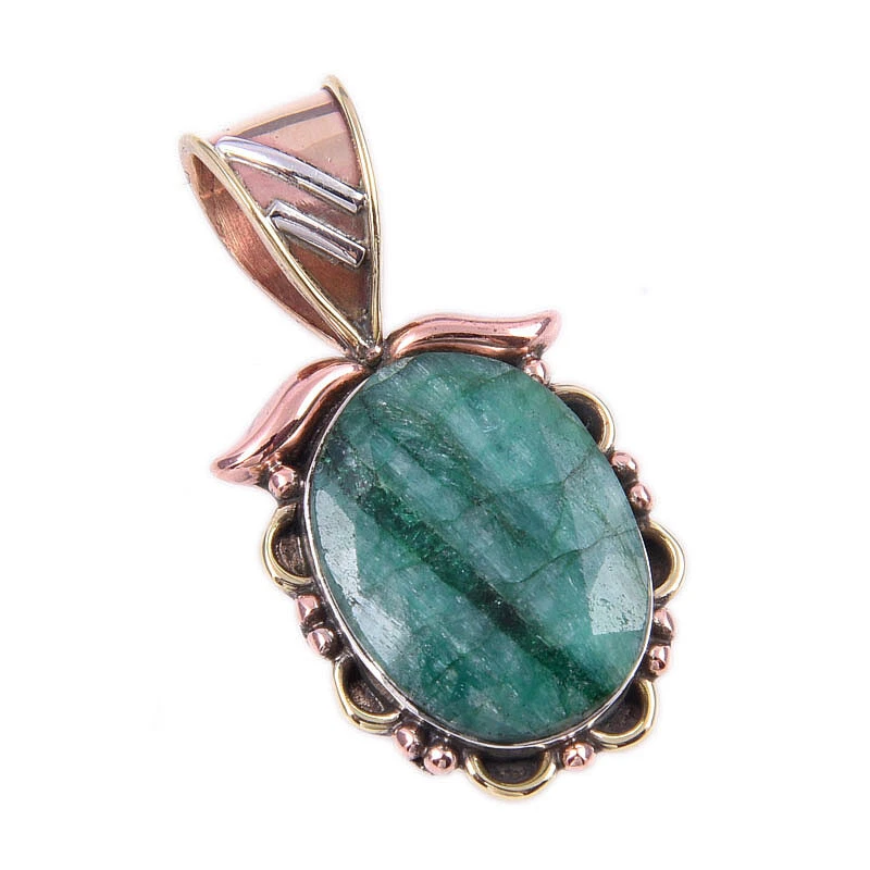 Emerald(Simulated) Handmade 925 Sterling Silver Gift Two Tone Pendant 1.25"