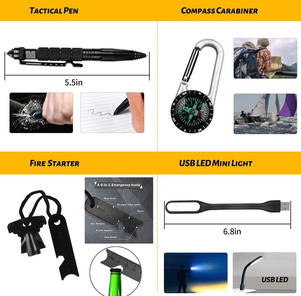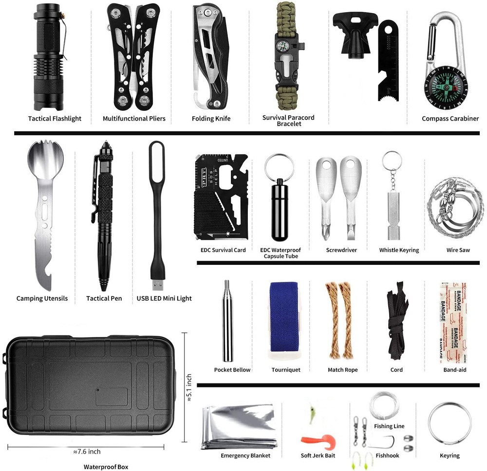 Professional emergency survival kits contain: Multifunction pliers, survival knife, Spoon fork knife,upgrade compass carabiner, 11 in 1 multifunctional plier, wire saw, survival bracelets, emergency thermal blanket, EDC survival tool card, scraper, 3 modes tactical flashlight, fishing hook, line, bait, 6 in 1 camping utensils, whistle, USB LED mini light, capsule case, black waterproof box and so on. Perfectly fits for people who love hiking, hunting, wilderness survival, etc. Great gift idea for father, boyfriend, Christmas, birthday, father days. Survival knife for outdoor emergency use 4 in 1 survival bracelets wristbands Spoon fork knife with whistle Tactical flashlight with 3 modes Multifunctional folding pliers Wire saw 10 in 1 EDC Survival card Thermal blanket Pocket bellow Tactical pen Compass Scrapter ( as mailing range, there are no fire starter) USB Mini LED Light Capsule case Survival whistle Fishing hook, fishing line,fishing bite Packing included