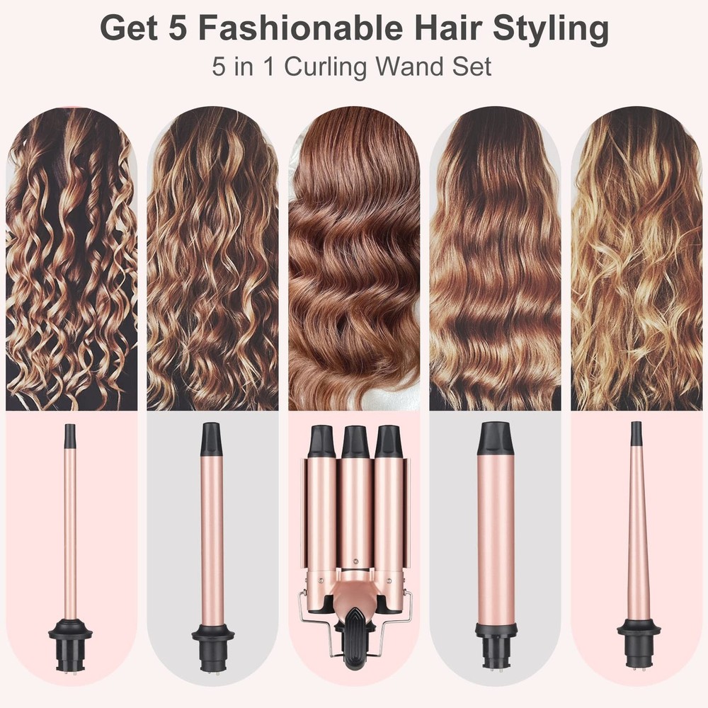 Wand Curling Iron Hair Crimper, Emocci Pro Large 3 Barrel (0.35"-1.25" Ceramic Barrel) Hair Crimper for Women Beach Waves Instant Heat Hair Waver Set for Long Hair Curlers 5-in-1 Curling Wand Set Product Details Color: Rose Gold Brand: EMOCCI PRO MPN: 3 Barrel Curling Iron Hair Crimper UPC: Does not apply EAN: Does not apply Product Benefits: Curling, Hair Styling Shape: Barrel Brand: EMOCCI PRO Hair Type: Wavy, Frizzy, Curly, Fine, Normal Material: Ceramic Tourmaline Product Dimensions ‏ : ‎ 8 x 2 x 2 inches; 2 Pounds Item model number ‏ : ‎ 3 Barrel Curling Iron Hair Crimper Date First Available ‏ : ‎ July 29, 2021 Manufacturer ‏ : ‎ EMOCCI PRO Country of Origin ‏ : ‎ China Best Sellers Rank: #83,642 in Beauty & Personal Care (See Top 100 in Beauty & Personal Care) #186 in Hair Curling Wands #186 in Hair Curling Wands Customer Reviews: 4.3 4.3 out of 5 stars 806 ratings 5 in 1 Curling Wand Set: EMOCCI PRO 5 in 1 curling iron set with interchangeable barrels include 1 inch three barrel ceramic curling iron ; 3/8 inch small curling iron for short hair; 3/8 inch to 3/4 inch tapered curling wand; long barrel curling iron 3/4 inch barrel; 1 1/2 inch beach waves curling iron hair crimper for women; 1 hair comb & Curling Iron Glove heat resistant. With wave curling iron of different sizes,you can make different hairstyles like corkscrew curls,beachy waves,ringlets. Heat Up in 45s: Our large barrel curling iron set 5 in 1 adopts PTC heating technology,small barrel curling iron can quickly heat up to the temperature you need within 45 seconds and keep temperature stable, save time and money with detachable hair curler wand set, enjoy the fun of DIY hairstyle with crimper hair iron. 100% tourmaline ceramics hair wand curler will continue to nourish your hair, keep shine and reduce frizz Easy And Quick to Heat Up: 5 in 1 Curling Wand Set goes from 356F to 410F in just 45 seconds, 410F wand curlers suit for people with more hair and hard hair, triple barrel waver curling iron can easily adjust temperature to suit your hair type and cut your dressing up time. Create beautiful "S" beach waves with our large curling iron. Our beach waver curling iron for short hair curlers iron is perfect for creating beach waves that last all day Dual Voltage & Heat Protection: Spiral Curling iron and wand set with user-friendly design has universal dual voltage hair crimper of 110-240V AC. When used with a compatible adapter, voltage will automatically adjust to appropriate voltage. Worried about getting burned during use curling iron? Anti-scald design and curling wand gloves heat resistant keep you away from these troubles. 360 swivel power cord is more free for you to adjust beach curls curling iron, avoid wire tangles during use Ideal Choice for Beauty: Large barrel Curling wand set is good product for your mother, wife, girlfriend and daughter. Curling iron wavy hair curler has everything you need for a high-quality hairstyle, and it is a great curling iron for women hair