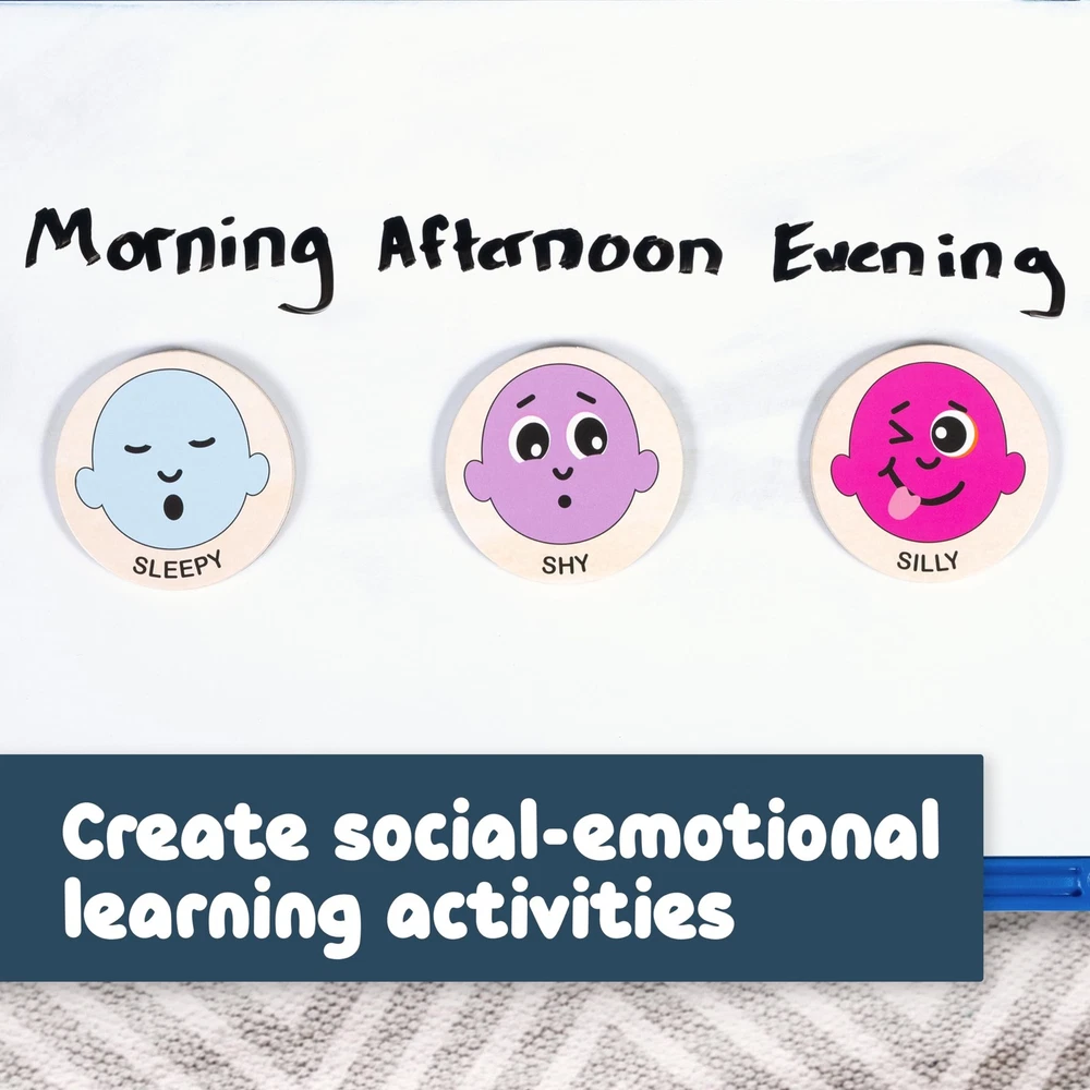 20 DIFFERENT EMOTIONS -- This wooden magnet set features 20 colorful magnets in 20 different facial expressions. Use these magnets to open up conversations about joy, anger, sadness and more! DESIGNED TO LAST -- These magnets are made of smooth, durable plywood. And each magnetic back is securely cut to shape and glued on. They’re designed to withstand years of home or classroom use. KID-FRIENDLY DESIGN -- These chunky facial expressions are perfect for little hands. Move and sort them during social-emotional play. Or incorporate them into lessons about feelings and emotions. ARRANGE EMOTIVE SCENES -- Create emotive scenes with cute emotions, vibrant colors and various sizes. Decorate fridges, whiteboards, appliances and more! SAFE & NON-TOXIC -- These magnets are tested and comply with American toy safety standards. They're designed and approved for ages 2+. PERFECT FOR TRAVEL -- Use the sturdy cardboard tray for easy storage. Take them wherever you go. They’re great for playdates and family outings! FOR MODERN PLAY IDEAS -- We're here to help you find modern, creative toys for little learners to learn life skills through open-ended exploration, sensory experiences and mindfulness.