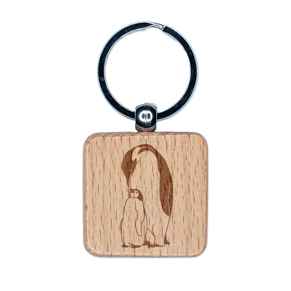 Emperor Penguin Parent and Baby Engraved Wood Square Keychain Tag Charm