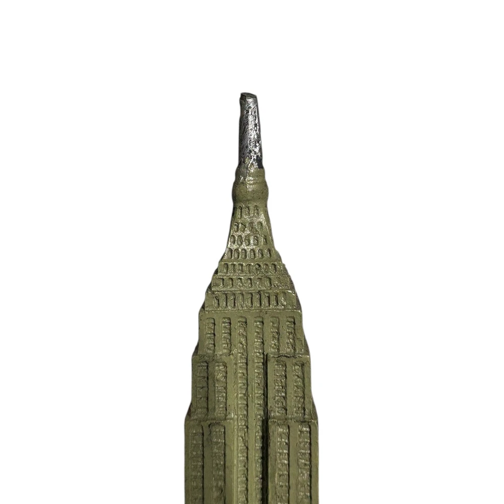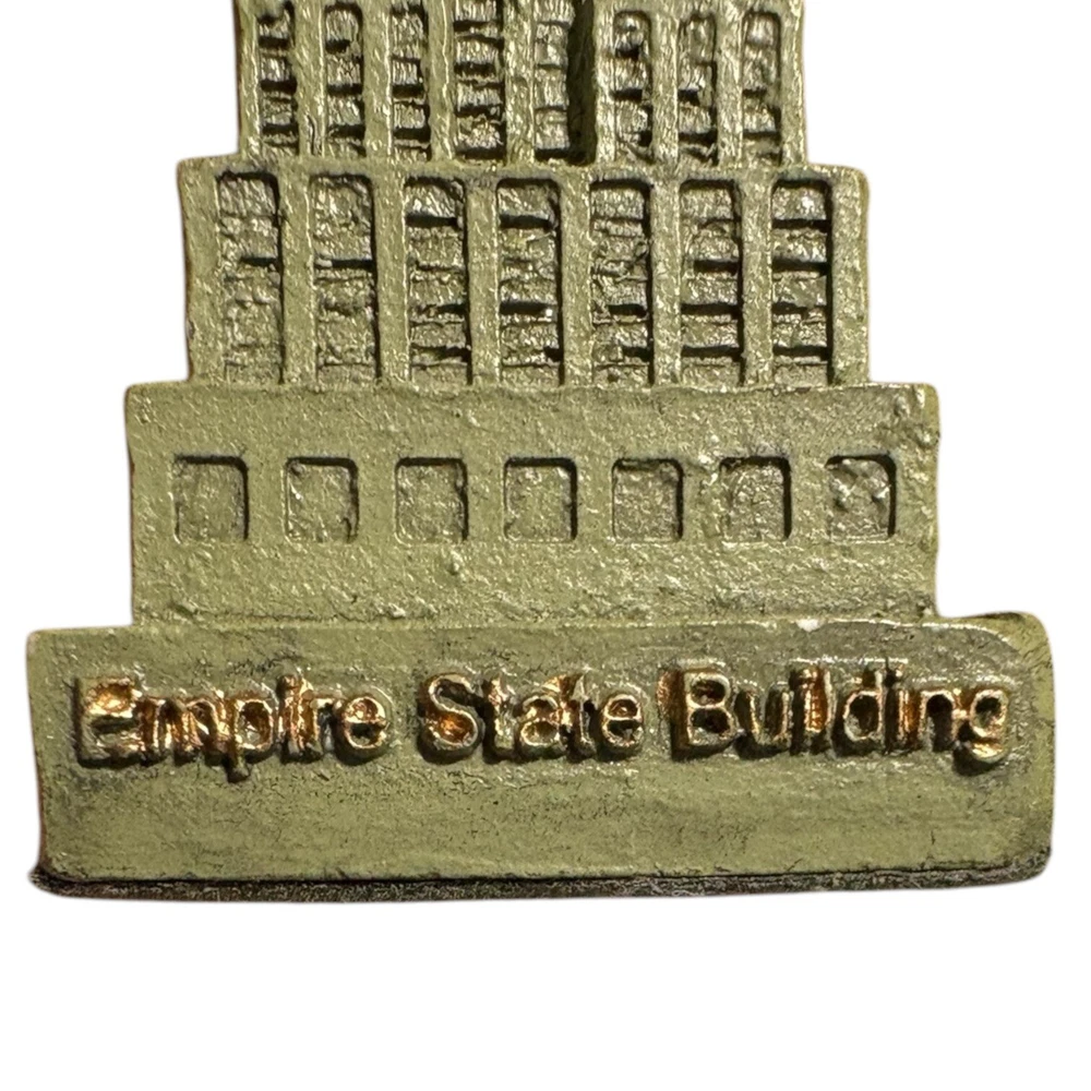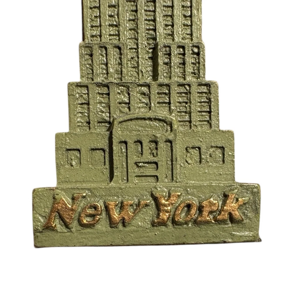 Empire State Building Figurine - Empire Souvenirs Inc - New York - Resin - 3.75" Details: -Felted base -Miniature replica -'Empire State Building' on front side -'New York' on back side -Colors: Green, gold, silver/grey Measurements: -Length: Approximately 1" inch -Width: Approximately 1" inch -Height: Approximately 3 3/4" inches Condition: -Good, pre-owned condition. Minimal external wear. Keywords: empire state building miniature, vintage new york souvenir, nyc landmark replica, vintage desk display, new york travel memorabilia, tourist landmark figurine, vintage nyc gift shop item