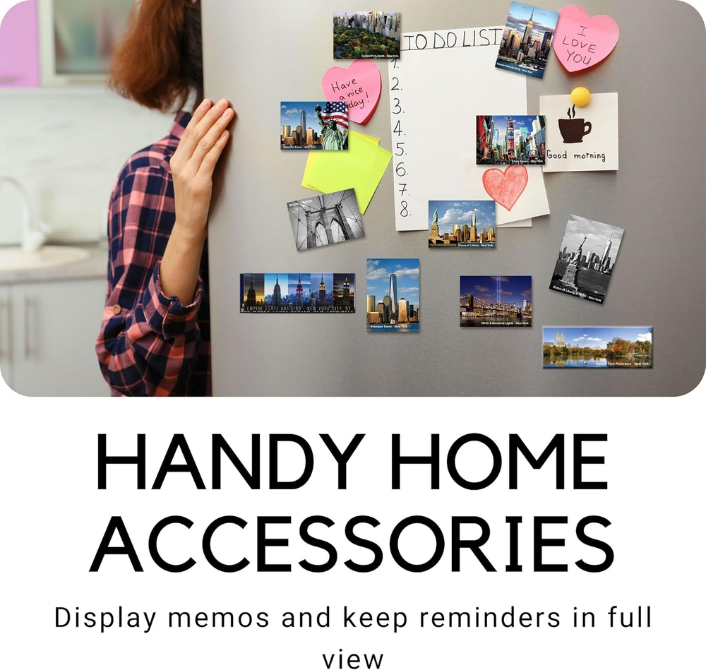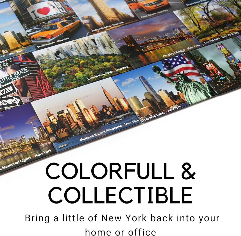 PHOTOGRAPHIC MAGNETS - Stunning photographs and vibrant colors! Our NY magnets will bring the beauty of this lively city into your home. "New York, New York" is a collection of panoramic cityscapes and artsy shots, printed on magnets that make cute gifts and keepsakes for art lovers COLORFUL AND COLLECTIBLE - This is a filmstrip of photos taking at different cast and time points. The beauty of Statue of Liberty at night, sunset and dusk will add a sofisticated touch to your fridge and make great personal or corporate gifts. KEEPSAKE SOUVENIRS - Preserve your memories of wild times in the city that never sleeps! Our NY refrigerator magnets will keep New York on your mind while adding a chic decorative touch to your living space HANDY HOME ACCESSORIES - Use our New York refrigerator magnets to display memos and reminders in full view, to keep bills and receipts together, or for showcasing your own NYC vacation photos QUALITY GUARANTEED AND NO QUIBBLE RETURNS - Each 4 1/2 x 1 1/2-inch magnet is made of high-quality rigid metal with a full-size magnetic back. They're professionally printed on special film in vivid colors, then laminated for protection and color enhancement. Want to bring home a part of ol' New York? Our magnets make it easy! Let's hear it for New York... the city so awesome they named it twice - "New York, New York!". A city that is never sleeping is captured in incredibly artistic photographs on these quality NYC magnets from NY Poster “New York City Landmarks” collection. From Brooklyn Bridge to Lady Liberty, Central Park to Midtown Manhattan, Times Square to Little Italy - all the most famous landmarks and sites are represented in glorious shots taken by Igor Maloratsky. Igor Maloratskiy is a local, well-known photo artist and his portraits of the NY cityscapes featured on Art Prints, Cards, and Souvenir Magnets. Hi was capturing New York landmarks and impressions of this incredible city for the last 25 years and best shots from his art collection now featured on NYC Magnets. Any Photo Magnet from our NY Gifts Collection will make a classy corporate gift, stylish souvenir, and cool keepsake. Furthermore, our magnets are also an easy way to tap into the trend of NYC-inspired home décor. Your purchase is covered by the Amazon Guarantee and our no-questions-asked returns policy. Add your favorite photo magnet featuring famous New York City Landmark to your cart now for an instant New York state of mind!