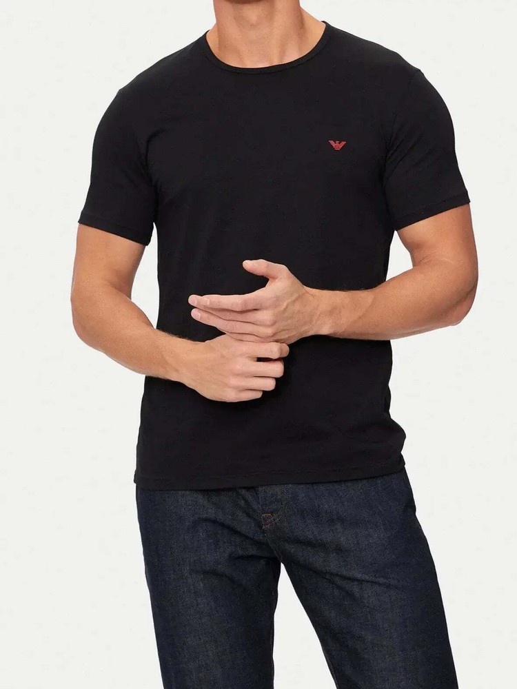 The Emporio Armani 2 Pack Lounge Crew Neck T-Shirts in Red/Black, showcasing a logo on the chest. Made with stretch-cotton, these regular-fit t-shirts feature a crew neck, short sleeves, and a straight hem. As part of the loungewear range, they offer both comfort and style. Style Code : 111267 4F722 73374 Jersey Print Logo Solid colour Round collar Short sleeves 2-piece set 100% Cotton