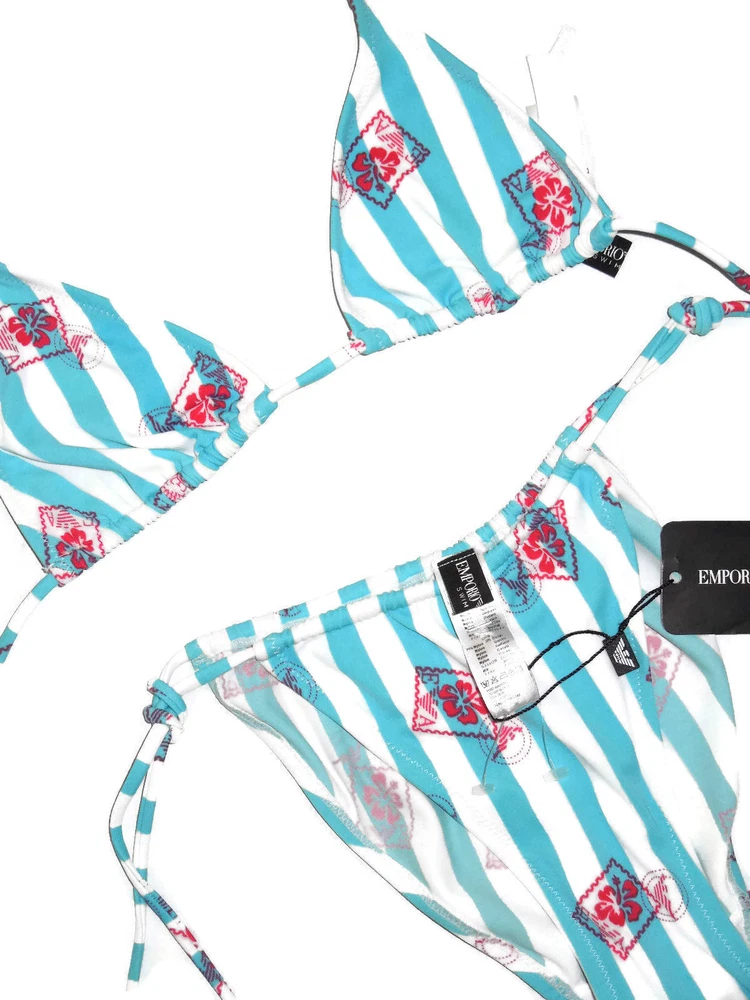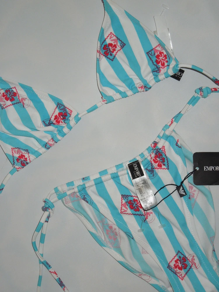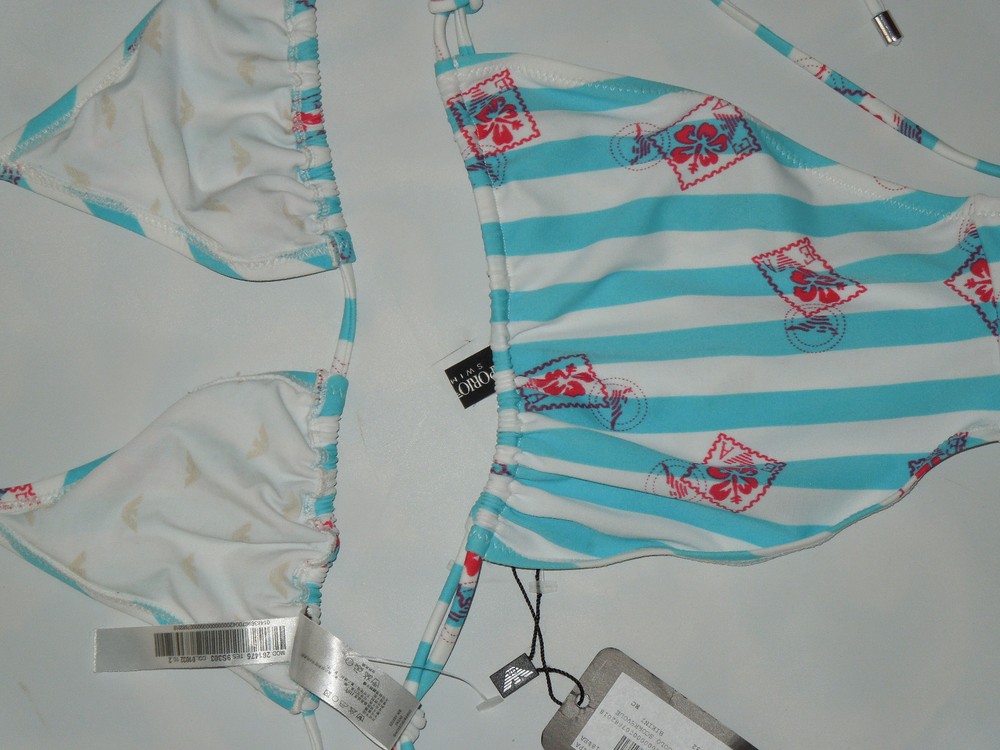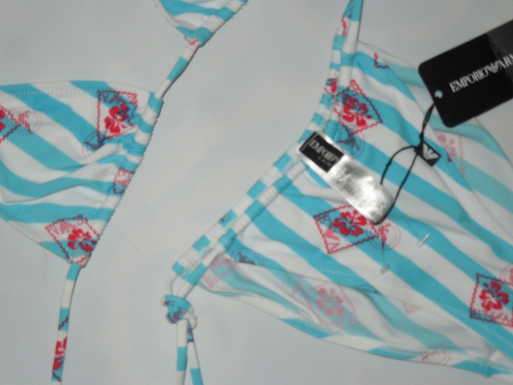 Emporio Armani bikini swimsuit size: 2 European sizing / small US color: white , blue sliding triangle Bikini style striped design with the Armani logo throughout the material in red ties at the neck and back lined ties at the sides of the bottom K126