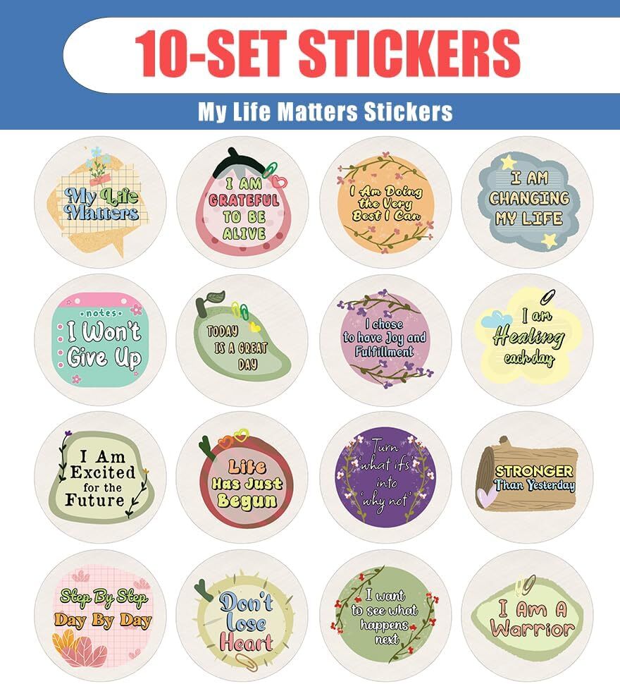 16 UNIQUE DESIGNS INSPIRING STICKERS FOR YOUR DIY PERSONALIZED DECORATIONS - Creanoso My Life Matters Stickers (10-Sheets). These colorful and uniquely inspiring round shaped stickers are the best tool for DIY decoration and personalization of your belongings. GREAT STOCKING STUFFERS , TEACHING SUPPLEMENTARY MATERIALS, AND GIVEAWAY - Great stocking stuffers gifts for Boys, Girls, Teens, Kids. A perfect design to give during classroom school activities, home schooling,birthdays, anniversaries, family day, and any other special occasions. MADE WITH DURABLE AND WATERPROOF MATERIALS - There is a lamination or coating to make the stickers high water resistant, and WILL NOT fade from the water. The stickers can stick it anywhere you like, and it sticks there and lasts a long time. A COLORFUL AND DECOR STICKER DECAL - Each sheet with 16 individual round stickers. There are 10 sheets , with a total of 160 pcs of stickers. STICKER SIZE: 1.5 INCHES IN DIAMETER My Life Matters Sticker (10 Sets X 16 Designs) COLORFUL AND COLLECTION OF TEXT STICKERS • Well designed. • Very encouraging. • Self-adhesive. My Life Matters Sticker (10 Sets X 16 Designs) are super fun to collect; you can't have just one! That's why you will find a selection of stickers right here. Each package comes with different stickers in a variety of designs. Stick them here, stick them there, stick them everywhere! Everyone will love these self-adhesive stickers. These colorful stickers are perfect for any adults and these come with very inspiring messages and bright pictures. A fun, inexpensive way to add a decorative, notes, and stationery. Delight yourself with uplifting messages designs that are very encouraging. My Life Matters Sticker (10 Sets X 16 Designs) perfect for giveaways, behavior incentives, prizes! These stickers are acid-free, nontoxic, and safe for use on photos. This product comes with a 60 days money back guarantee. You can return them to us for a full refund.