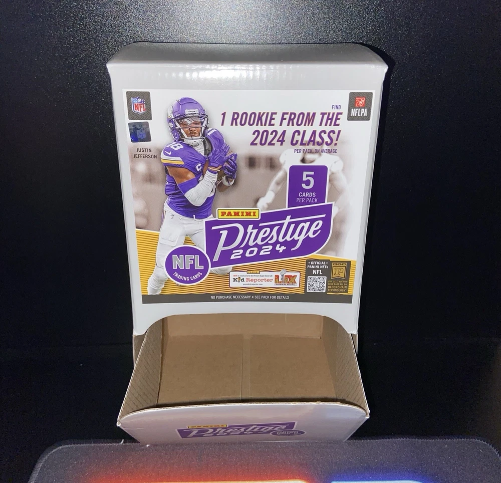 Elevate your collection with the 2024 Prestige NFL Football Gravity Feed Box, a must-have for enthusiasts and fans of the Minnesota Vikings. The box features a dynamic design with standout player Justin Jefferson, adding a unique piece to your sports memorabilia. Despite being empty, this collectible represents a snapshot of the 2024 season and the thrill of the NFL. Crafted with quality paperboard and manufactured in the United States, this item is a testament to Panini's commitment to prestige and detail. The box is presented in English, ensuring it resonates with a broad audience of NFL and trading card aficionados. Add this piece of sports history to your collection and celebrate the legacy of the National Football League.