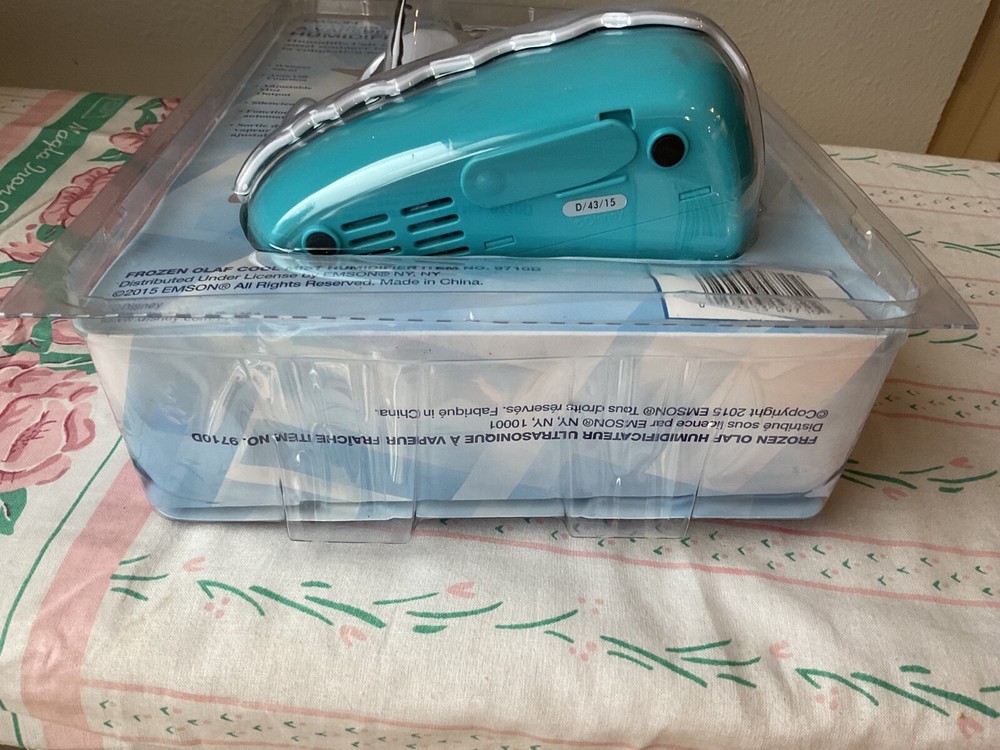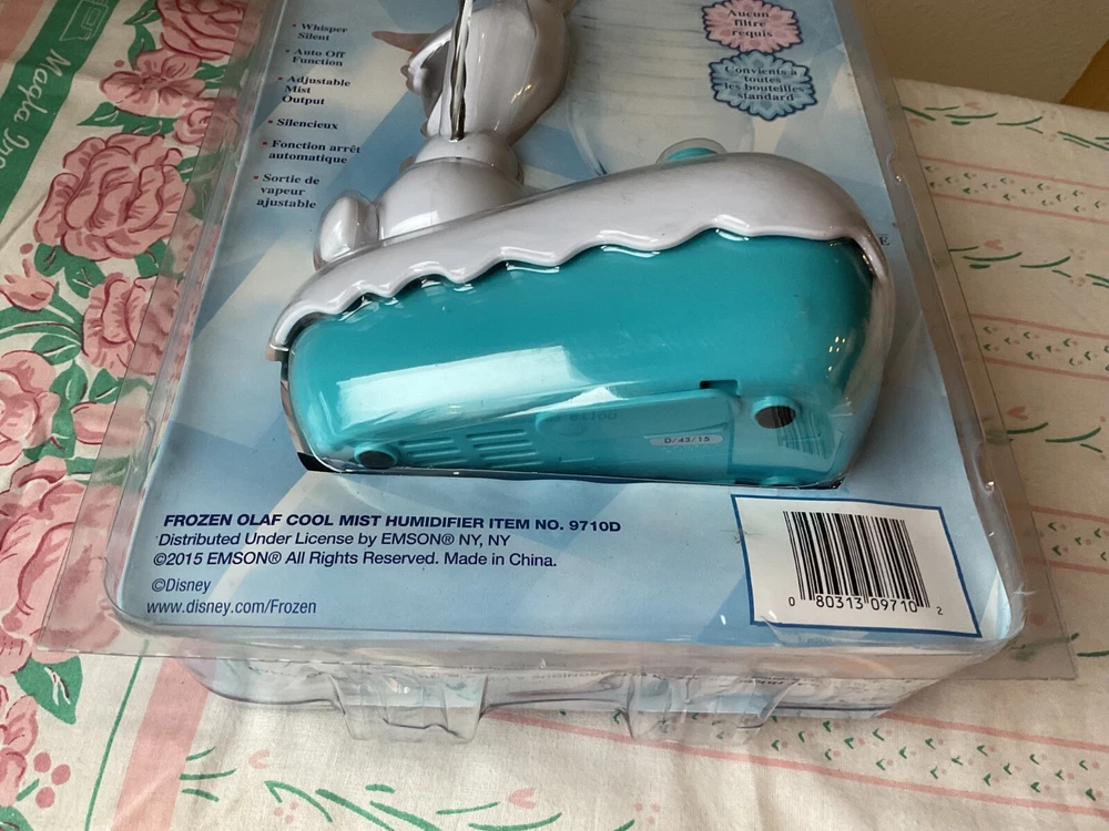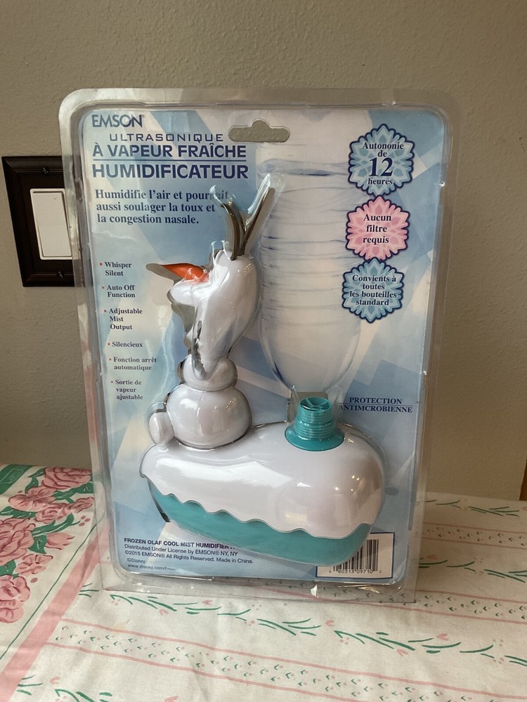 New Frozen Olaf Cool Mist Humidifier. 2015. 12 hour run time, no filter required, fits standard water bottle, anti-microbial protection, adds moisture & may be,p soothe cough & sinus congestion. Emson Ultrasonic Cool Mist Humidifier. All items are sold as is. I strive to make sure every detail is listed in my postings to guarantee a satisfied buyer. I try to iron most my items if needed. Some may come a little wrinkly from storage. If there is a problem please be sure to CONTACT me before going to E-bay. I do accept returns. I am very honest with everything I list. If I do make a mistake or there is a flaw with an item I shipped, please send me an e-mail to let me know. My number my room