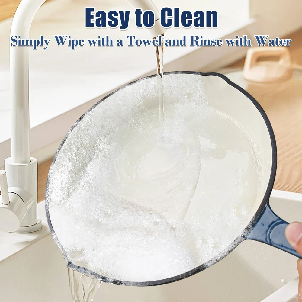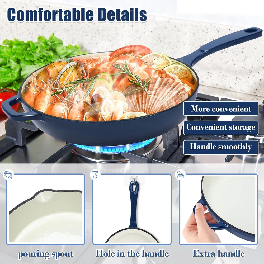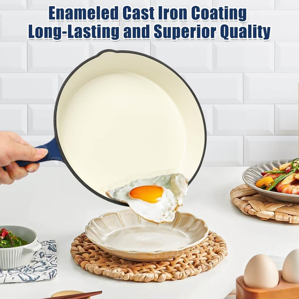 Experience Superior Cooking with 's 3-Piece Enameled Cast Iron Frying Pan Set Elevate your culinary skills with our premium quality cookware set, meticulously crafted for exceptional performance and durability. Whether you're sautéing, grilling, slow cooking, frying or roasting, this versatile set is your ultimate kitchen companion. What's in the Box: 8-Inch Skillet 9.5-Inch Skillet 11-Inch Skillet An excellent gift choice for cooking enthusiasts! Premium Quality: Crafted from durable cast iron. Non-Stick Enameled Coating: Cleanup is a breeze with the non-stick coating, which is free from PFOA, PTFE, lead, and cadmium, ensuring healthy cooking. Versatile Cooking: Compatible with gas cooktops, electric, induction, and ceramic stoves. Oven safe up to 550 degrees Fahrenheit. Cleaning and Maintenance: Simply use a soft sponge or rag for cleaning. Avoid using metal utensils to maintain the ceramic coating's luster. [Enameled Cast Iron Skillet Set] - Complete enameled cast iron frying pan set includes: 8" ceramic cast iron skillet (perfect for omelets) 9.5" enameled fry pan (ideal for stir-fry) 11.5" deep cast iron skillet (for family meals), Versatile cookware set replaces multiple kitchen pots [Superior Heat Performance] - Enameled cast iron construction delivers flawless heat distribution - heating faster and more evenly than traditional cast iron. No hot spots or cold zones, Even browning from center to edge, Juicier, more succulent foods, Maintains consistent temperatures. [Durable 5-Layer Protection] - Enameled cast iron cookware features a scratch-resistant, rust-proof coating—2 layers of base glaze for strength and 2 layers of smooth ceramic enamel. No flaking, no rust, and 100% free from PFOA, PTFE, lead & cadmium—safe for healthy, worry-free cooking. [Seasoning-Free & Rust-Proof] - Skip the hassle—Enameled cast iron pans never need seasoning and won’t rust, unlike traditional cast iron. Just cook, clean, and enjoy effortless maintenance with a finish that stays gorgeous for years. [Effortless Maintenance & Cleaning] - Say goodbye to cast iron hassles! Our premium enamel-coated cookware delivers all the benefits of cast iron without the tedious upkeep. The durable 5-layer ceramic coating is naturally nonstick and rust-proof, eliminating the need for seasoning while resisting stains and scratches. [Versatile Enameled Cast Iron] - This premium cookware works perfectly on all stovetops (gas/electric/induction) and withstands oven heat up to 550°F. Featuring sturdy handles for easy transfer, dual pouring spouts for mess-free serving, and a beautiful finish that goes straight from cooking to table presentation. The perfect all-in-one solution for searing, roasting, and serving with style. [Top Quality from ]- The nontoxic enameled cast iron frying pan set has passed a strict inspection process. If the item you receive is defective due to delivery, please contact our 24/7 online customer service immediately, we will reply you within 24 hours to solve your query. Warranty extended to 1 year for quality issues.