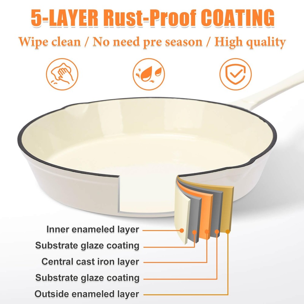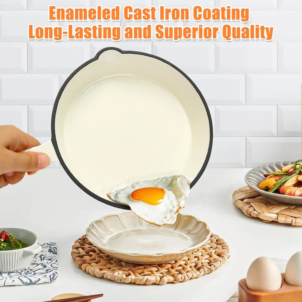 Experience Superior Cooking with 's 3-Piece Enameled Cast Iron Frying Pan Set Elevate your culinary skills with our premium quality cookware set, meticulously crafted for exceptional performance and durability. Whether you're sautéing, grilling, slow cooking, frying or roasting, this versatile set is your ultimate kitchen companion. What's in the Box: 8-Inch Skillet 9.5-Inch Skillet 11-Inch Skillet An excellent gift choice for cooking enthusiasts! Premium Quality: Crafted from durable cast iron. Non-Stick Enameled Coating: Cleanup is a breeze with the non-stick coating, which is free from PFOA, PTFE, lead, and cadmium, ensuring healthy cooking. Versatile Cooking: Compatible with gas cooktops, electric, induction, and ceramic stoves. Oven safe up to 550 degrees Fahrenheit. Cleaning and Maintenance: Simply use a soft sponge or rag for cleaning. Avoid using metal utensils to maintain the ceramic coating's luster. [What's in the Box] - 's 3-piece enameled cast iron frying pan set includes 8-inch frying pan, 9.5-inch fry pan, 11.5-inch skillet. Excellent cookware gift choice for sauteing, grilling, slow cooking, frying, roasting and grilling! [Premium Quality]- The fry pan set material is made of enameled cast iron with excellent heat distribution, heats up quickly and evenly, and the food can be cooked evenly and succulently. Unlike regular cast iron, enameled cast iron offers even more uniform heat distribution, eliminating issues like hot spots that can occur with uncoated cast iron. [Rust-proof & Durable Safe Coating] - The cast iron cookware set boasts a meticulous 5-layer coating system: a robust cast iron interior, fortified with 2 layers of base glaze for stability, and crowned with 2 layers of exterior enamel for a beautiful Cream White finish. This enamel coating is not only crack- and scratch-resistant but also features advanced rust-proof properties, ensuring long-lasting durability. Completely free from PFOA, PTFE, lead, and cadmium, this cookware set is your ideal companion for healthy, worry-free cooking. [No Need for Pre-seasoning] - Unlike traditional cast iron, our enameled cast iron pans do not require frequent oil pre-seasoning after receiving or during routine maintenance. They also won't rust, ensuring long-lasting use and beautiful appearance. [Easy Care & Cleaning] - The high-quality enamel coating makes cleaning simple. Use a soft sponge or rag for easy cleanup. For stubborn stains, soak the pan in warm water for 1 to 2 hours or more, then wash with baking soda or a neutral detergent. To maintain the luster of the ceramic coating, avoid using metal utensils that may scratch the enamel. [Versatile Cooking] - Cookware set compatible with gas cooktops, electric, induction and ceramic. Can be used in ovens up to 550 degrees Fahrenheit for roasting meat. [Classic Design] - Cast iron skillet set with sturdy perforated handles that make it easy to move pot from the stovetop to the oven, hang it easily for storage, or bring a eye-catching dish to the table! The pan comes with pouring ports on both sides, making it easy for you to pour out delicious dishes. [Durable Protection] - To prevent shipping damage, the fire pit is supplemented with protective foam packaging, ensuring it arrives in perfect condition. [Top Quality from ]- The nontoxic enameled cast iron frying pan set has passed a strict inspection process. If the item you receive is defective due to delivery, please contact our 24/7 online customer service immediately, we will reply you within 24 hours to solve your query. Warranty extended to 1 year for quality issues.