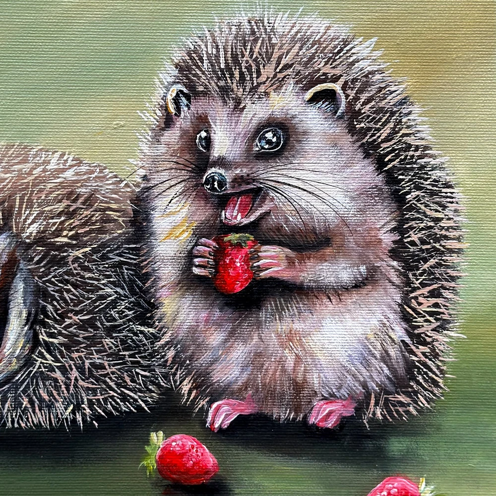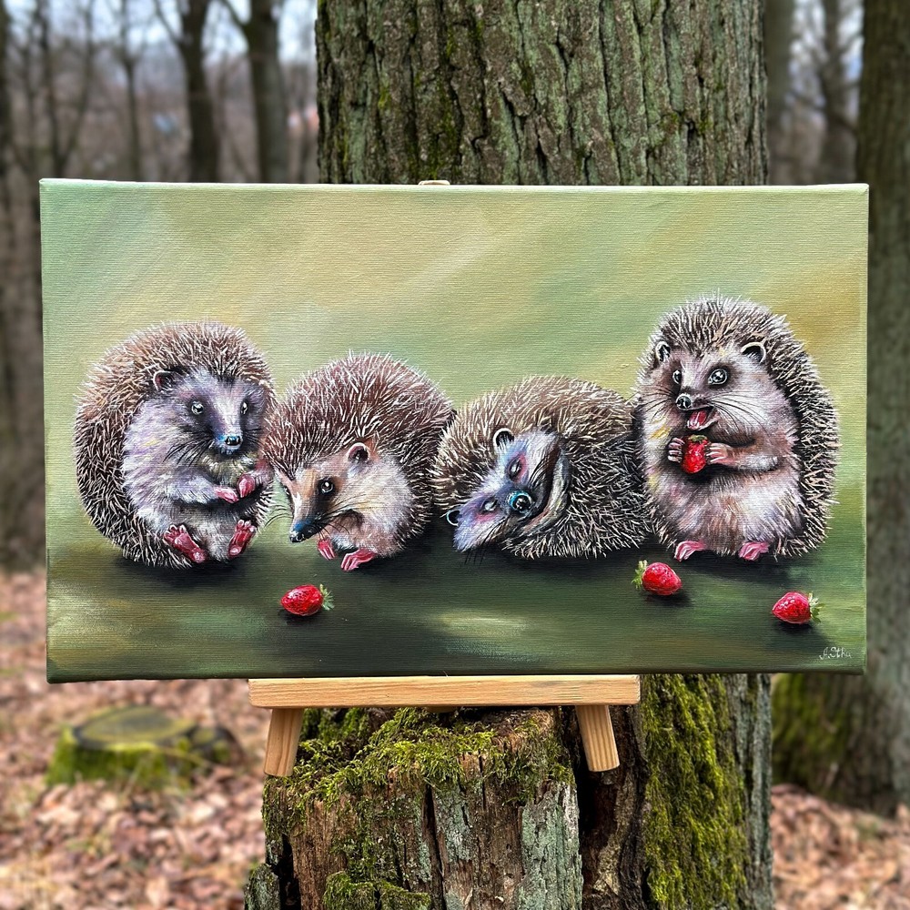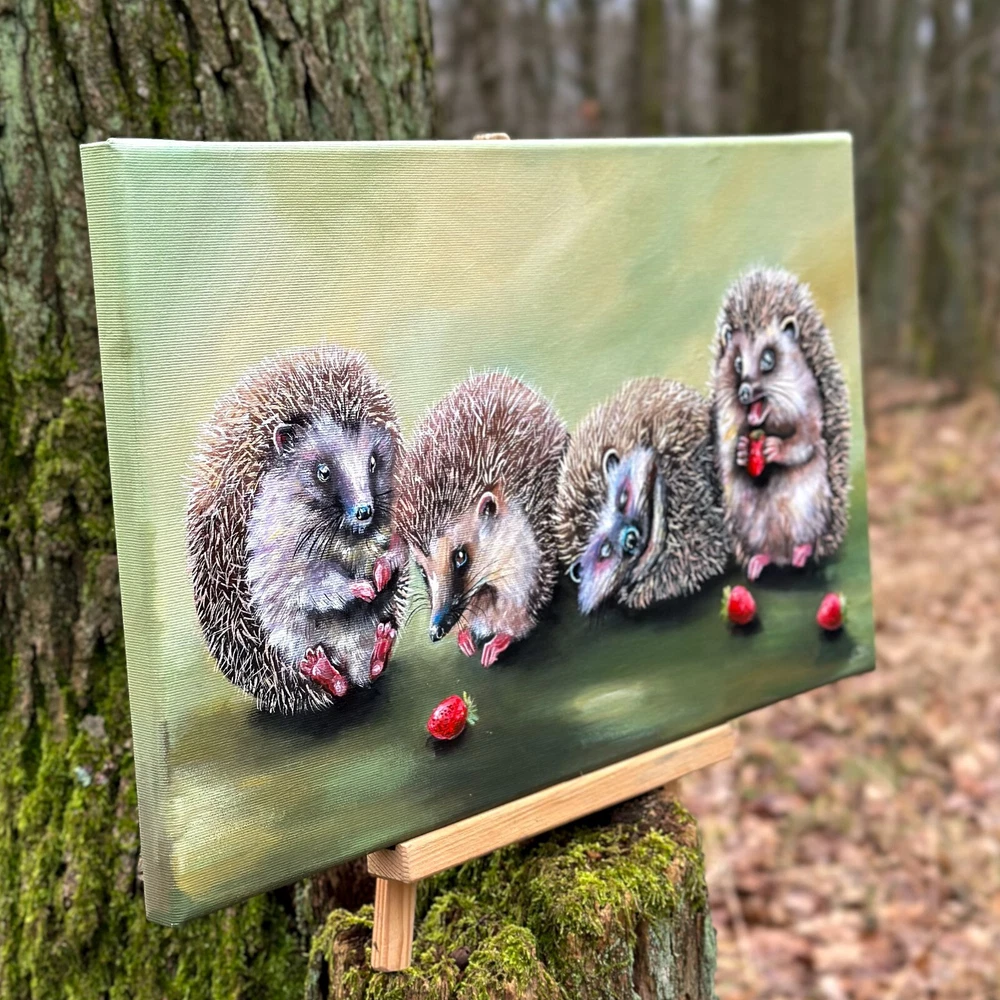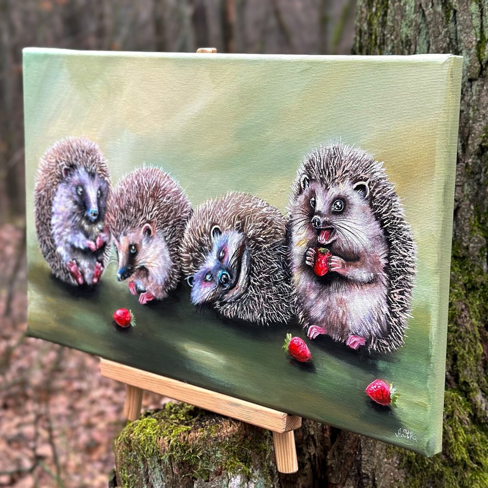 100% original painting on professional canvas, one-of-a-kind This exclusive hedgehog painting is made with professional acrylic paints on a stretched cotton canvas. Each of the four cuties is unique and emotional. The work is forest-like, filled with a wildlife nature mood and inspired by the forest nearby. A heart-melting gift for nature and animal lovers. Title: "Strawberry Lovers" Year: 2024 Size: 50 x 30 x 2 cm (about 20 x 12 x 0.8 inches) Materials: acrylic paints, stretched cotton canvas, glossy varnish. The painting is not framed, but the edges are also colored Please note, the colors may differ due to your monitor settings.