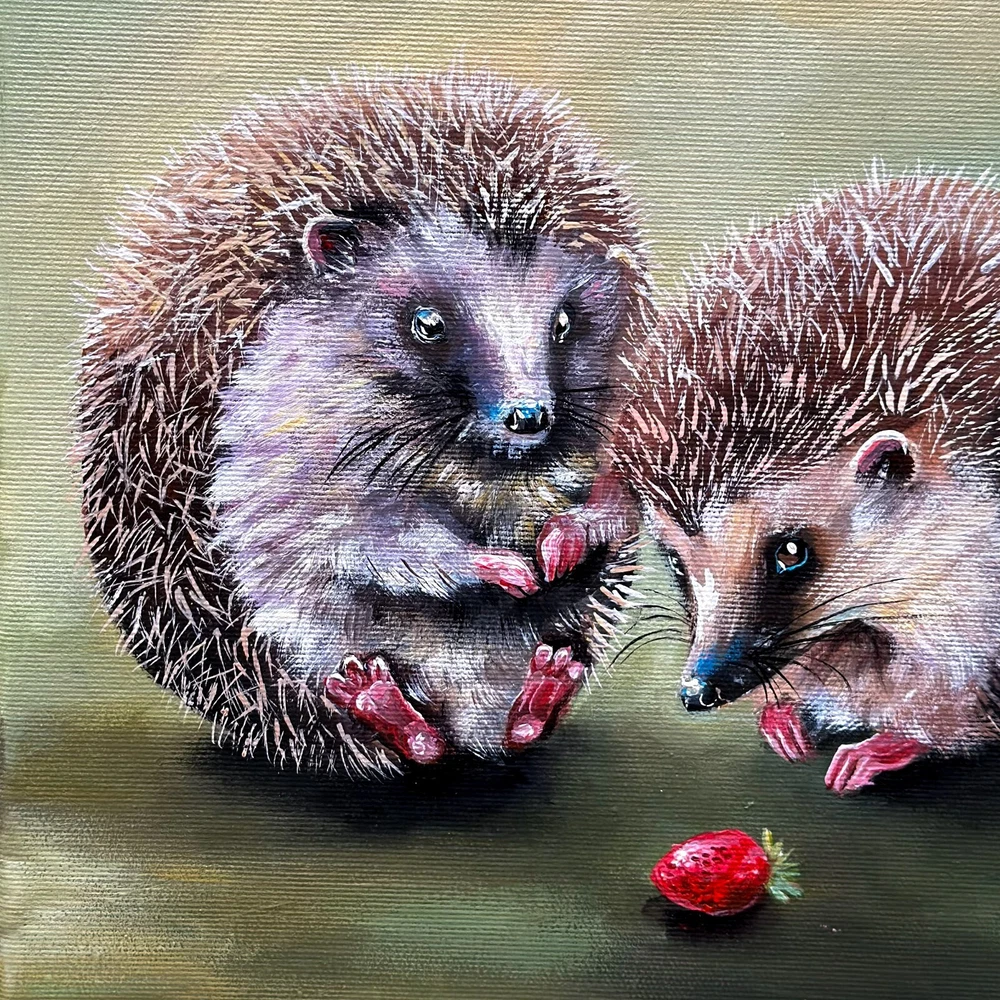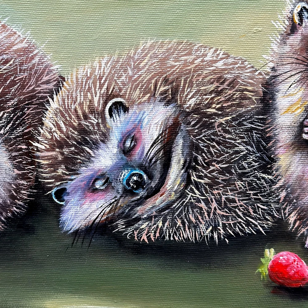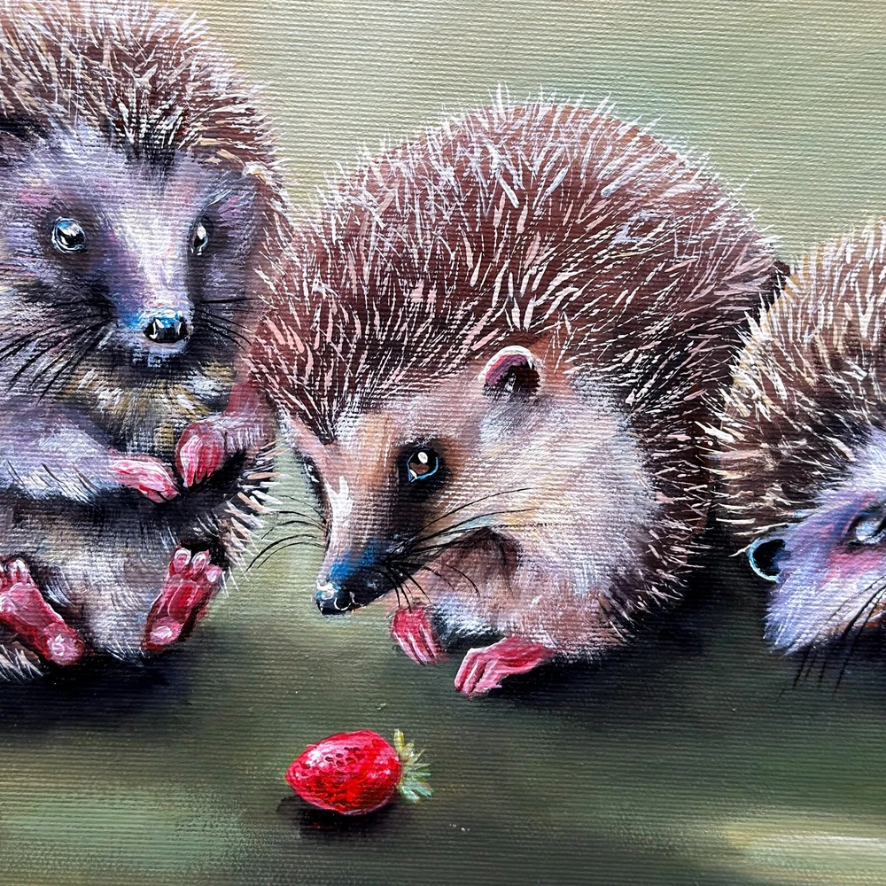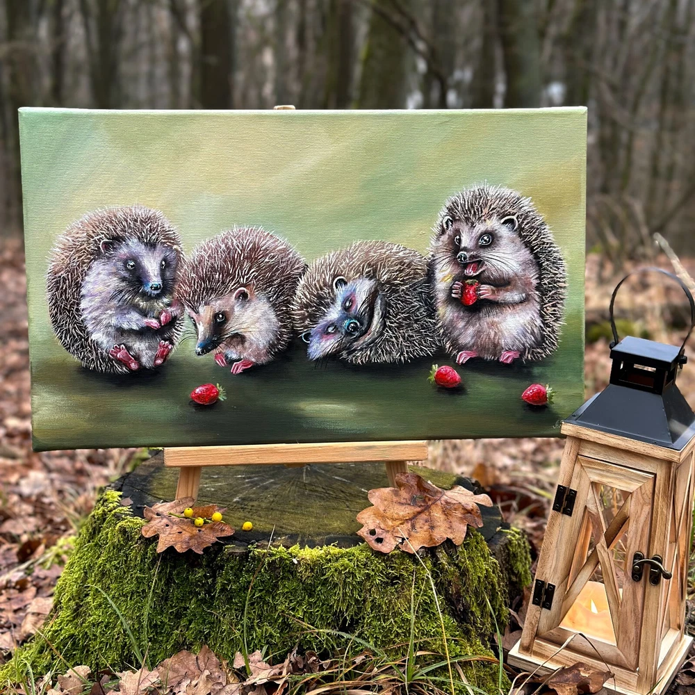 100% original painting on professional canvas, one-of-a-kind This exclusive hedgehog painting is made with professional acrylic paints on a stretched cotton canvas. Each of the four cuties is unique and emotional. The work is forest-like, filled with a wildlife nature mood and inspired by the forest nearby. A heart-melting gift for nature and animal lovers. Title: "Strawberry Lovers" Year: 2024 Size: 50 x 30 x 2 cm (about 20 x 12 x 0.8 inches) Materials: acrylic paints, stretched cotton canvas, glossy varnish. The painting is not framed, but the edges are also colored Please note, the colors may differ due to your monitor settings.