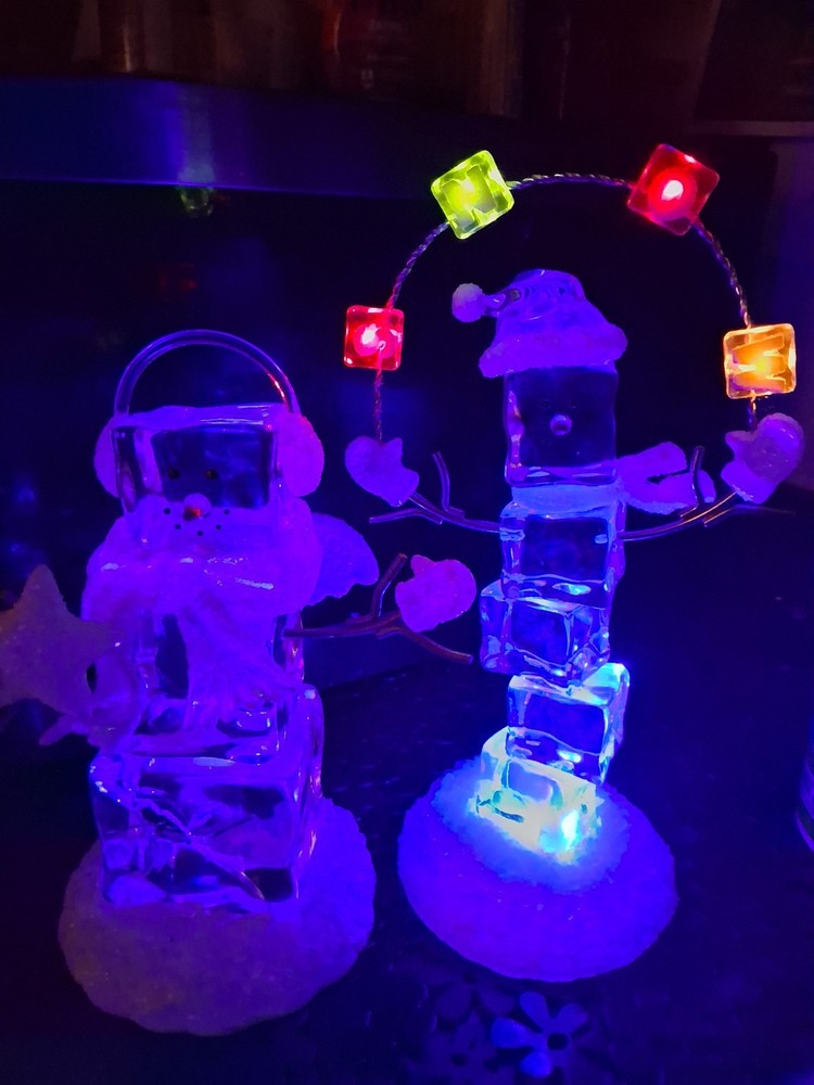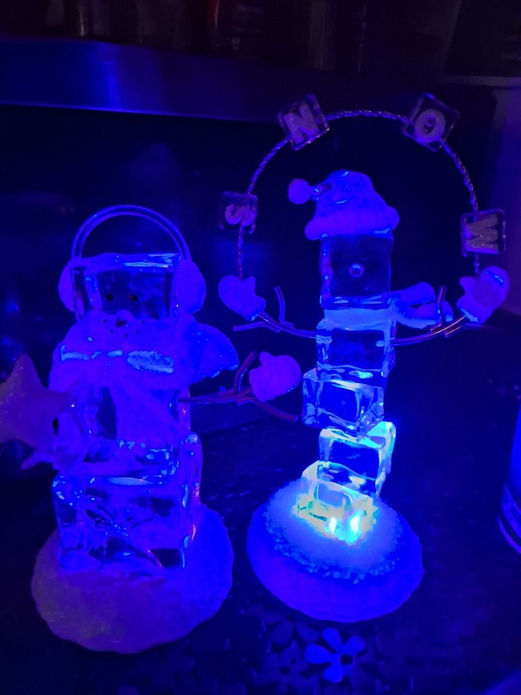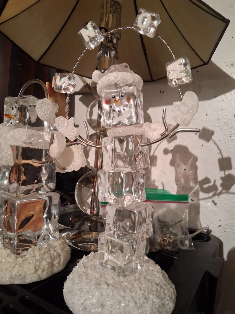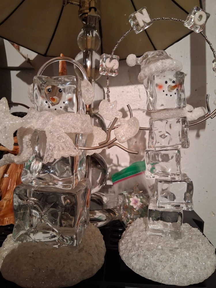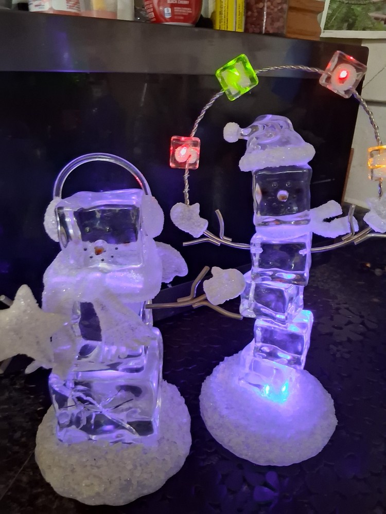The product is a set of two medium-sized acrylic snowmen figurines featuring an enchanted forest pattern, perfect for the Christmas season. Made of glasses and resin with a high gloss finish and glitter details, these snowmen exude a whimsical and magical vibe. Powered by AA batteries, they offer a 3D effect and a textured design, making them a charming addition to any holiday decor collection.these are heavier