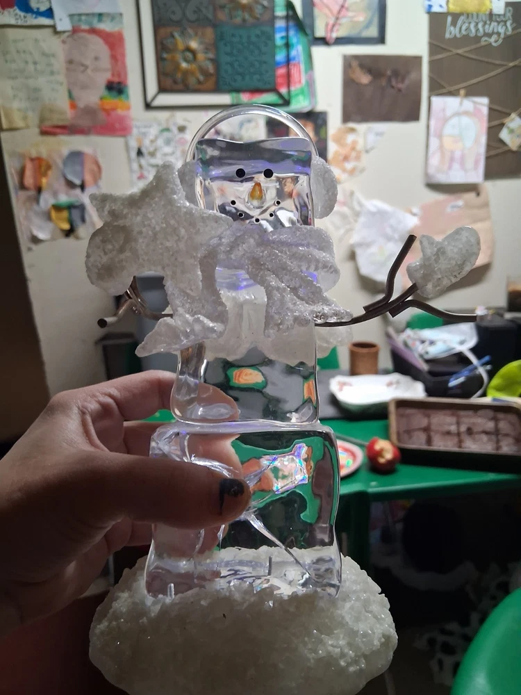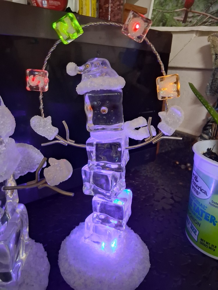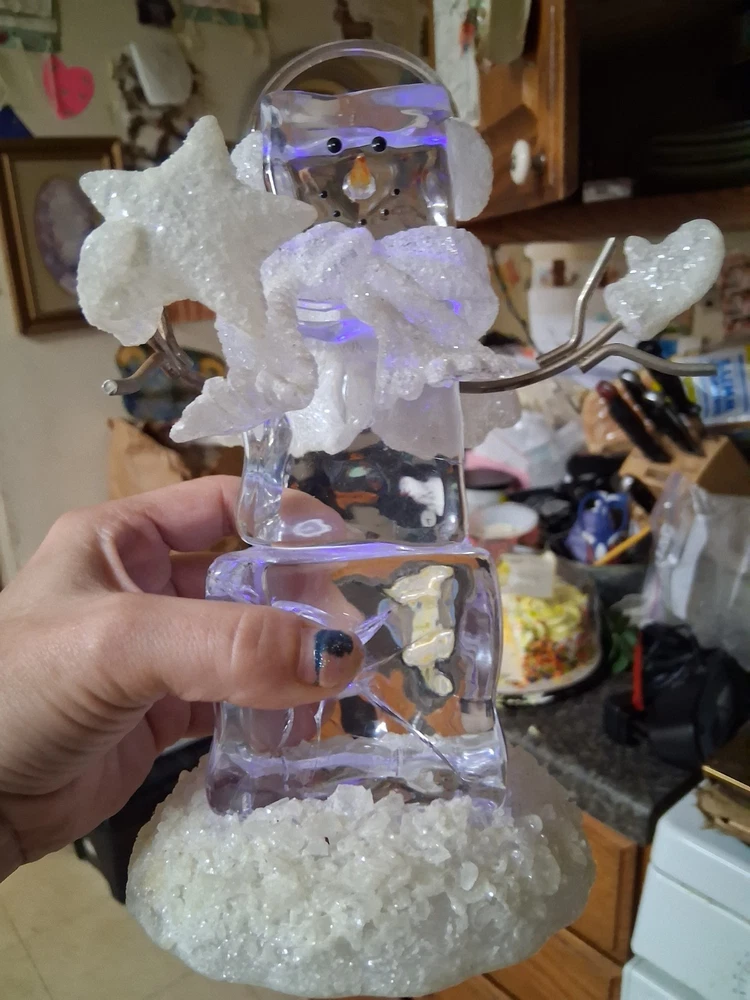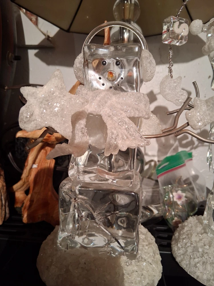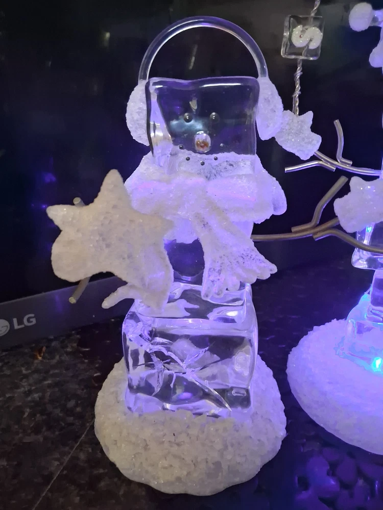 The product is a set of two medium-sized acrylic snowmen figurines featuring an enchanted forest pattern, perfect for the Christmas season. Made of glasses and resin with a high gloss finish and glitter details, these snowmen exude a whimsical and magical vibe. Powered by AA batteries, they offer a 3D effect and a textured design, making them a charming addition to any holiday decor collection.these are heavier