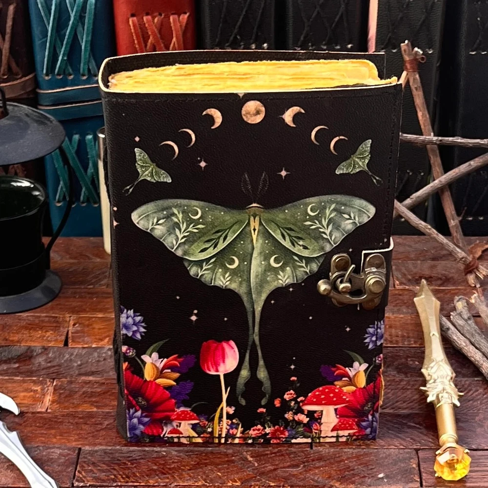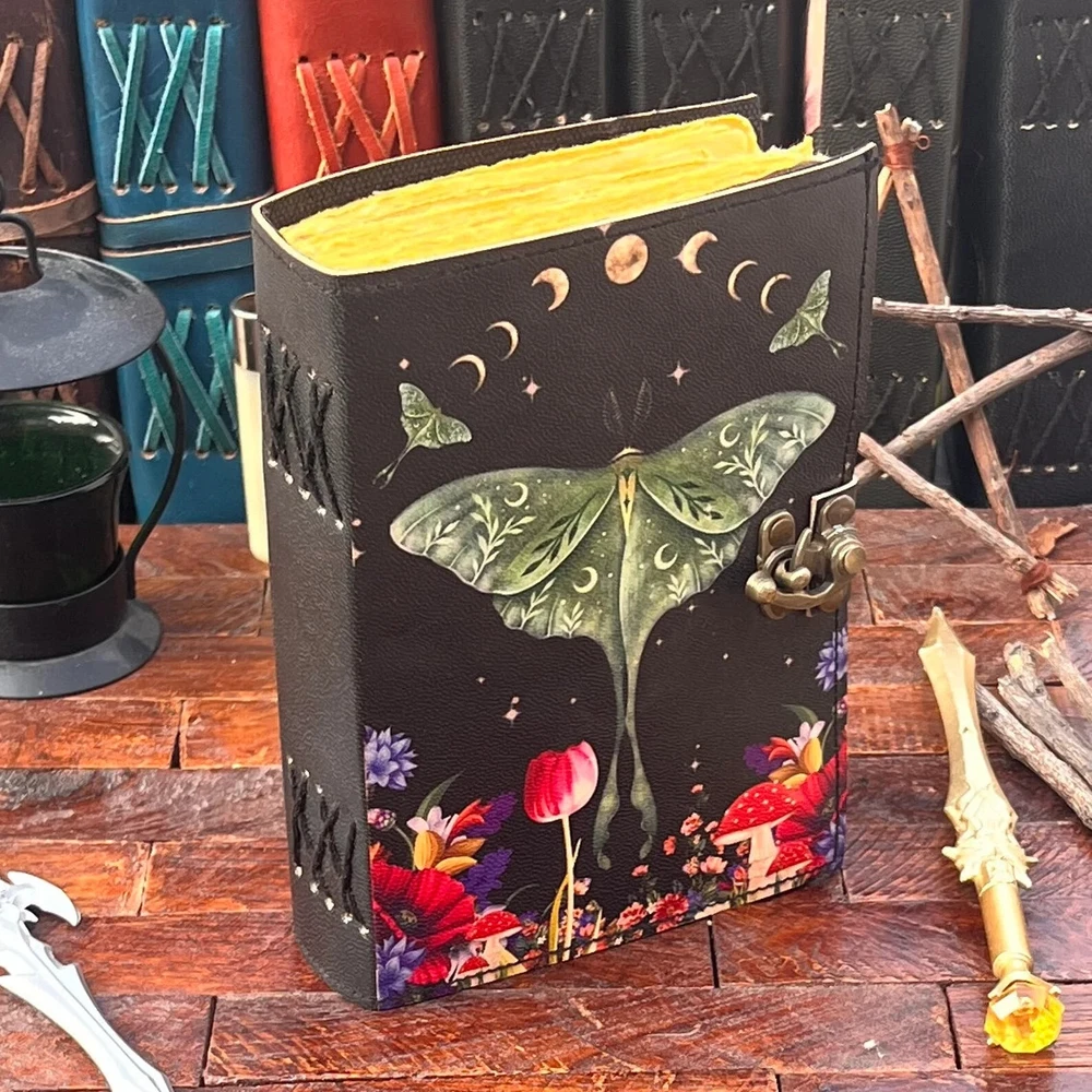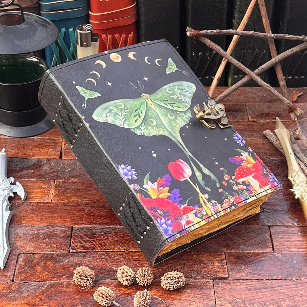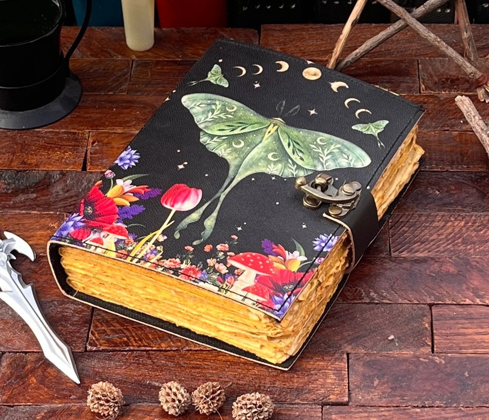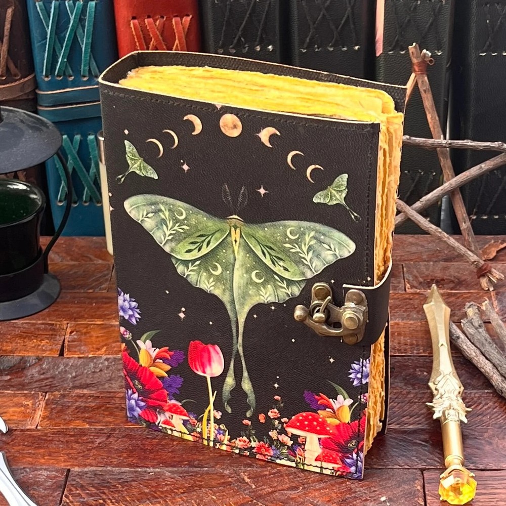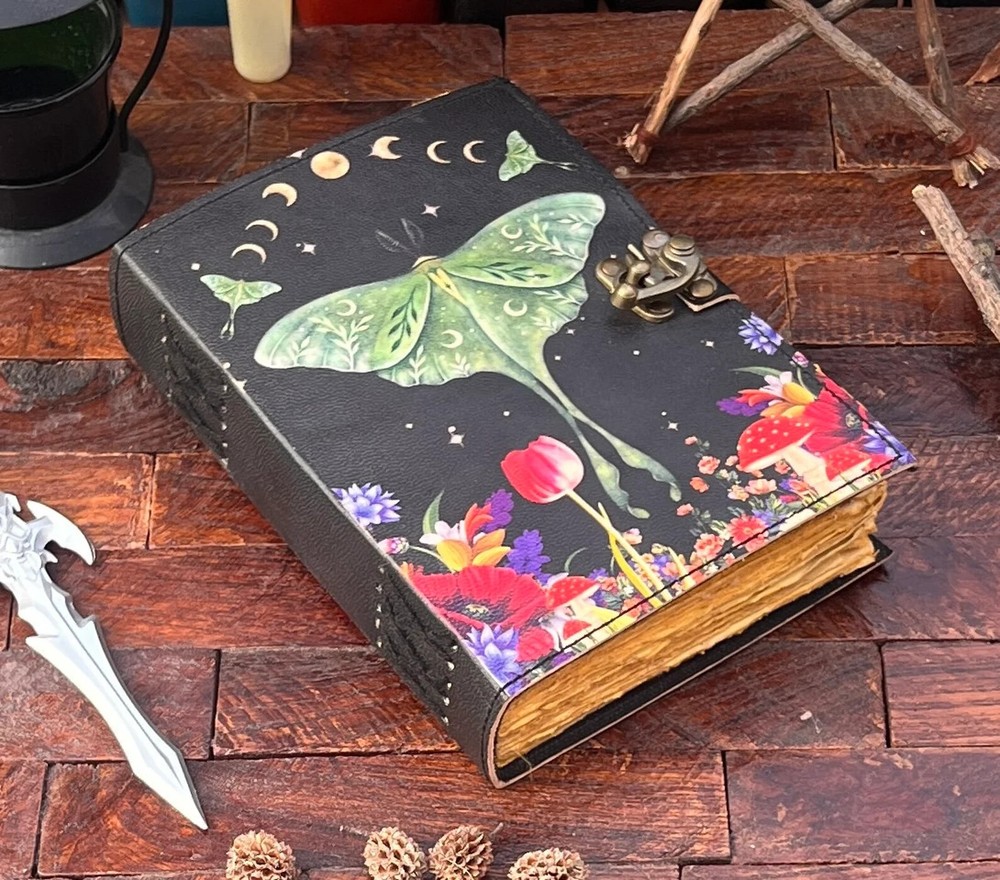 The Enchanting Luna Moth Blank Spell Book Leather Journal is a luxury edition, limited edition, and 1st edition handmade journal featuring 200 deckle-edged pages. The leather cover is personalized and the journal is crafted in India. This beautiful and unique piece offers a mystical and enchanting feel, making it an ideal choice for those seeking a special and magical writing experience. Exquisite Handcrafted Leather Journal - Luna Moth Print - 200 Deckle-Edged Pages - Available in Various Sizes" Unleash your creativity with our Exquisite Handcrafted Leather Journal featuring a captivating Luna Moth Print. This journal is a masterpiece, not just for your ideas but for your senses too. It boasts 200 premium deckle-edged pages that invite your pen to dance across their textured surface. Available in various sizes - 7x5, 8x6, 10x7, and 13x10 - you can choose the perfect canvas for your imagination. The genuine leather cover exudes quality and durability, and it even comes with a one-month warranty. Whether you're gifting it or keeping it for yourself, this journal is designed to inspire and endure. Get ready to embark on a creative journey like no other. Leather Journal Luna Moth Print Handcrafted Notebook Unique Artistic Diary Deckle-Edged Pages Premium Vintage Leather Sketchbook Nature-Inspired Writing Journal Rustic Leather Traveler's Diary Blank Page Personalized Notebook Elegant Luna Moth Design Quality Leather Bound Book Creative Gift Idea Available in 7x5, 8x6, 10x7, and 13x10 sizes