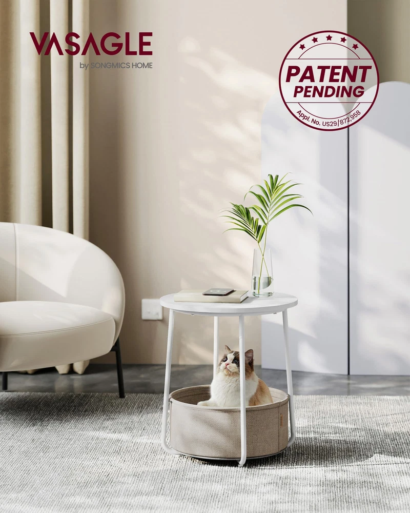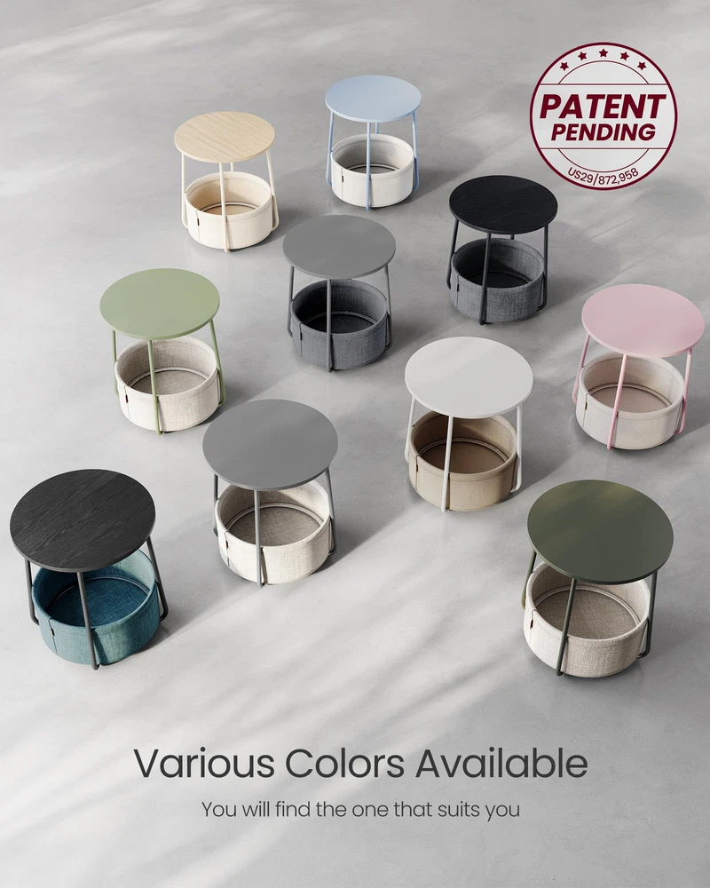 [Quick and Easy to Assemble] Thanks to the simple structure and clear instructions, this side table can be assembled in 5-10 minutes [Delights Small Spaces] The 17.7"Dia. x 19.7"H end table with 15.6"Dia. x 7.2"H basket fits perfectly in small spaces, occupying little space while offering ample storage. You can use it as a side table in the living room or a nightstand in the bedroom [Sturdy and Stable] The sturdy particleboard tabletop is fixed to the frame without wobbling. The one-piece U-shaped steel legs offer solid support. The adjustable feet increase the stability and don't scratch the floor [Quality Fabric Basket] The double-layered polyester fabric basket is visually appealing, crease-free, and free of chemicals, making it safe to use. Its linen-like appearance adds a touch of uniqueness to this round table [Modern and Simple] This simple matte white round coffee table with a camel brown basket will add an extra touch of style to your living room or bedroom and is easy to match with a variety of furniture styles. Design Patent Pending (Appl. No. US29/872,958)
