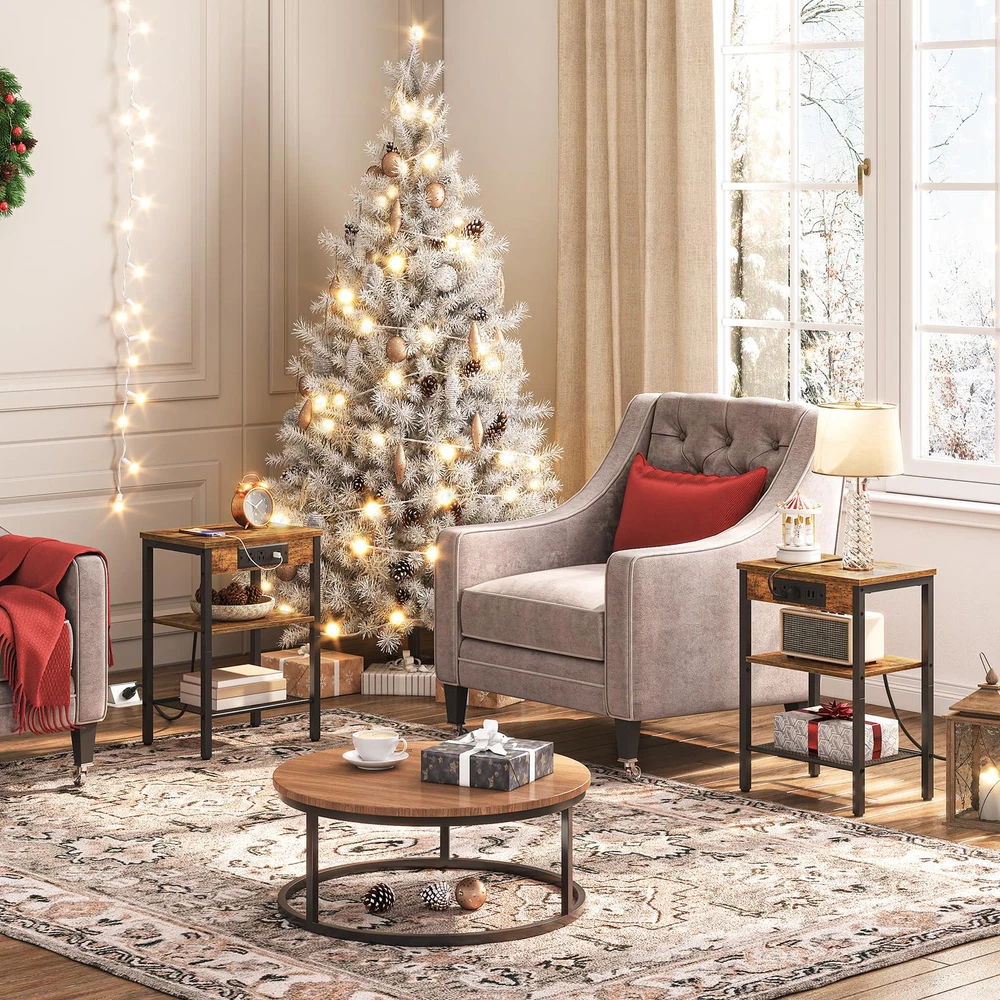 Side Table with Outlets and USB Ports: The charging station includes 2 3-prong AC outlets and 2 USB ports, meeting your needs to charge your phone, desk lamp and laptop freely. 59 inches power cord provides great convenience for daily use Adjustable Shelves for Storage: This 3-tier sofa table with two open and adjustable shelves can be exchanged freely between shelf and mesh rack upon your preferences. Personalized large storage space is convenient for you to put articles, making your room far away from clutter! Multifunctional Use: 15"L x 11"W x 21.7"H in size, this bedside table features space saving and lightweight design in order to move and carry effortlessly. Rustic brown finish and elegant style goes well with your living room, bedroom, balcony, dorm, study and other tight spaces! Firm and Stable: The steadiness of this industrial end table comes with solid matte black metal legs and shelves. 4 adjustable feet support the balance of this side table on uneven ground and protection from scratch on the floor Assembly is a Breeze: Thanks to the explanatory & easy-to-understand instructions and simple structure of the side table, all you need is to follow the specific steps and swing the Allen key supplied. Everything is done in minutes. So don't wait any longer and enjoy it to your home right now