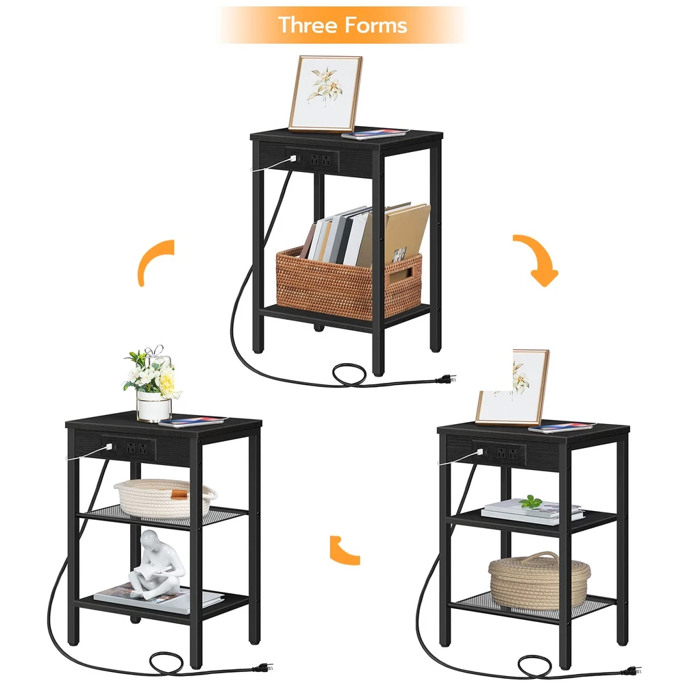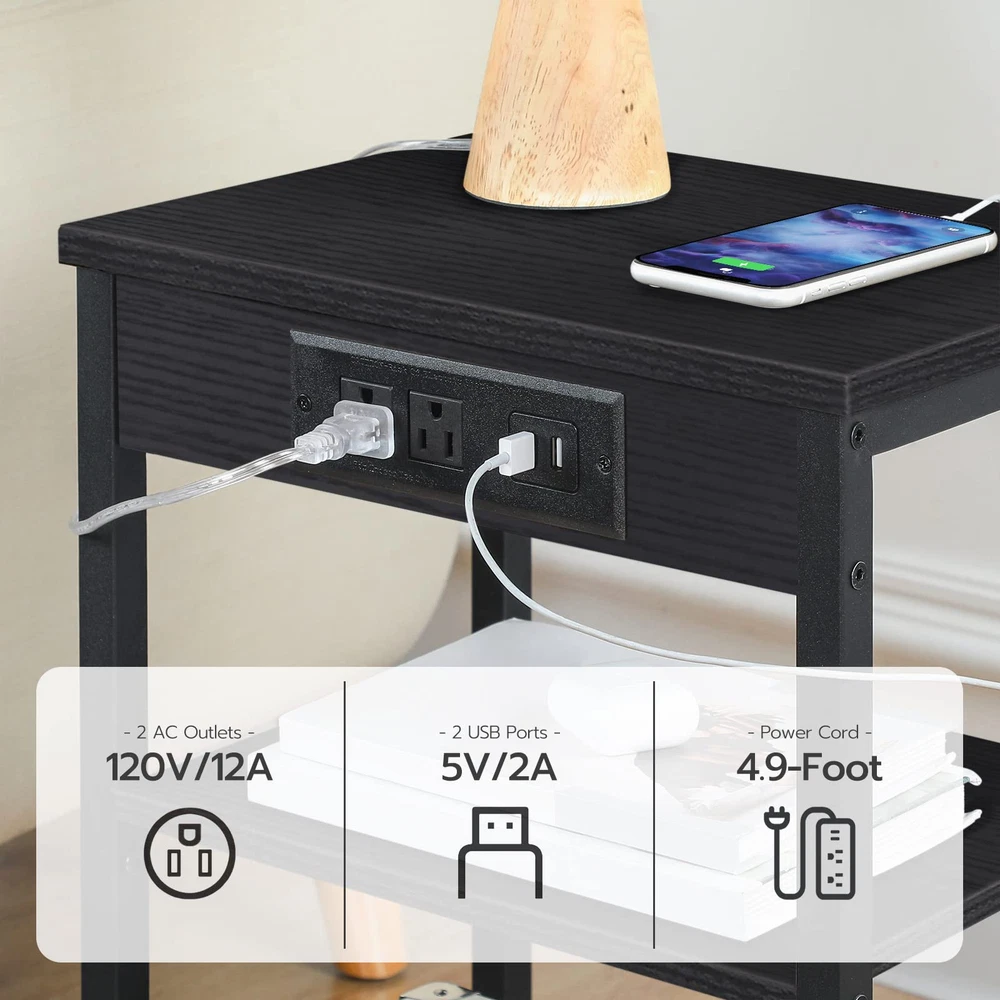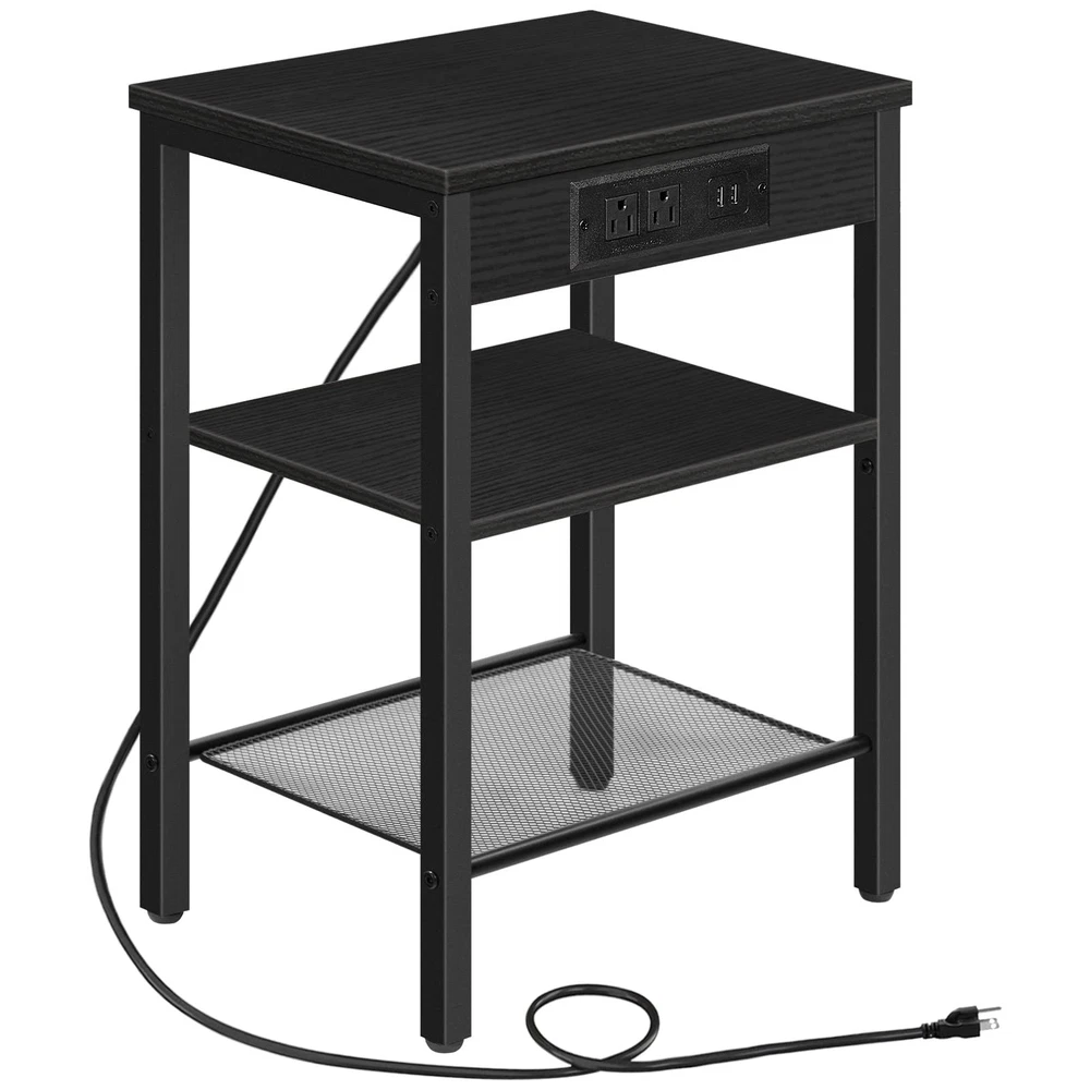 Side Table with Outlets and USB Ports: The charging station includes 2 3-prong AC outlets and 2 USB ports, meeting your needs to charge your , desk lamp and laptop freely. 59" power cord helps you move the tea table easily Adjustable Shelves for Storage: This 3-tier sofa table with two open and adjustable shelves can be exchanged freely between shelf and mesh rack upon your preferences. Personalized large storage space is convenient for you to put articles, making your room far away from clutter! Multifunctional Use: 15"L x 11"W x 21.7"H in size, this bedside table features space saving and lightweight design in order to move and carry effortlessly. Black finish and elegant style goes well with your living room, bedroom, balcony, dorm, study and other tight spaces! Firm and Stable: The steadiness of this industrial end table comes with solid matte black metal legs and shelves. 4 adjustable feet support the balance of this side table on uneven ground and protection from scratch on the floor Assembly is a Breeze: Thanks to the explanatory & easy-to-understand instructions and simple structure of the side table, all you need is to follow the specific steps and swing the Allen key supplied. Everything is done in minutes. So don't wait any longer and enjoy it to your home right now