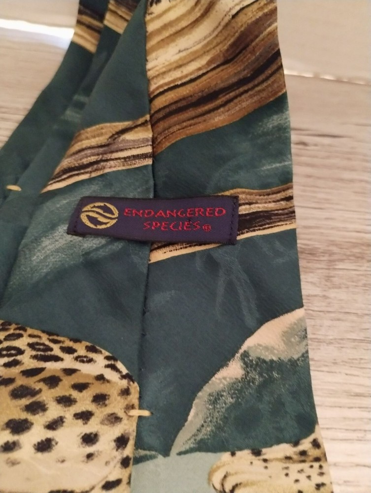 This high-quality silk tie by Endangered Species showcases a detailed leopard design in earthy tones. Crafted in the USA, it offers a distinctive wildlife-inspired style for professionals or collectors. The luxurious silk material exudes elegance for formal or semi-formal attire. • Made from 100% silk • Features a vibrant leopard wildlife design • 56 inches long for a versatile fit • Crafted in the USA for premium quality • Unique green and brown color scheme No visible flaws or damage. Top to bottom = 56 inches. Size: Mens 56 Condition: Pre-Owned