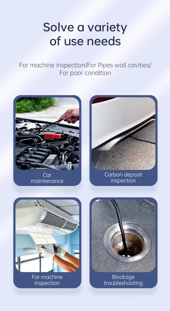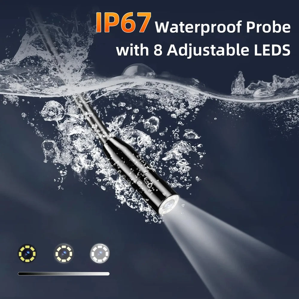 Feature: -Power on and play -Type-C charging interface -4.3 inche screen. -Both front camera and the side camera are up to 1080P resolution -IP67 waterproof camera. -Build-in 2000mAh battery for 3-5 hours working time. -Rigid cable can easily shape what you need. -Equipped with adequate accessories, Hook, Magnet, which can adapt to a variety of environments. Specification: Color: Orange Pixel: 2MP Monitor: 4.3-inch color IPS display Depth of field:2-10cm Camera waterproof: IP67 Viewing Angle:70° Temperature:-10℃-50℃ Battery capacity:2000mAh/3.5h Charge port: Type-C Line length:1/5m Light: 8 adjustable brightness LEDs Certification:CE/RoHS/ISO9001 Package includes: 1X inspection camera 1X charging cable 1X packing box 1X instruction manual 1X hook + magnet + side view mirror 2.7cm short lens is suitable for narrow pipe inspection 1080p HD pixels High definition pixels allow you to see details clearly Long-lasting Battery Life The 2000mAh capacity battery enables the endoscope camera with light to be charged for 2-3 hours and can be used for 2-5 hours. In addition, the convenient USB charging method is adopted to bid farewell to the trouble of difficult charging Waterproof Inspection Camera The endoscope has excellent waterproof performance and can be used in pools, pipes and rainwater, even in bad weather and humid environment, the endoscope can easily do the job. Wide Range Of Application Inspection camera do not require WIFI, mobile phones and APPs, and are ideal assistants for your industrial work. The plumbing camera that perfectly combines convenience, beauty, practicality, waterproof and other properties can make your work easier.Drain pipe cameras can be widely used for mechanical inspection,auto repair, plumbing, housework, wall, chimney or air conditioning maintenance.