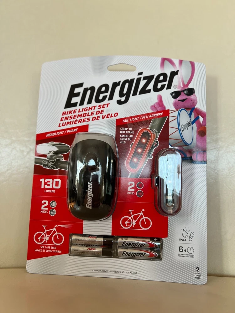 Energizer Bike Light Set, new in package. Includes headlight and tail light and 4 AAA Batteries. See and be seen while riding your bike in low visibility areas.
