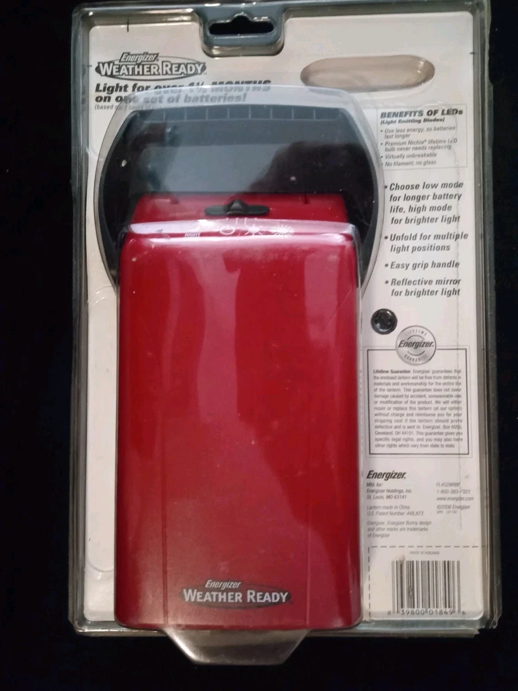 Illuminate your space with the Energizer LED Folding Lantern, Model FL452WRBP. Designed for versatility, this lantern features a durable plastic construction and operates on four D batteries (not included) to provide up to 135 hours of bright, efficient lighting. With a pivoting design, the light easily adjusts to provide 360º coverage, making it ideal for camping trips or power outages. The lantern offers three light modes and eight LEDs, delivering a range of 80-96 lumens to suit your needs. Its compact size, measuring 8 inches in height and 5 inches in width. Experience reliable, high-quality illumination with this weather-ready Energizer lantern, complete with a vibrant red color and cordless convenience. Blister case has very minor cracks in bottom corners,blister is unopened free shipping