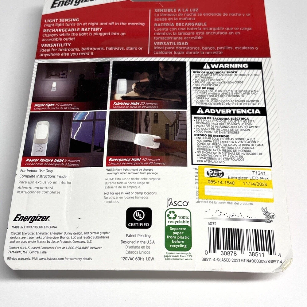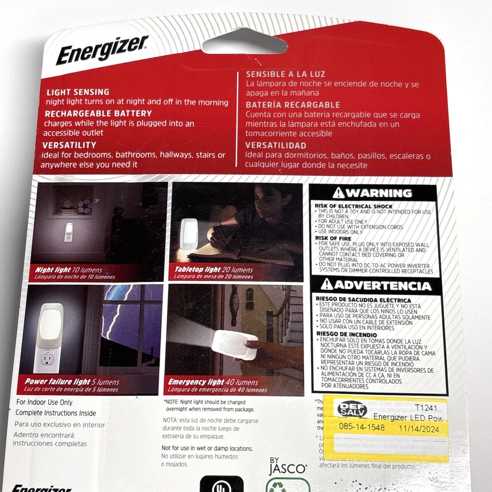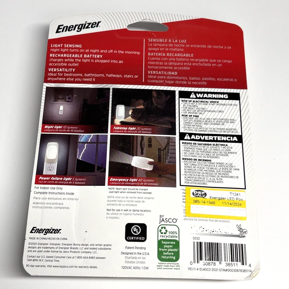 Color: White Installation Area: Indoor Room: any UPC: 030878385114 Brand: Energizer Power Source: Wall Plug-In MPN: Does not apply Features: Rechargeable gtin13: 030878385114 Light Color: Clear White Lighting Technology: LED Type: Night Light Theme: Home & Garden Model: Energizer 4-in-1 Sensor Type: Light