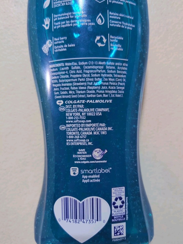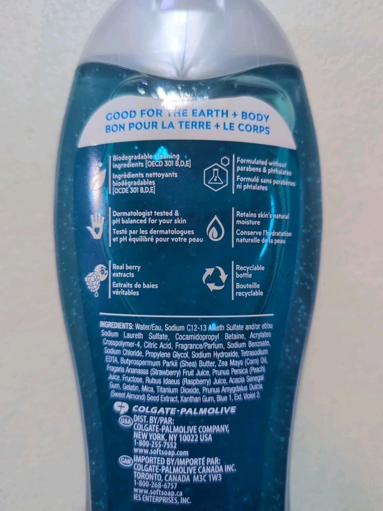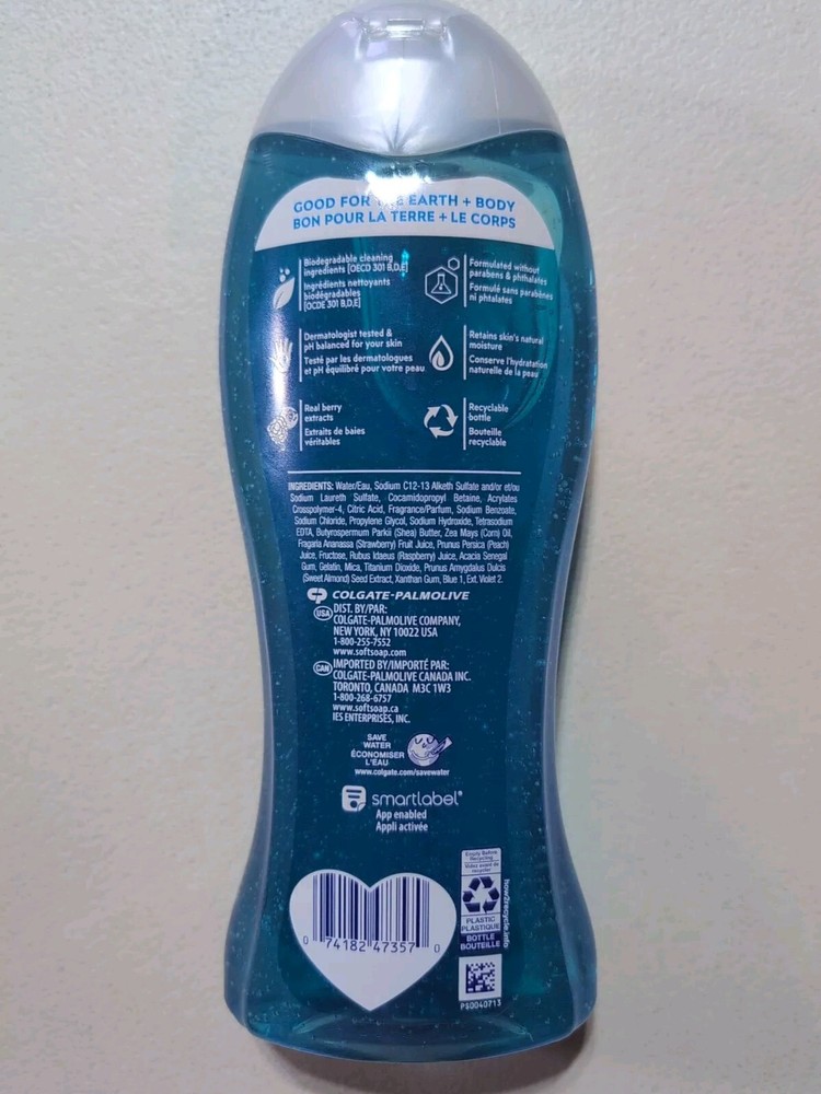 Department:WomenBrand:SoftsoapFormulation:Liquidgtin13:074182473570Type:Body WashColor:BlueIngredients:see pictures for complete detailCountry/Region of Manufacture:CanadaMPN:47357Scent:citrus & Berry splashSkin Type:Combination SkinProduct Line:softsoapFeatures:biodegradable cleaning ingredients, dermatologist tested and pH balanced for your skin, Real berry extracts, formulated without parabens and Phthalates, retains skins natural moisture, recyclable bottleUPC:074182473570Size:RegularBody Area:BodyVolume:20oz.